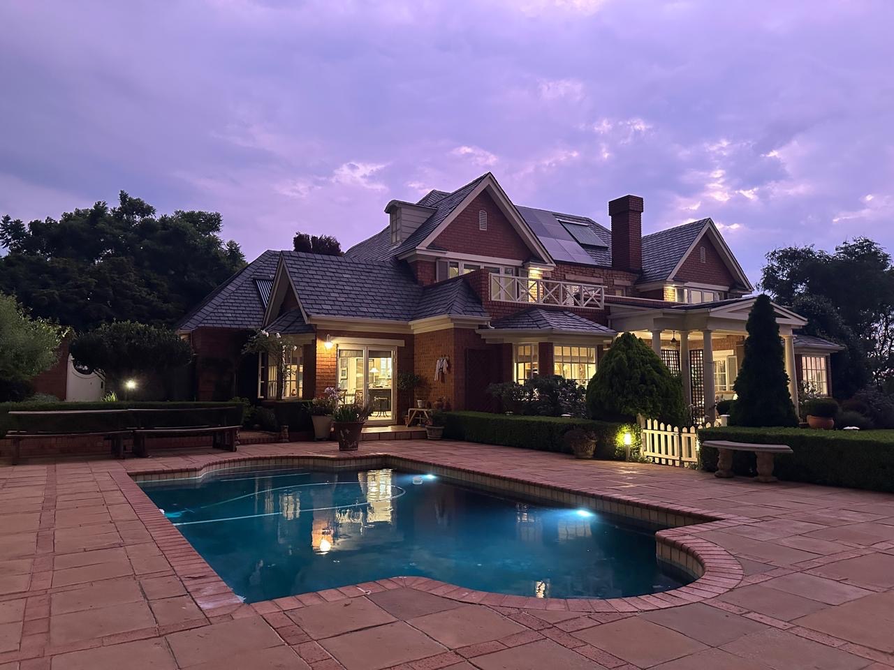 Beyond the interiors, the estate's allure continues with its meticulously landscaped garden, providing a verdant oasis for relaxation and recreation. A sparkling swimming heated pool beckons on warm South African days, while a spacious patio offers an idyllic setting for al fresco dining and entertaining. The property is well-equipped for vehicles, featuring three secure garages and an additional two parking spaces, ensuring ample accommodation for residents and visitors. A versatile flatlet provides flexible living options, ideal for extended family, guests, or as a private home office. Pets are warmly welcomed, allowing furry companions to enjoy this expansive estate living.