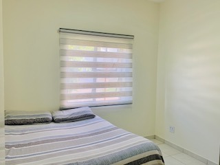 This apartment offers two comfortable bedrooms, each designed with neutral tones and modern blinds. The main bedroom benefits from an en-suite bathroom, providing privacy and convenience. A second well-appointed bathroom serves the additional bedroom and guests. Both bedrooms feature tiled floors and ample natural light.