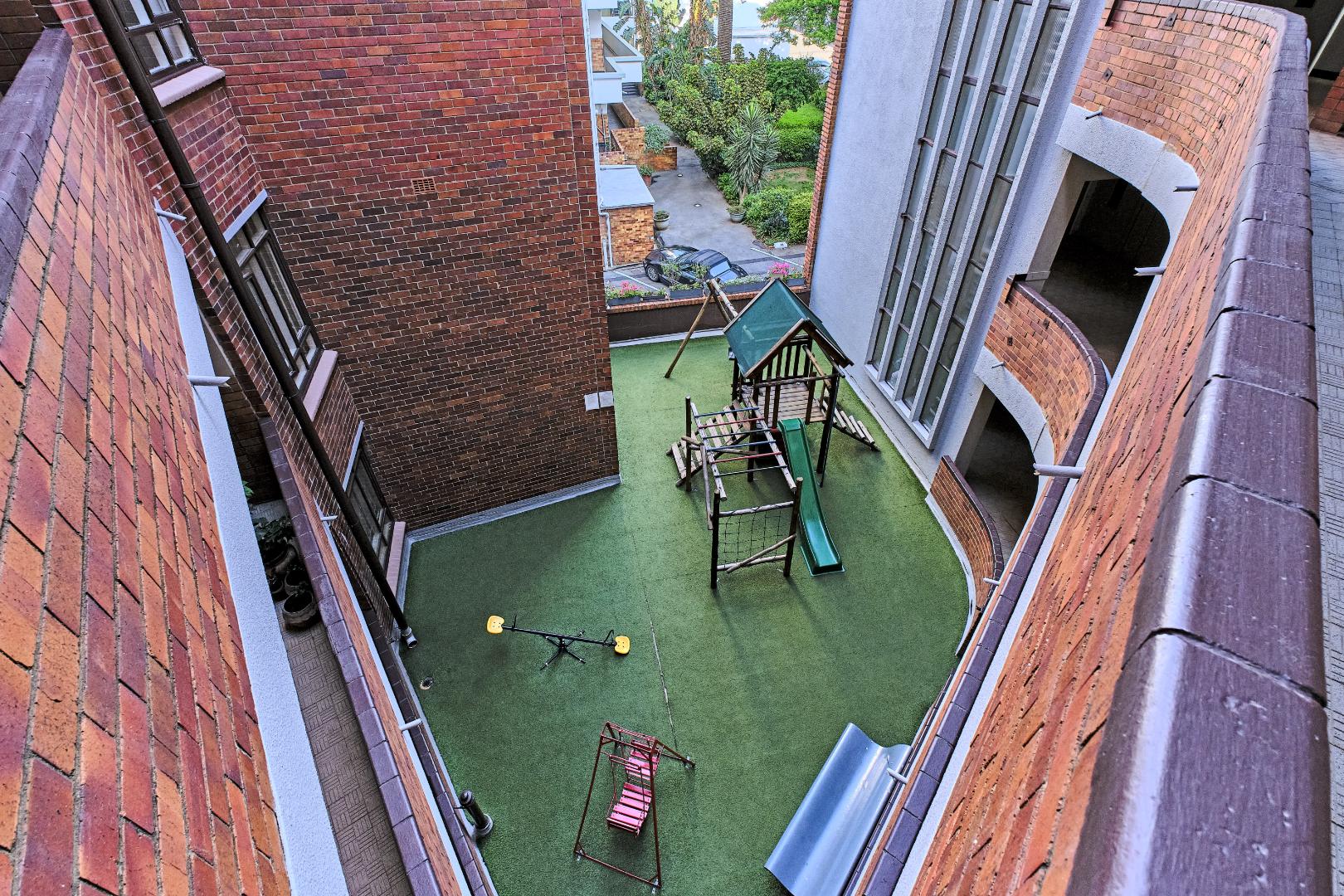 Residents benefit from a range of lifestyle features, including a private balcony that offers views over a lush communal garden, complete with mature palm trees and a dedicated children's play area. This pet-friendly complex (cats only) ensures a welcoming environment for all family members. Parking is well-catered for with one garage and an additional two parking spaces, a significant advantage in a metropolitan setting. The property is part of a security complex, offering peace of mind with features such as a security post, electric fencing, 24-hour security, burglar bars, and a security gate.