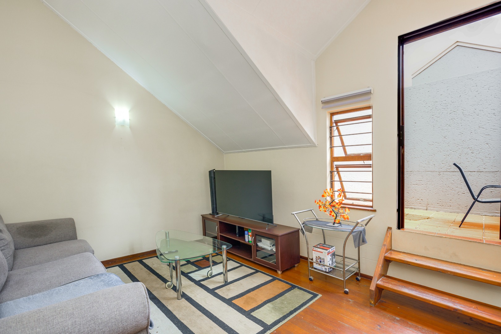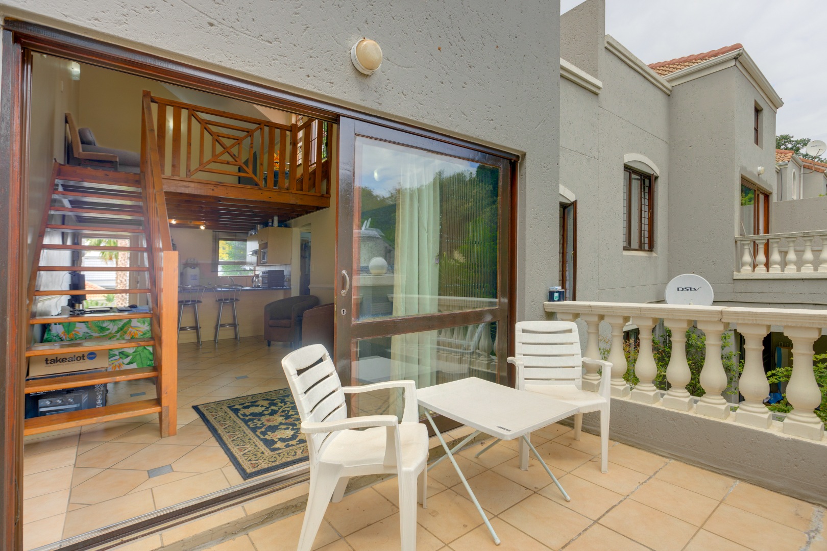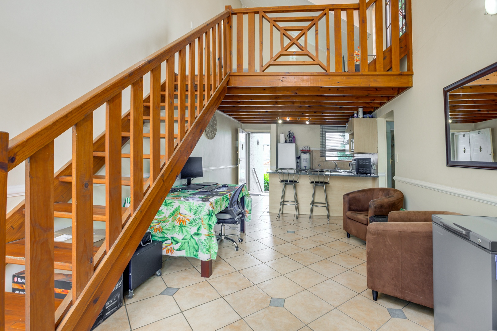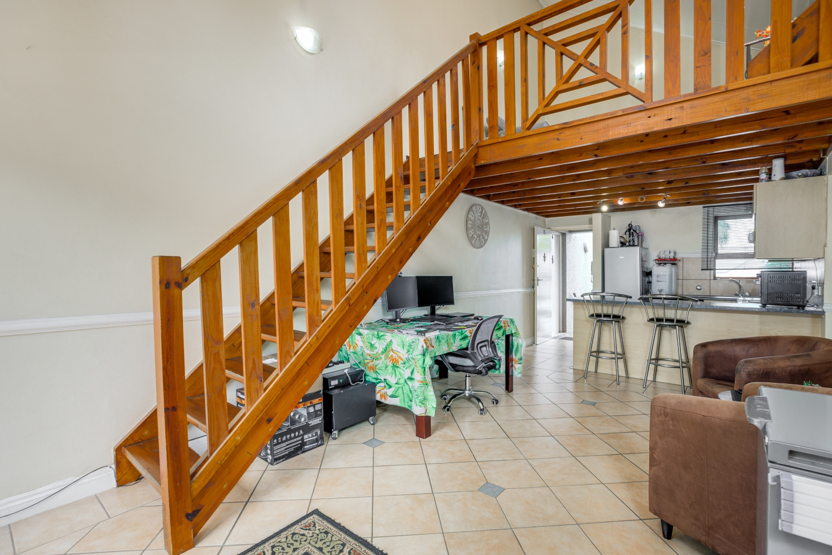 The home features a beautifully appointed open-plan kitchen that flows effortlessly into the sun-filled lounge and dining area, creating a welcoming space for everyday living. A sliding door leads to a private balcony, perfect for enjoying your morning coffee or quiet moments outdoors. A wooden stairway ascends to the upper loft lounge, an additional living area ideal for a home office or entertainment space, which in turn opens onto a generously sized private terrace—perfect for relaxing or hosting guests.