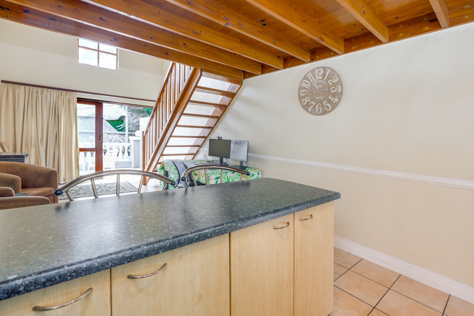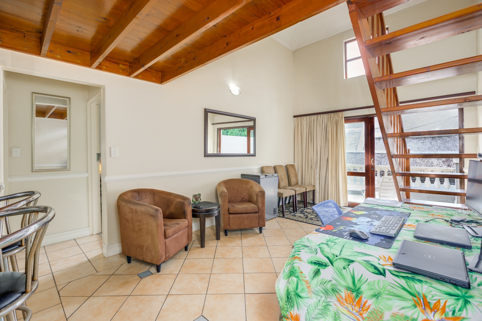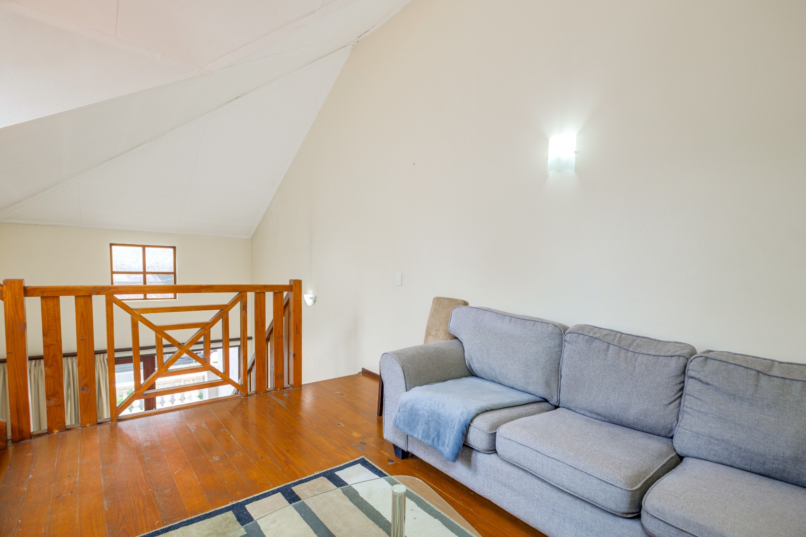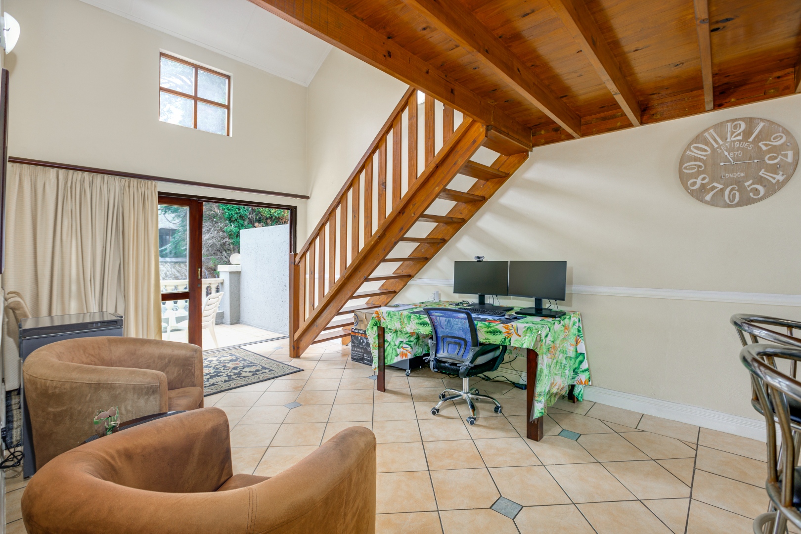 The home features a beautifully appointed open-plan kitchen that flows effortlessly into the sun-filled lounge and dining area, creating a welcoming space for everyday living. A sliding door leads to a private balcony, perfect for enjoying your morning coffee or quiet moments outdoors. A wooden stairway ascends to the upper loft lounge, an additional living area ideal for a home office or entertainment space, which in turn opens onto a generously sized private terrace—perfect for relaxing or hosting guests.