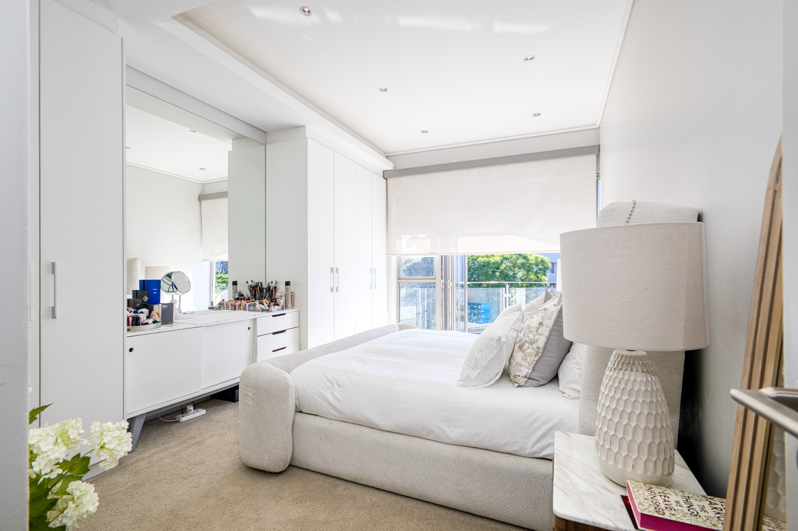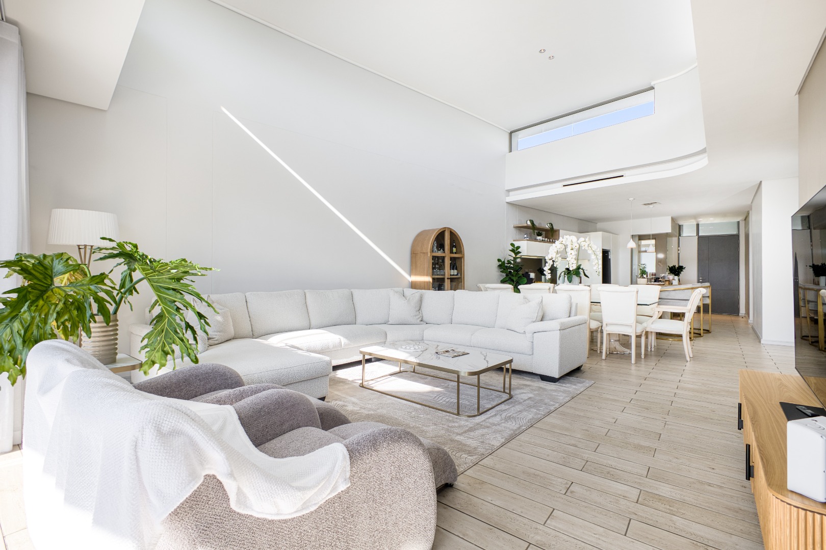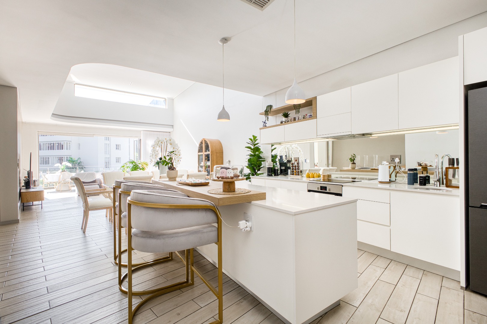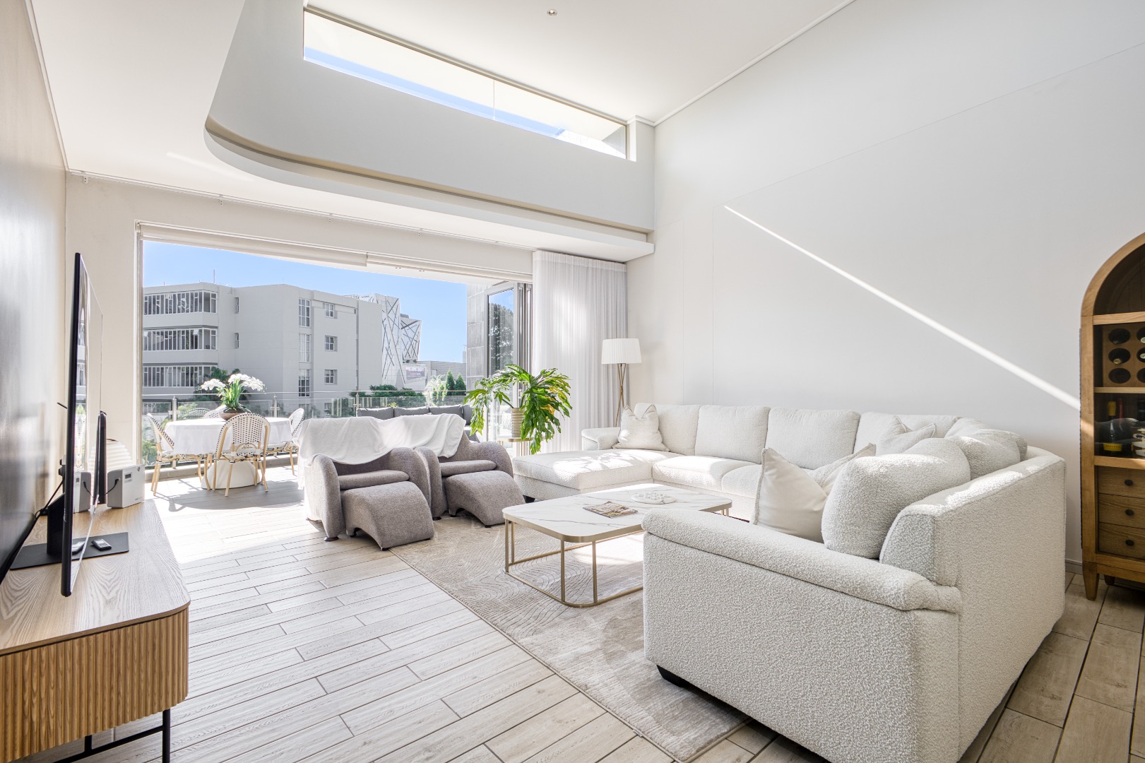 The spacious open-plan lounge and dining area is fully tiled and enhanced by a striking double-volume ceiling, adding a sense of grandeur and openness. Elegant stackable doors open seamlessly onto a generous balcony, offering crisp, elevated views and the perfect setting for relaxation or entertaining.