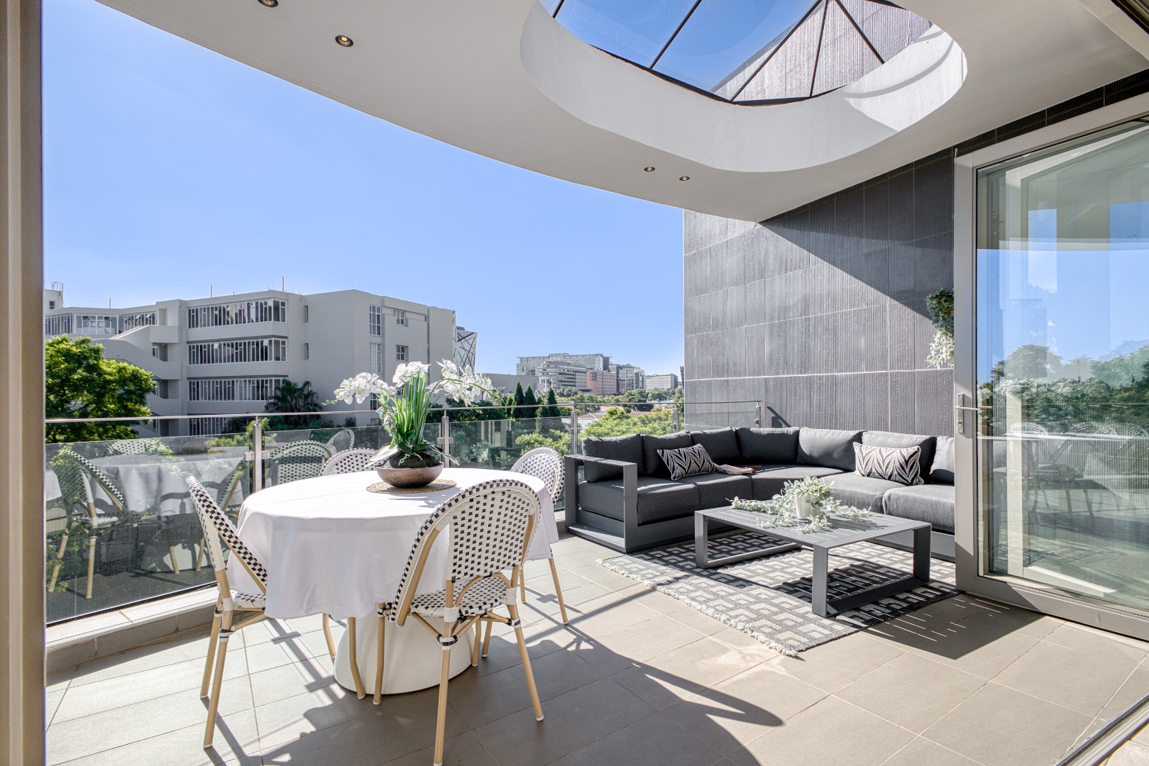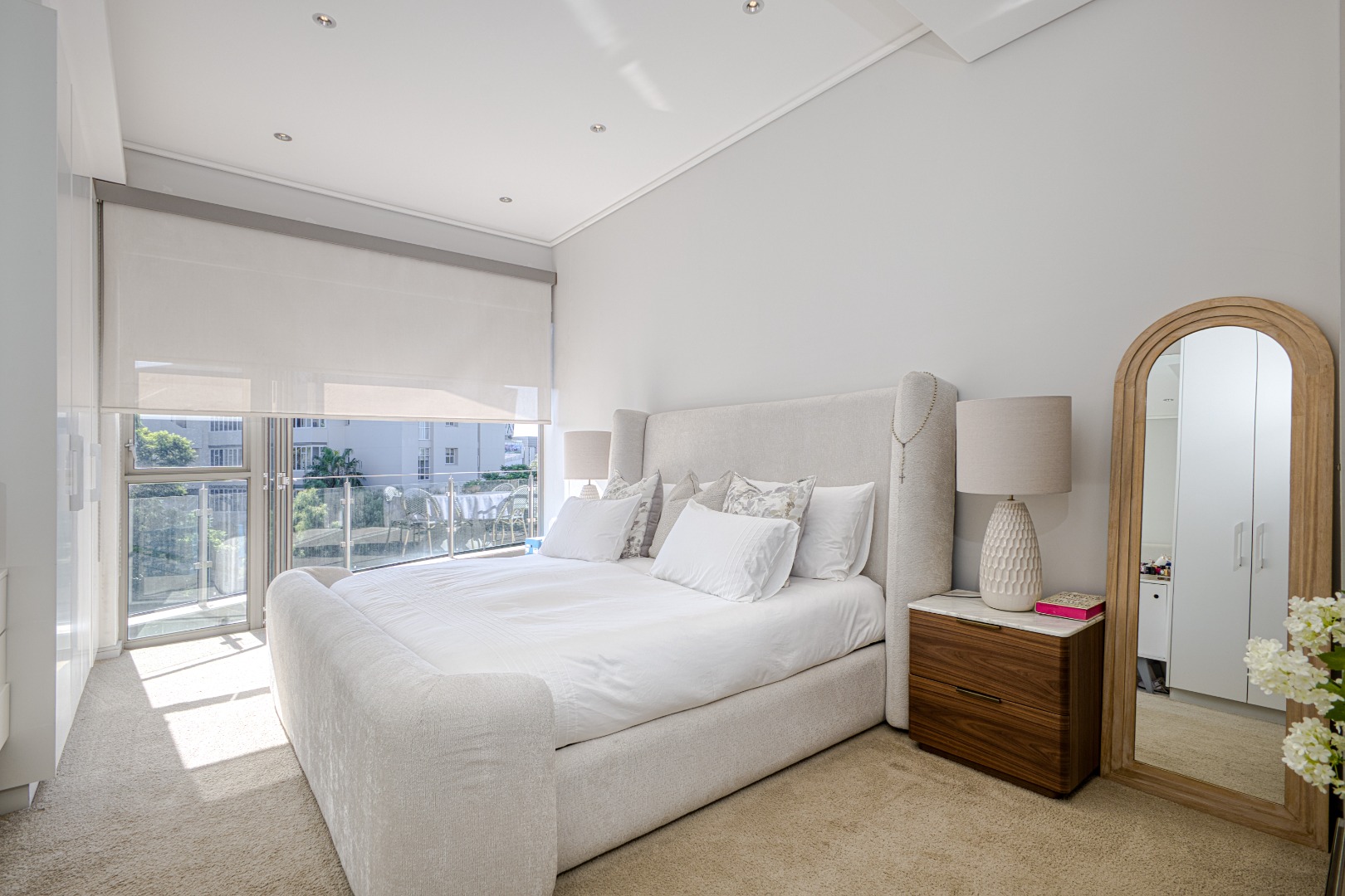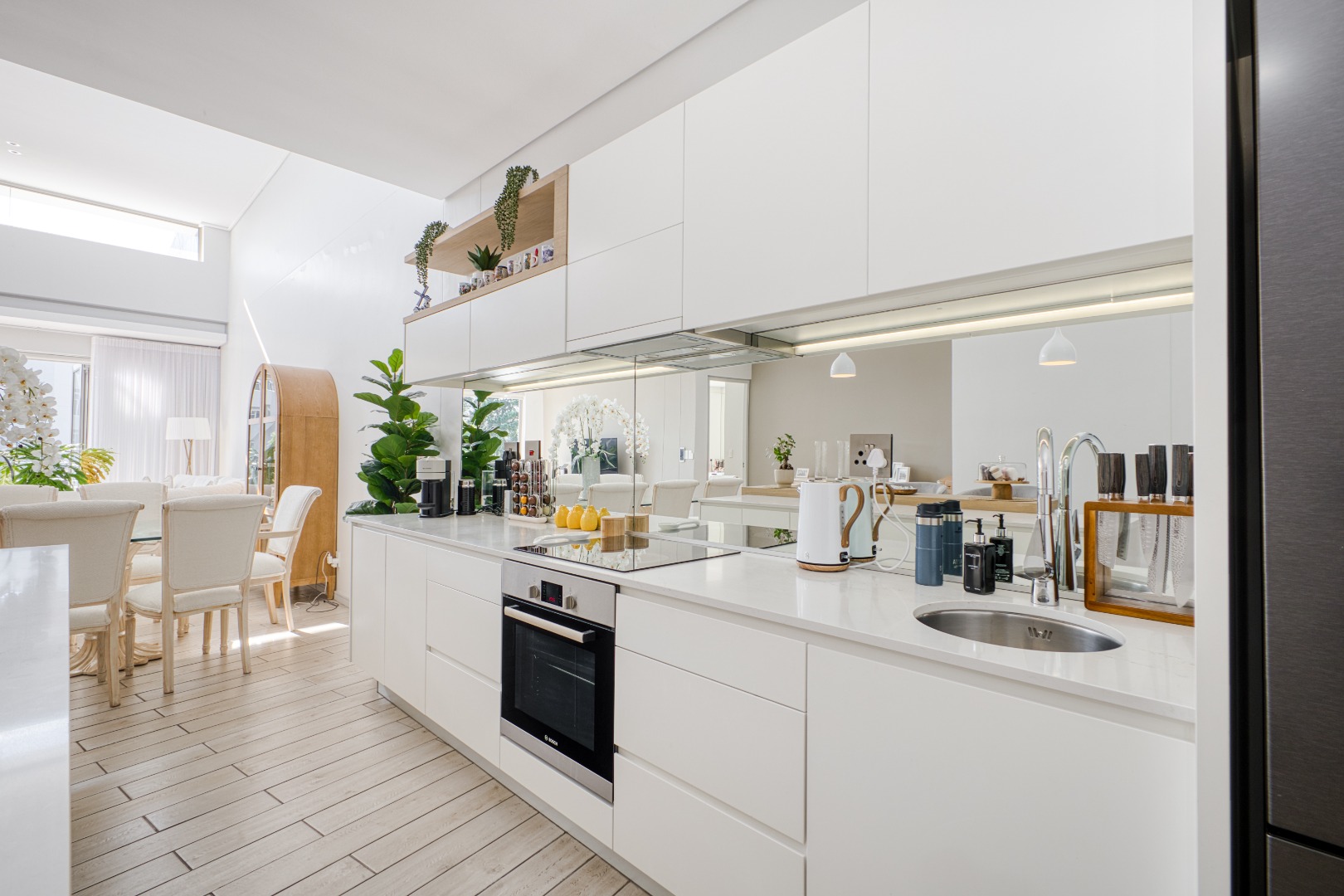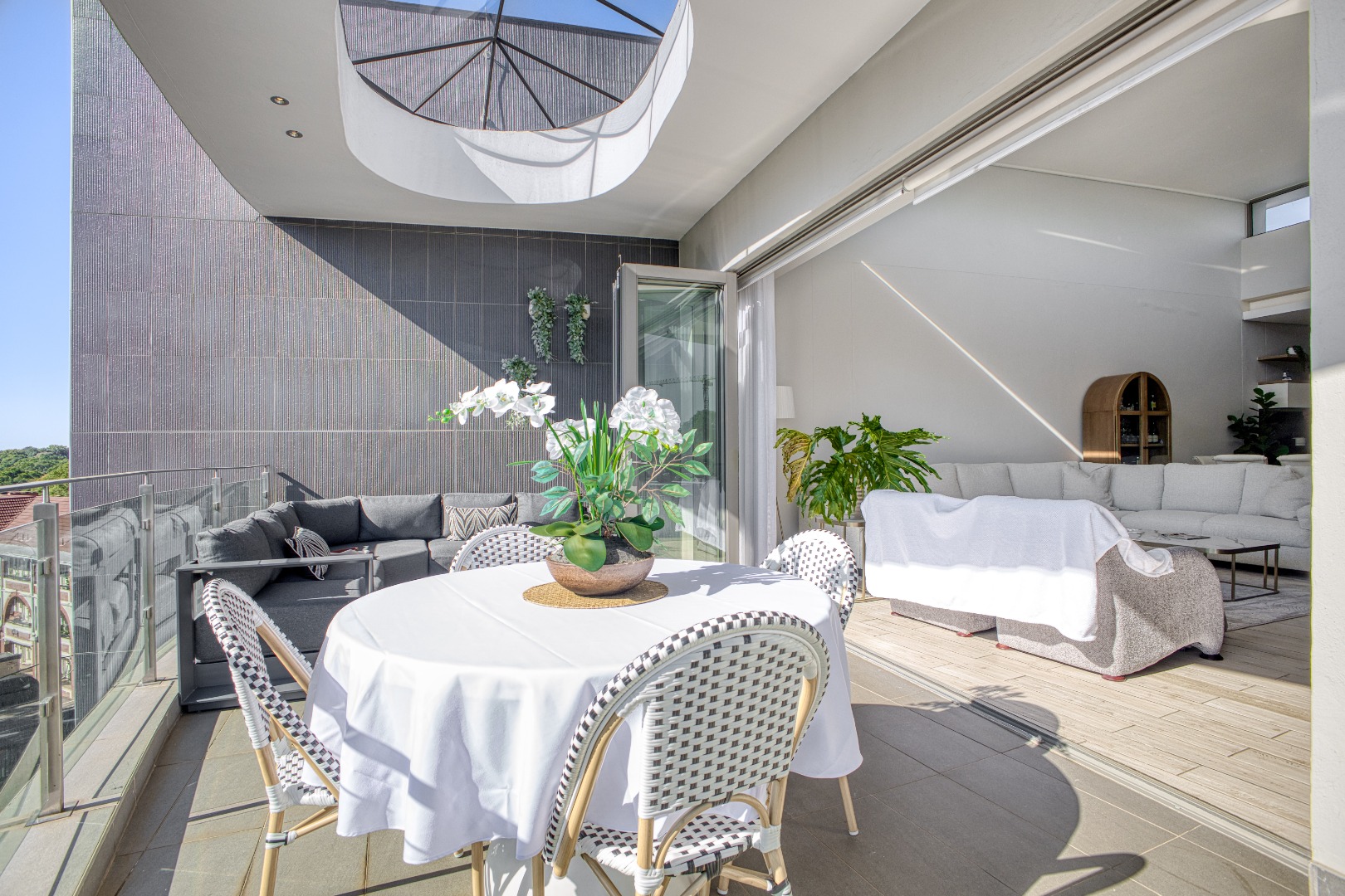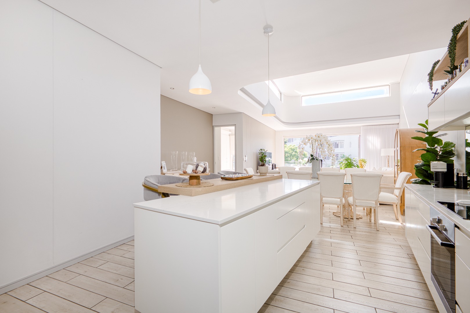 The spacious open-plan lounge and dining area is fully tiled and enhanced by a striking double-volume ceiling, adding a sense of grandeur and openness. Elegant stackable doors open seamlessly onto a generous balcony, offering crisp, elevated views and the perfect setting for relaxation or entertaining.