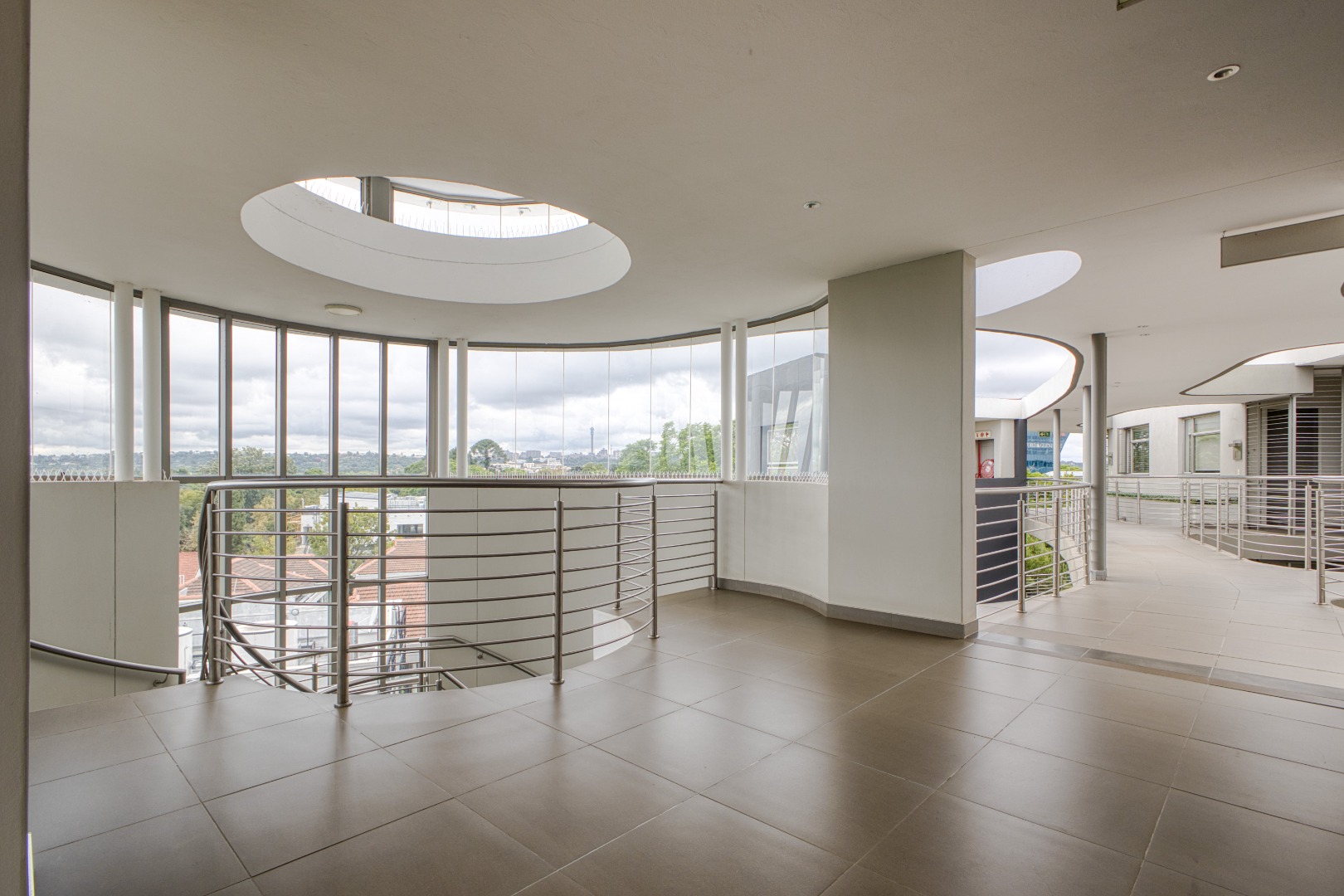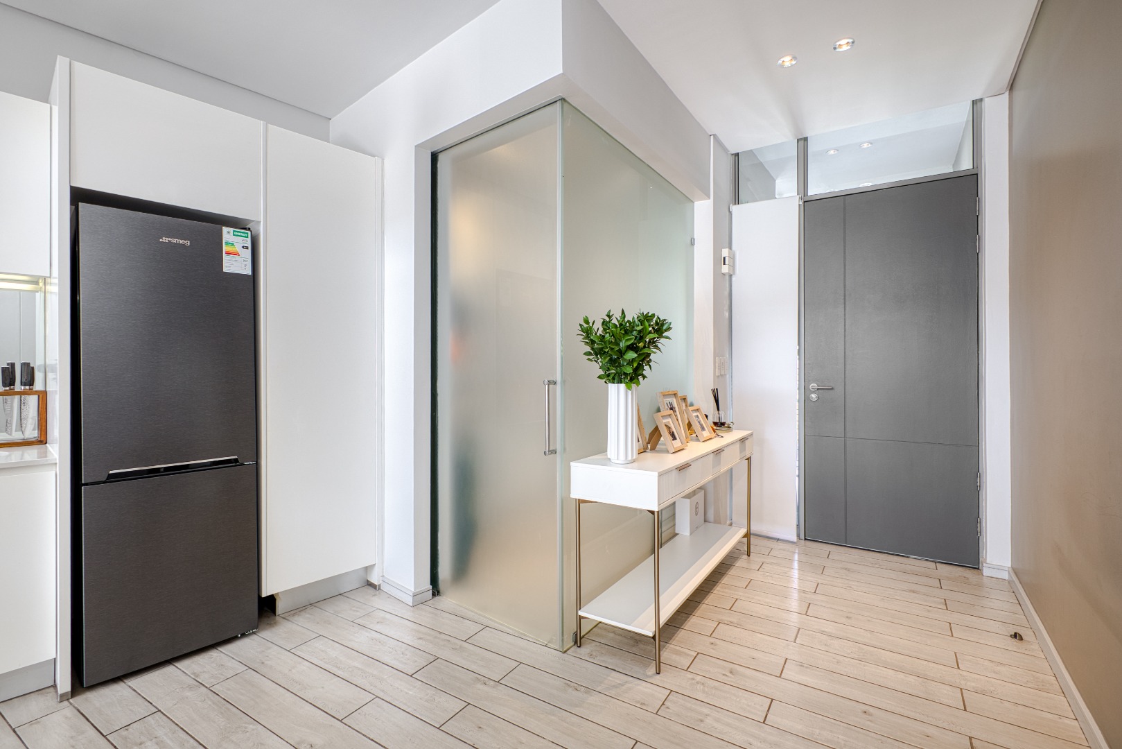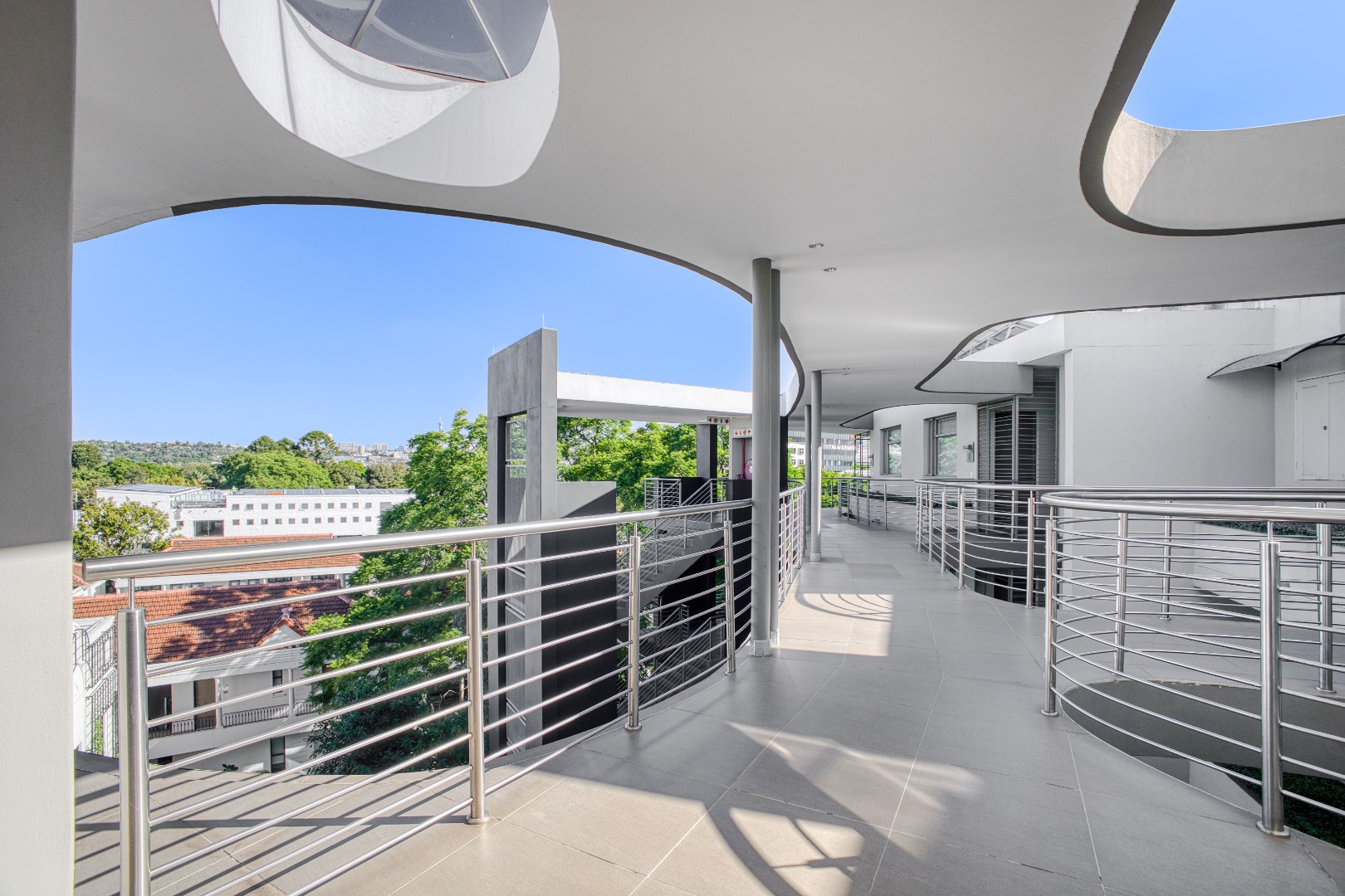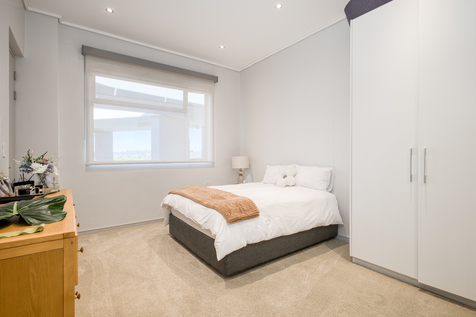 The spacious open-plan lounge and dining area is fully tiled and enhanced by a striking double-volume ceiling, adding a sense of grandeur and openness. Elegant stackable doors open seamlessly onto a generous balcony, offering crisp, elevated views and the perfect setting for relaxation or entertaining.