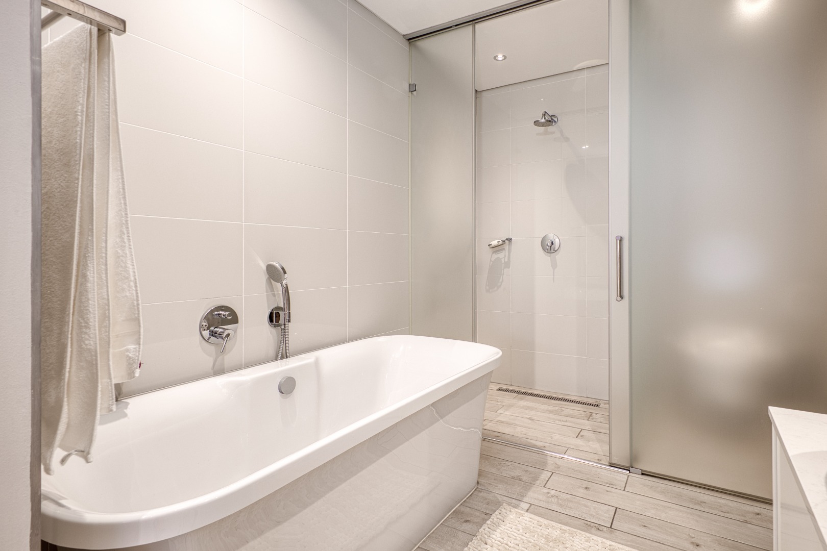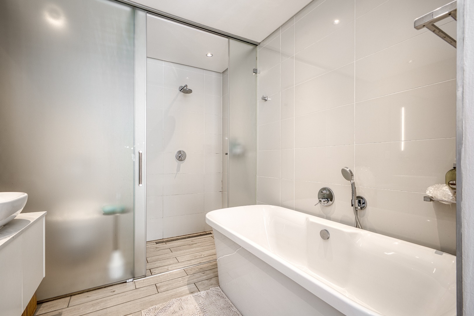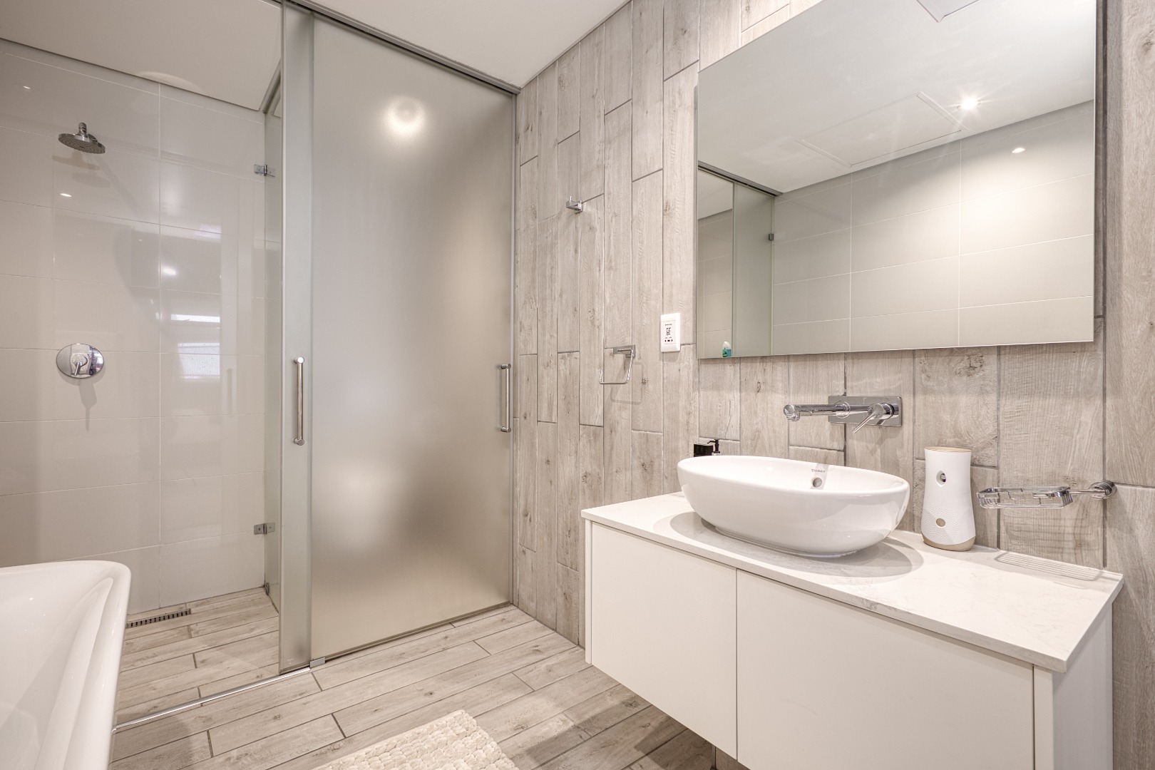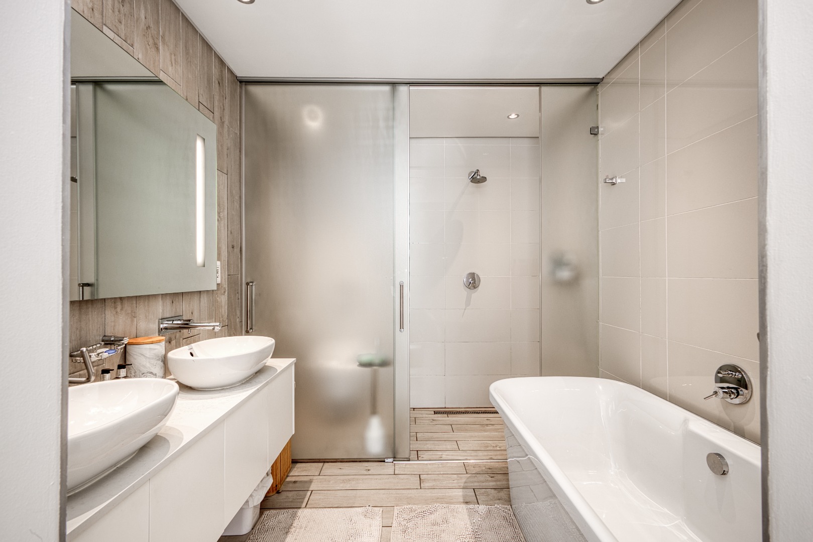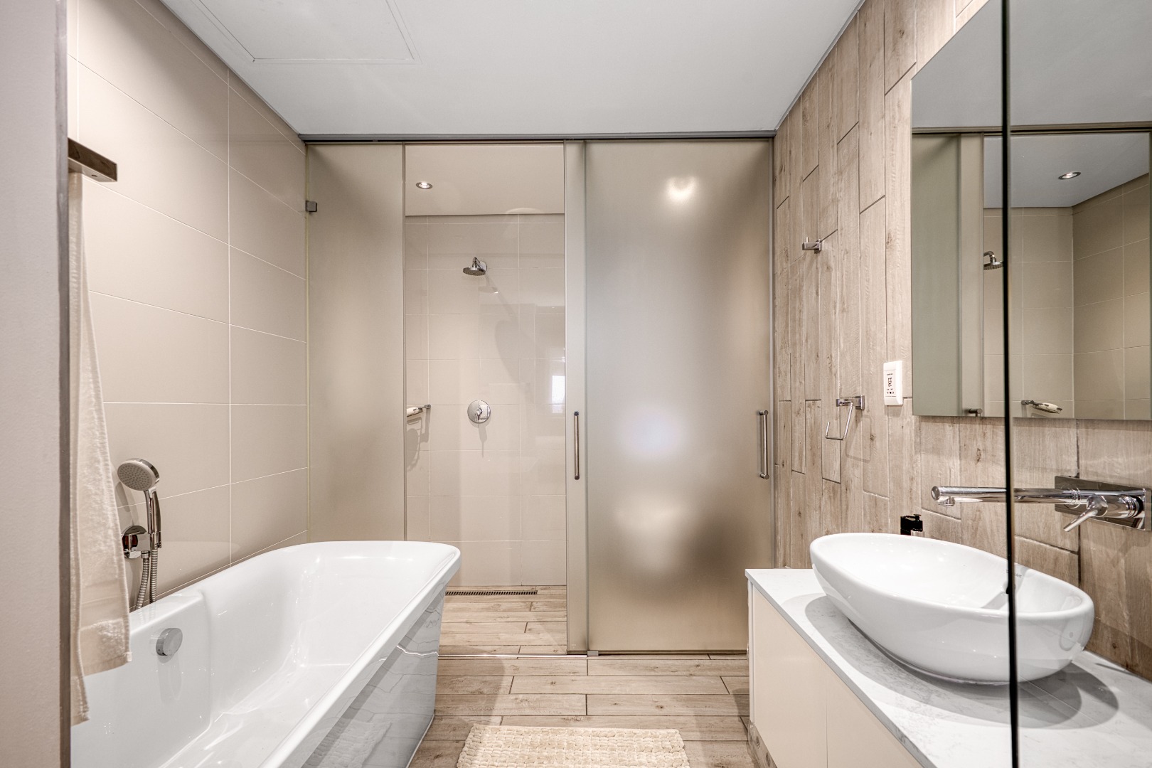 Both bedrooms are beautifully appointed and en-suite, each with a full bathroom featuring sleek sliding glazed doors and surrounding glass panels that create a bright, modern feel. The main bedroom enjoys direct access to the balcony through stylish stackable doors, allowing for effortless indoor-outdoor living.