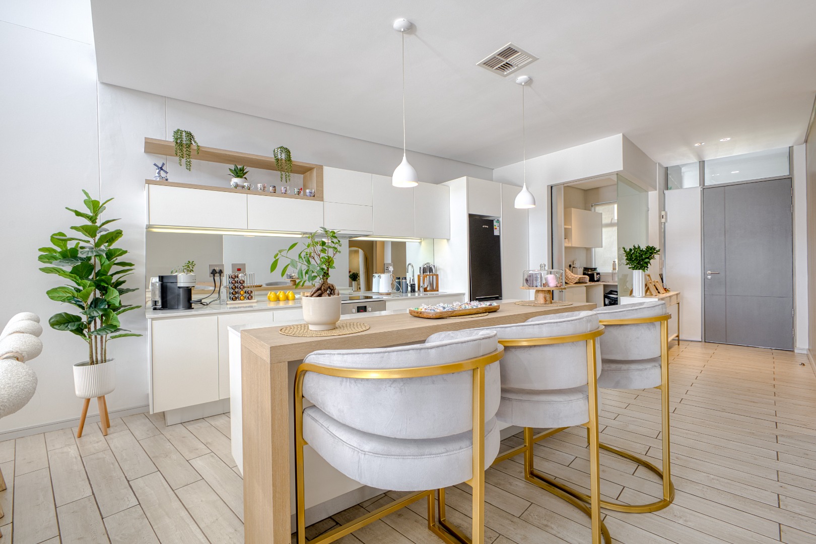 The open-plan gourmet kitchen features a central serving island and an adjacent enclosed scullery, comfortably accommodating three appliances and designed for both practicality and style.