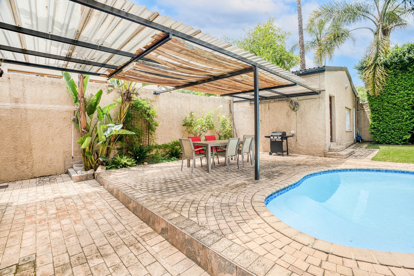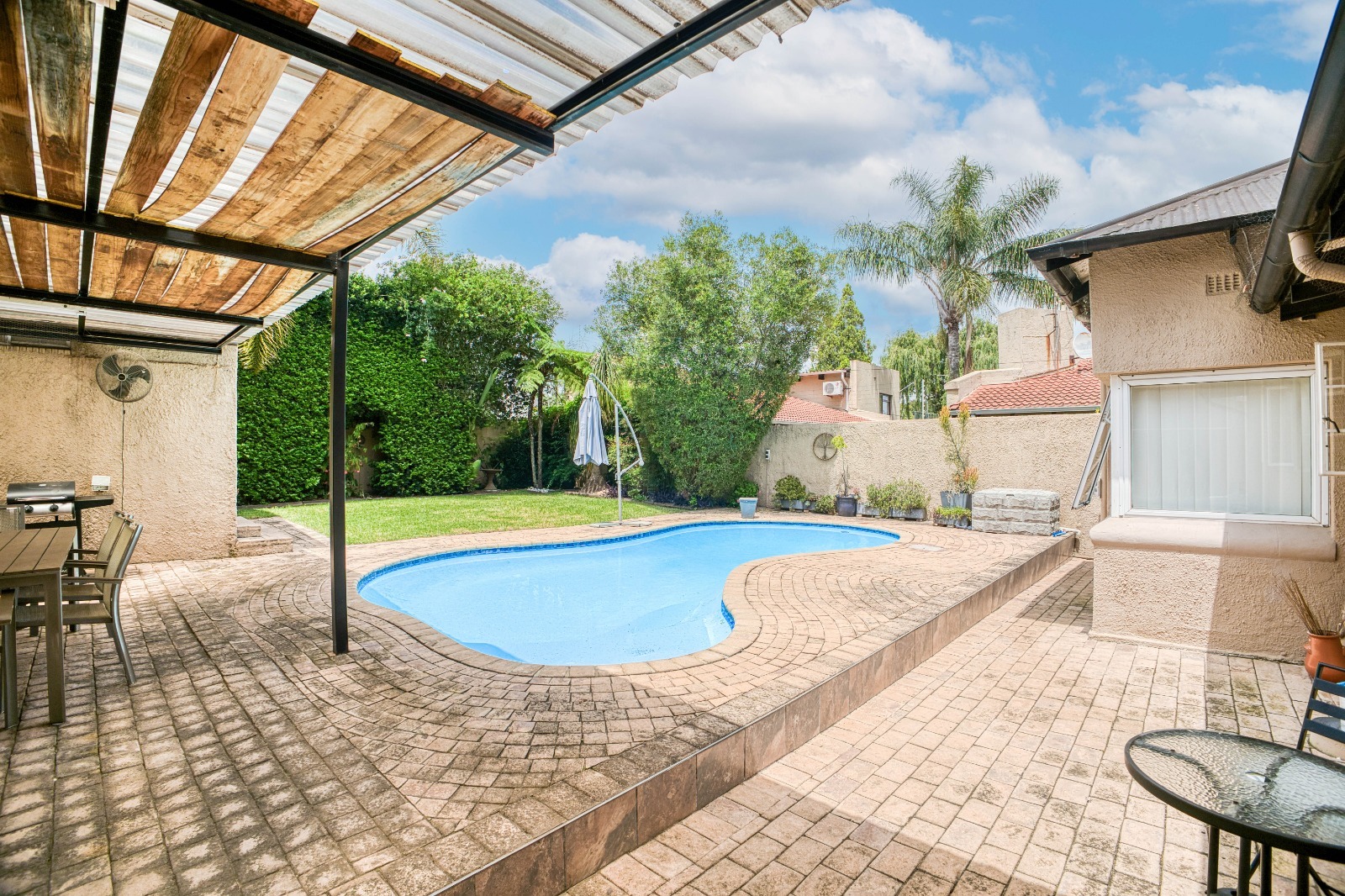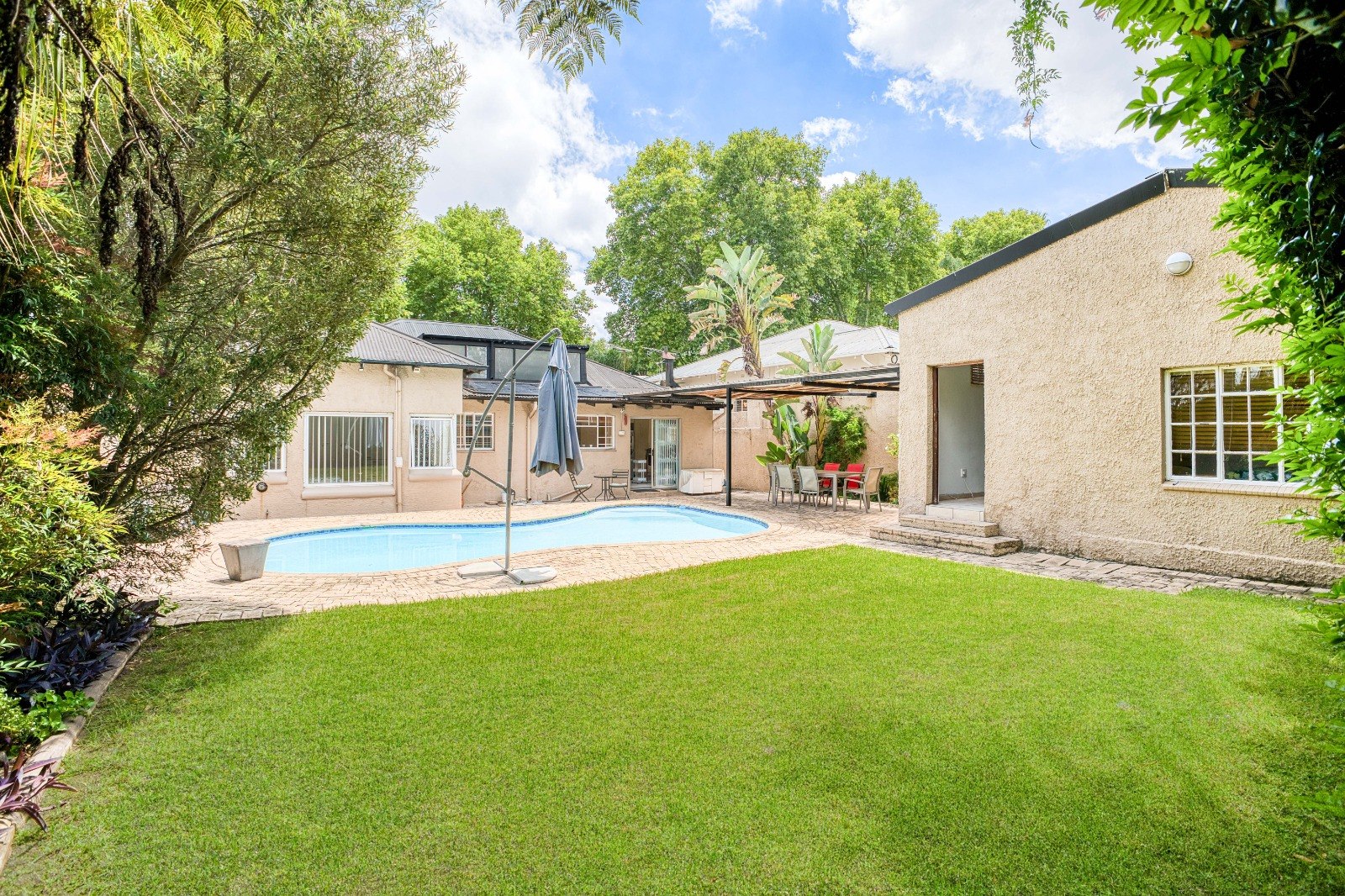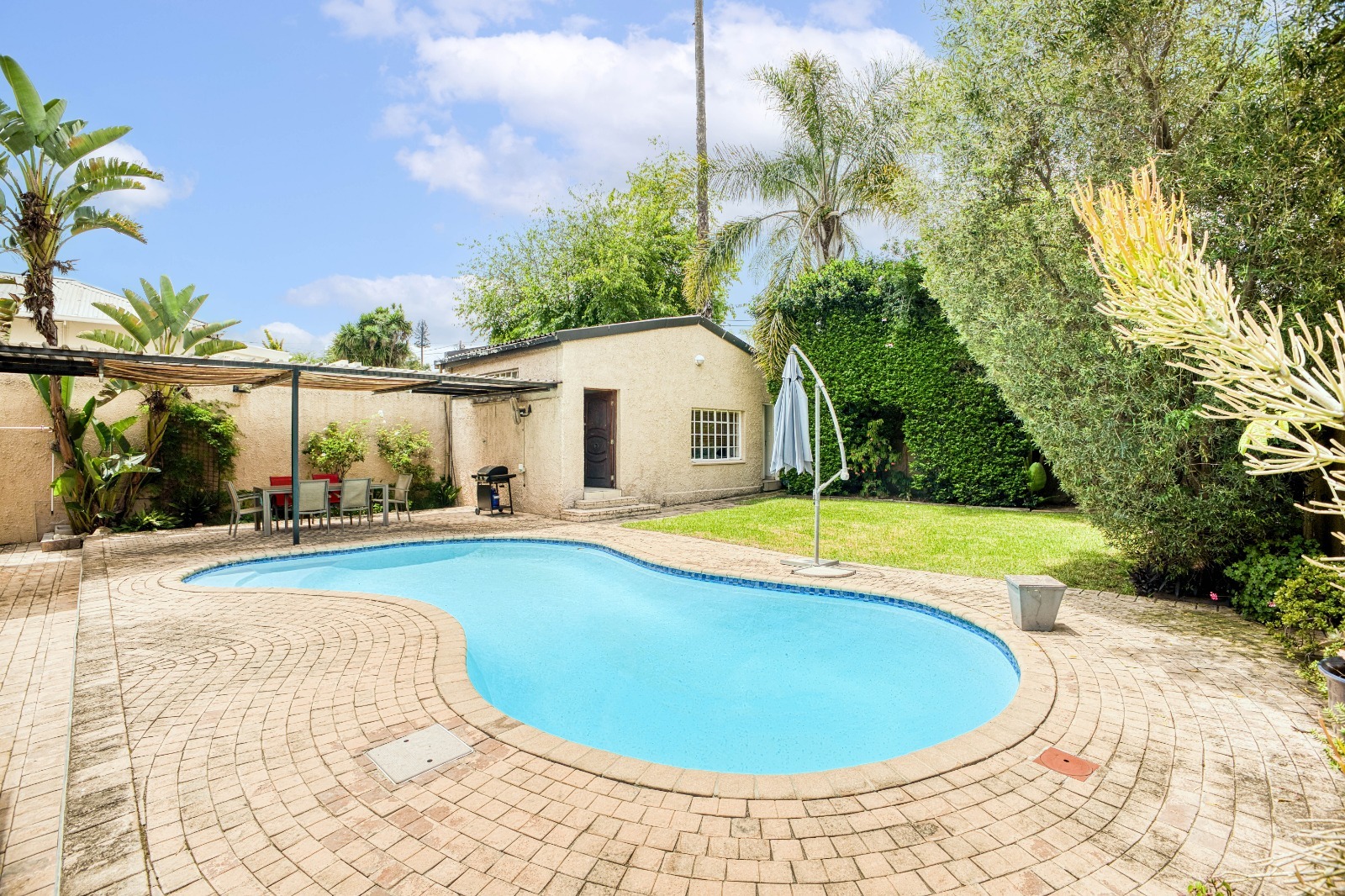 The garden is a standout feature, boasting a sun-kissed swimming pool, covered patio, and lush grassed garden—an idyllic setting where children can play freely and family memories are made. This is truly family living at its best. A private and fully self-contained cottage offers multiple possibilities: a bedroom, lounge, and bathroom—perfect as a guest suite, teenage pad, work-from-home space, or an excellent rental income opportunity.