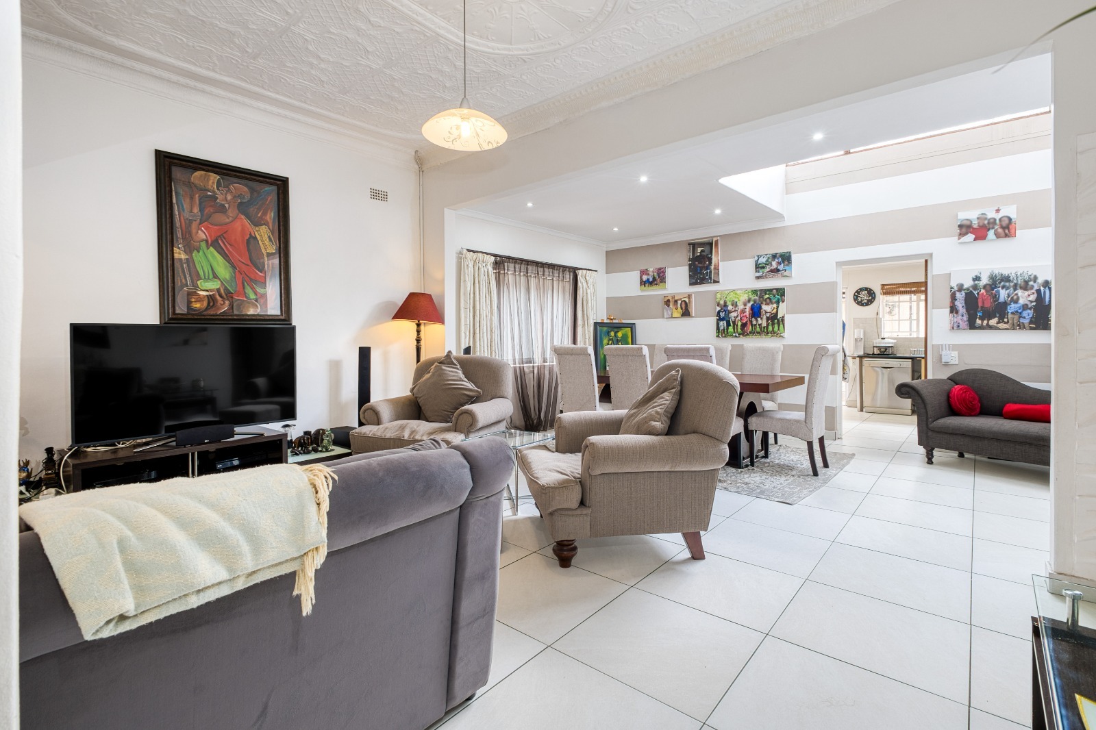 Set in the heart of the vibey suburb of Norwood, and superbly positioned on the sought-after Orchards and Oaklands border, this home offers an exceptional lifestyle ideally suited to young families who value community, convenience and character. The entrance opens into stunning open-plan lounge and dining areas, an ideal living space. The lounge extends through sliding doors onto an intimate covered front patio, creating a seamless indoor-outdoor connection. Beautiful tiled flooring and classic pressed ceilings infuse the home with warmth, charm, and timeless appeal, while the dining area is further enhanced by skylights and striking paint-technique feature walls, bathing the space in natural light and creating an inviting atmosphere for everyday living and entertaining alike.