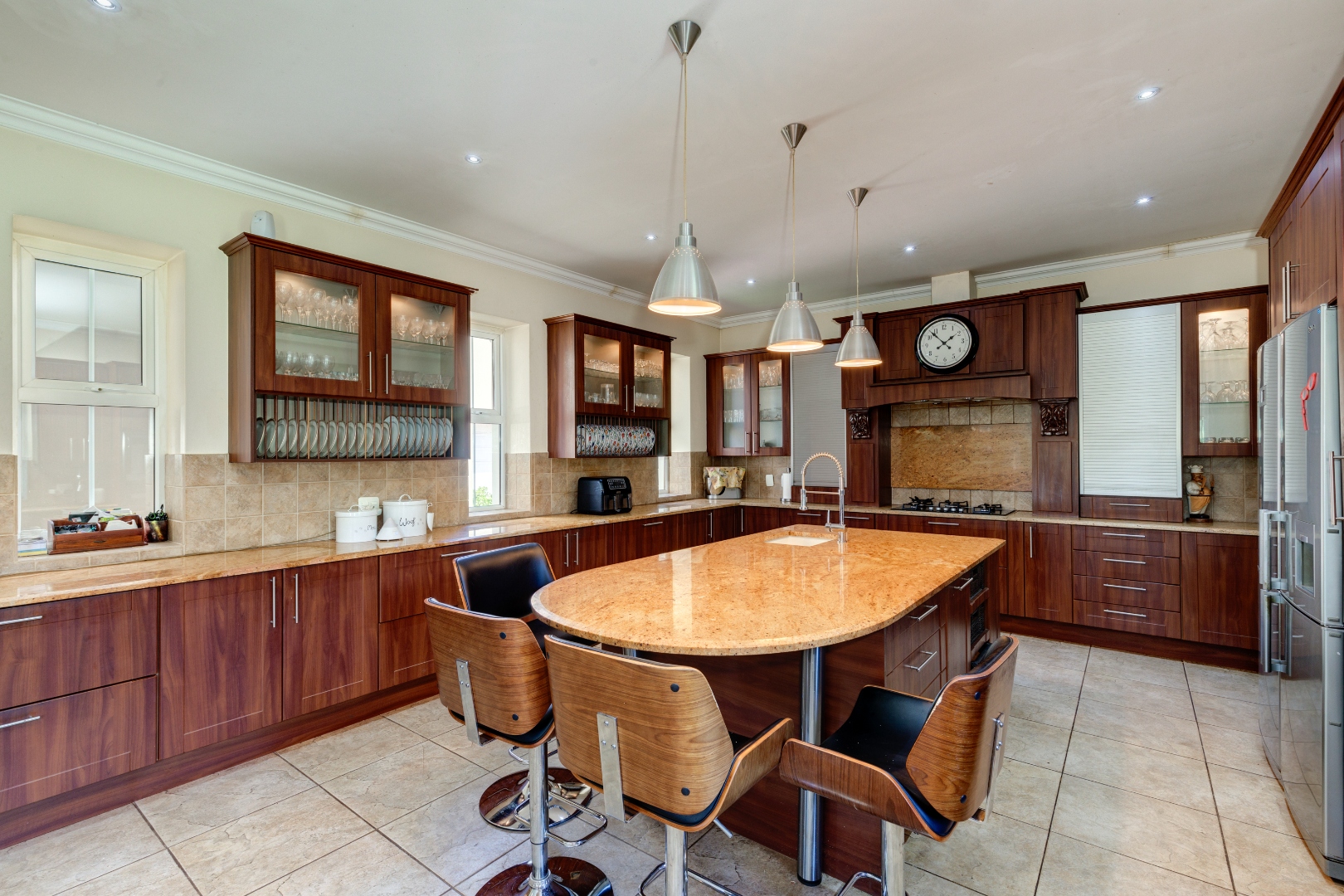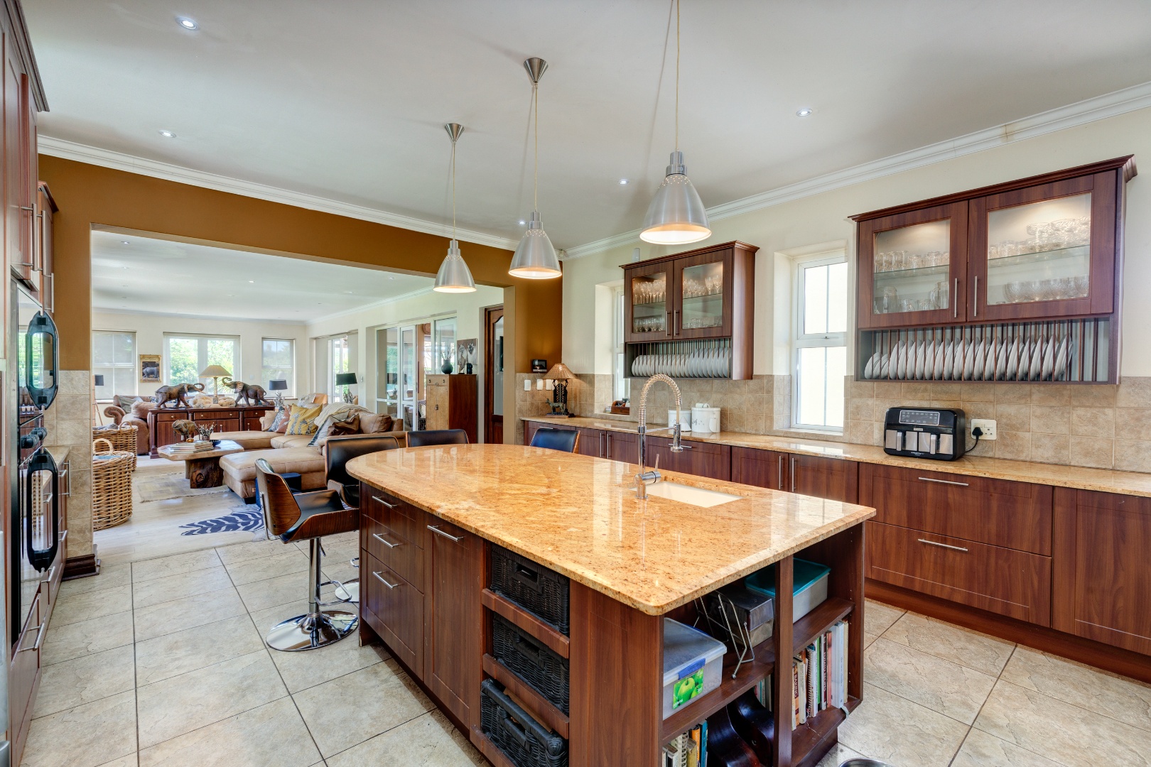 An open-plan designer kitchen with a separate scullery