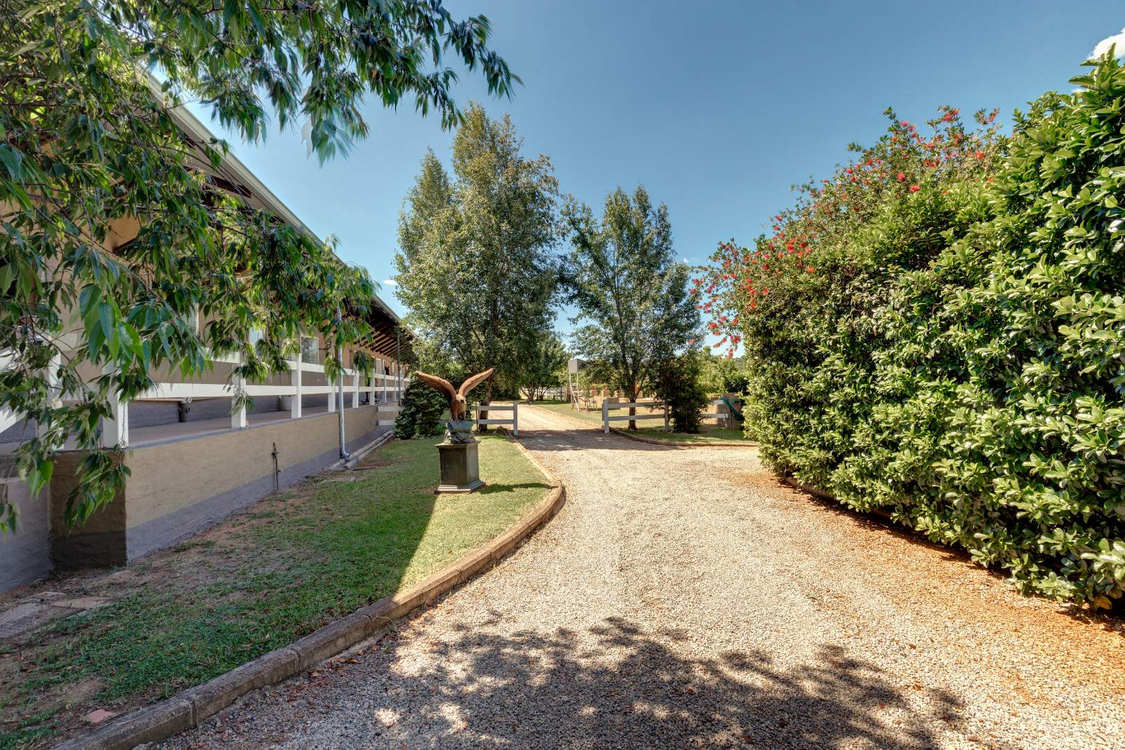 12 large grass paddocks, each with shade nets, auto-drinkers, irrigation, and low-maintenance white safety fencing