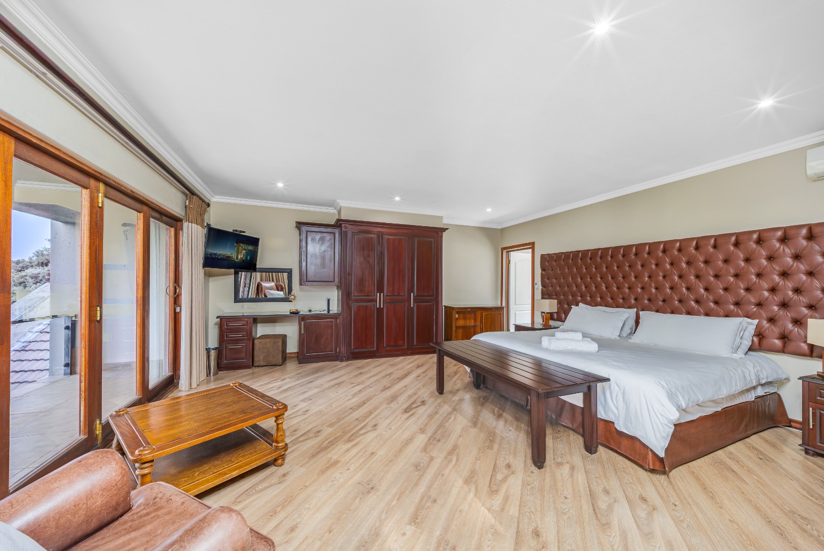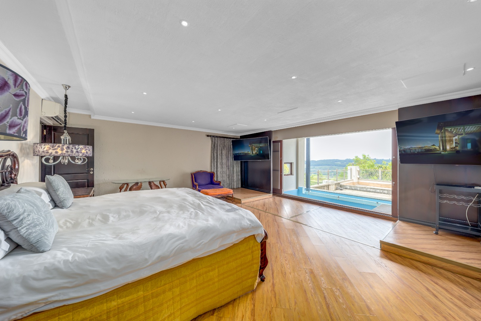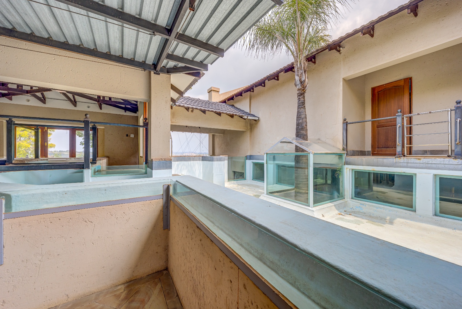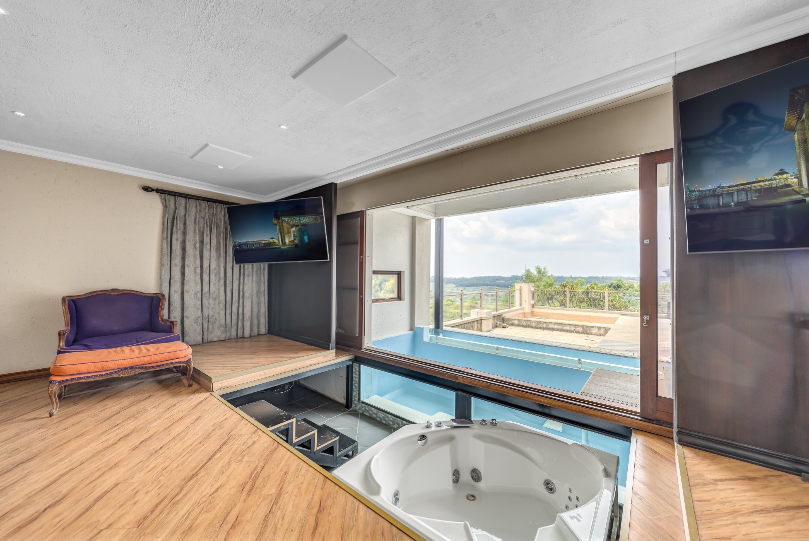 The interior boasts a thoughtful layout with two spacious lounges and a dedicated dining room, providing ample space for both relaxation and entertaining. The property features two well-appointed kitchens, catering to diverse culinary needs. A dedicated study offers a quiet retreat for work or contemplation, while a separate laundry room and ample storage ensure practical convenience. Unique amenities include an indoor jacuzzi with panoramic views, a professional-grade braai room with a built-in bar, and a modern glass elevator, adding a touch of sophistication and accessibility.