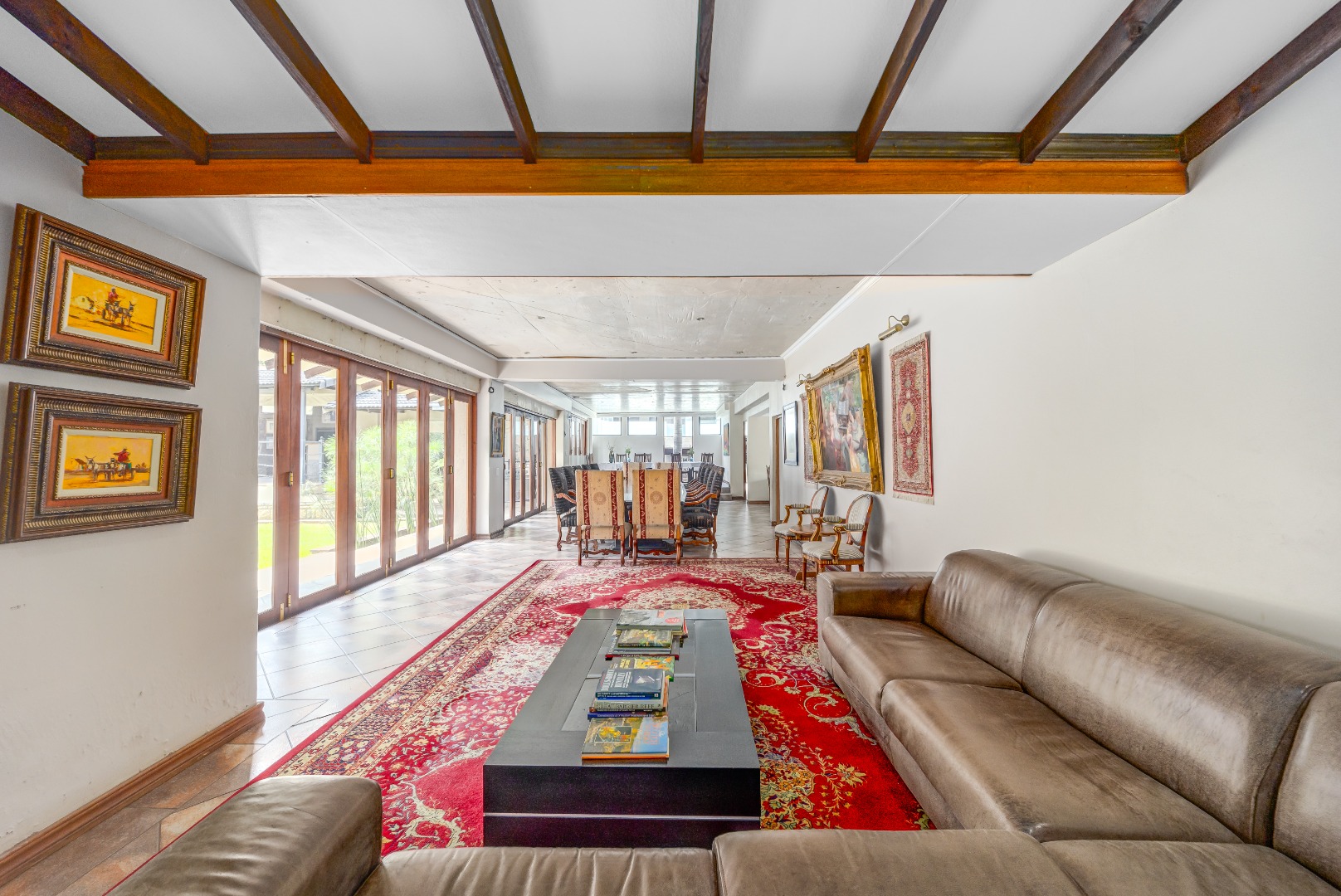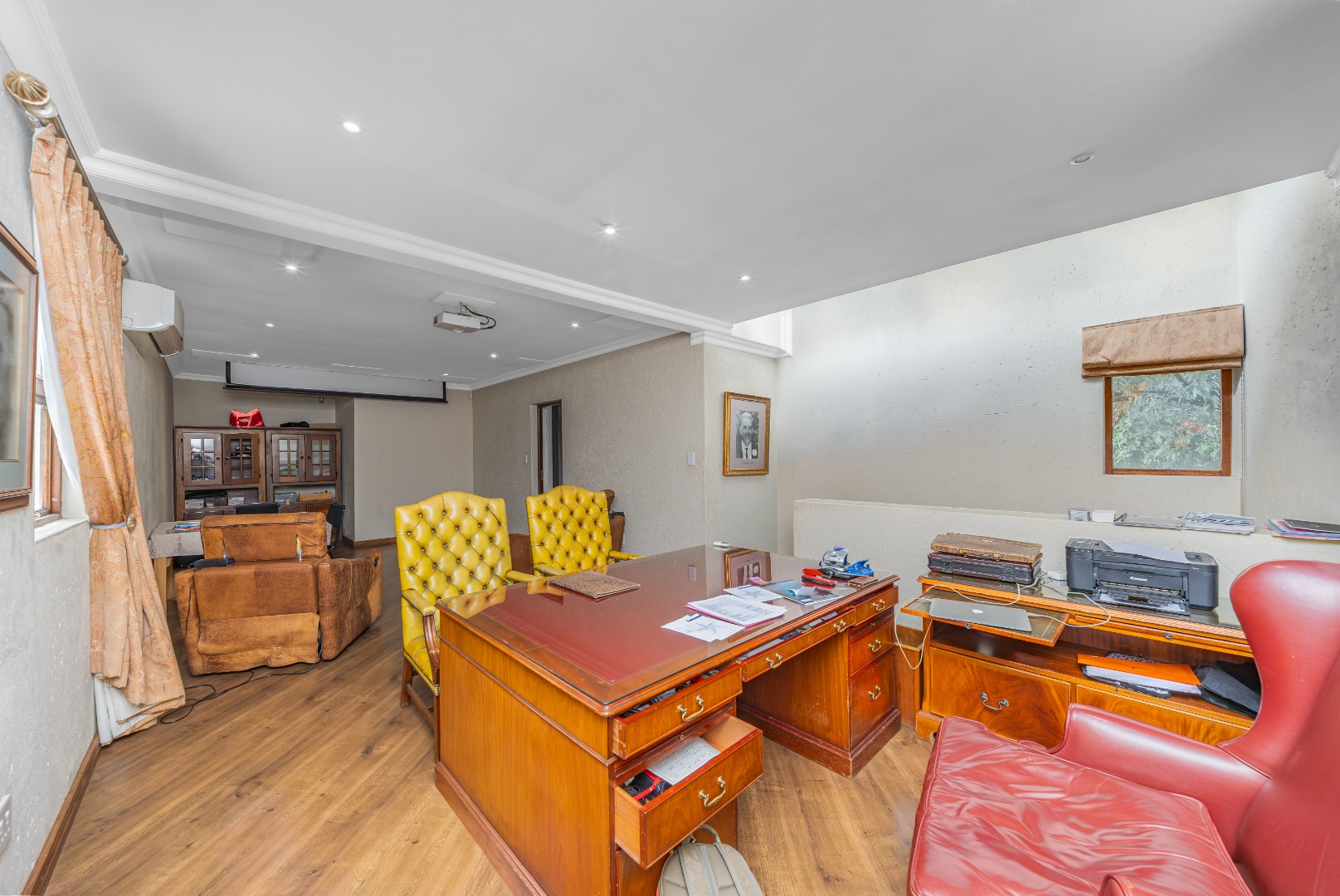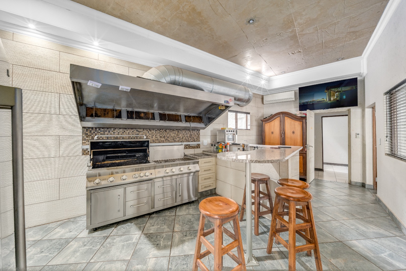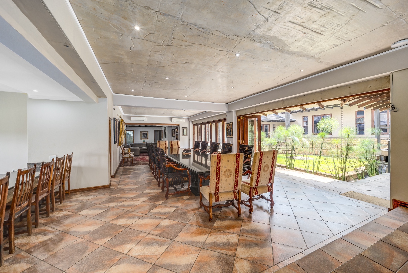 Outdoor living is a highlight, featuring a sparkling pool, a lapa, and beautifully paved areas surrounded by a well-maintained garden, perfect for outdoor gatherings. The property includes six garages and eight additional parking spaces, accommodating numerous vehicles. Security is robust with 24-hour security, an alarm system, electric fencing, and an access gate, providing peace of mind. Practical features such as air conditioning, a borehole, and a sprinkler system enhance comfort and sustainability.