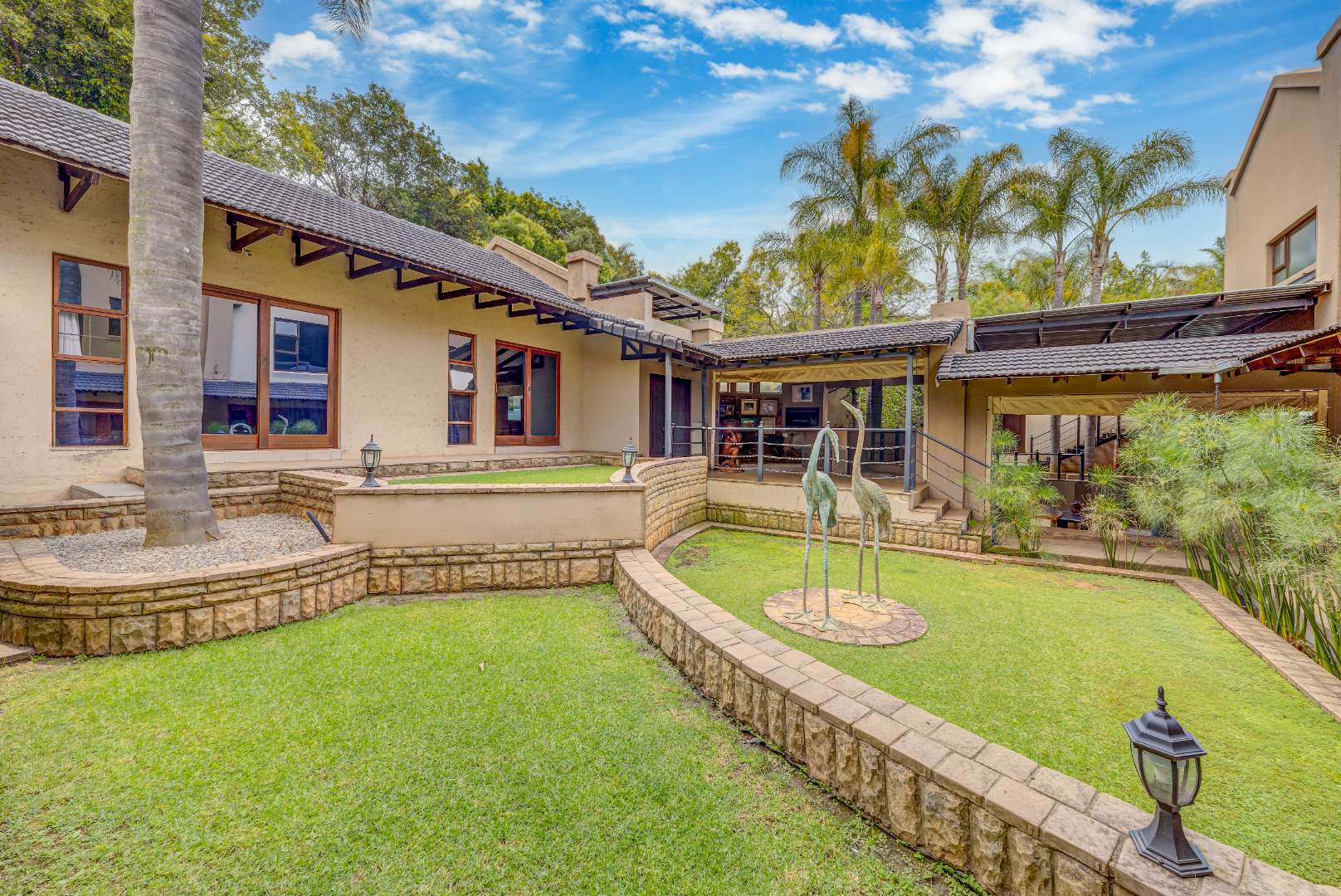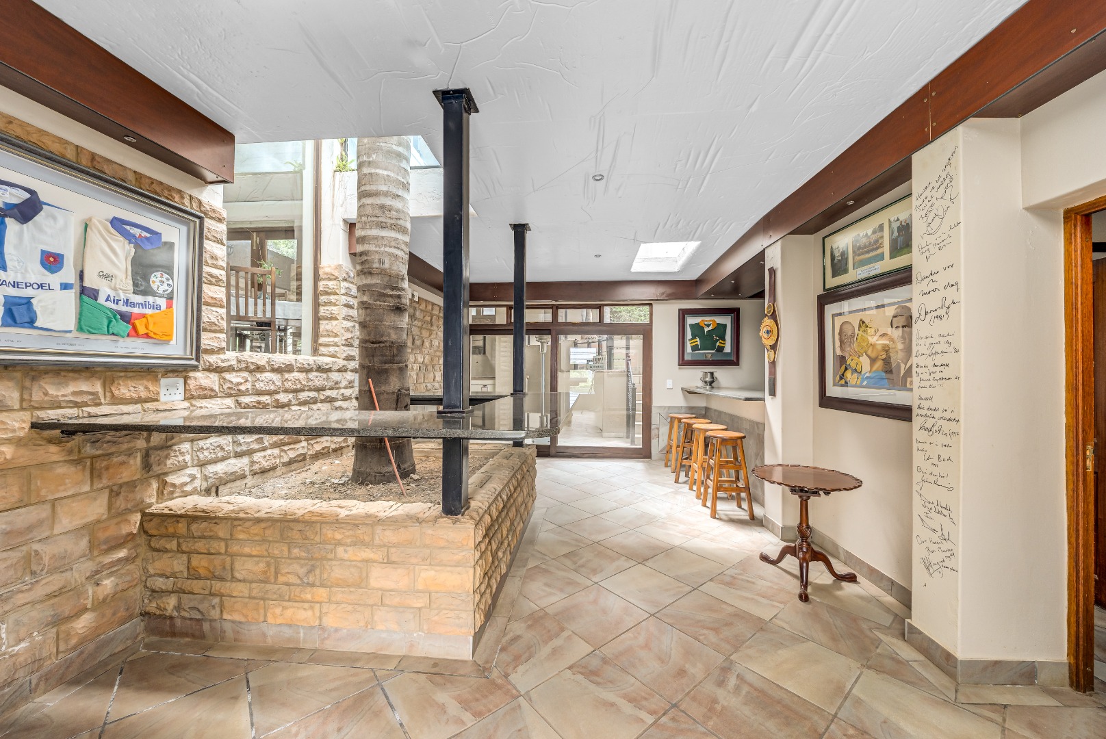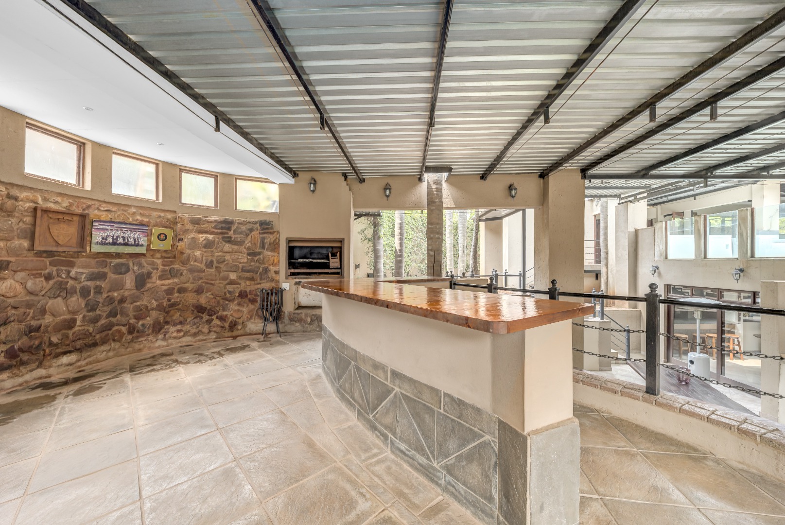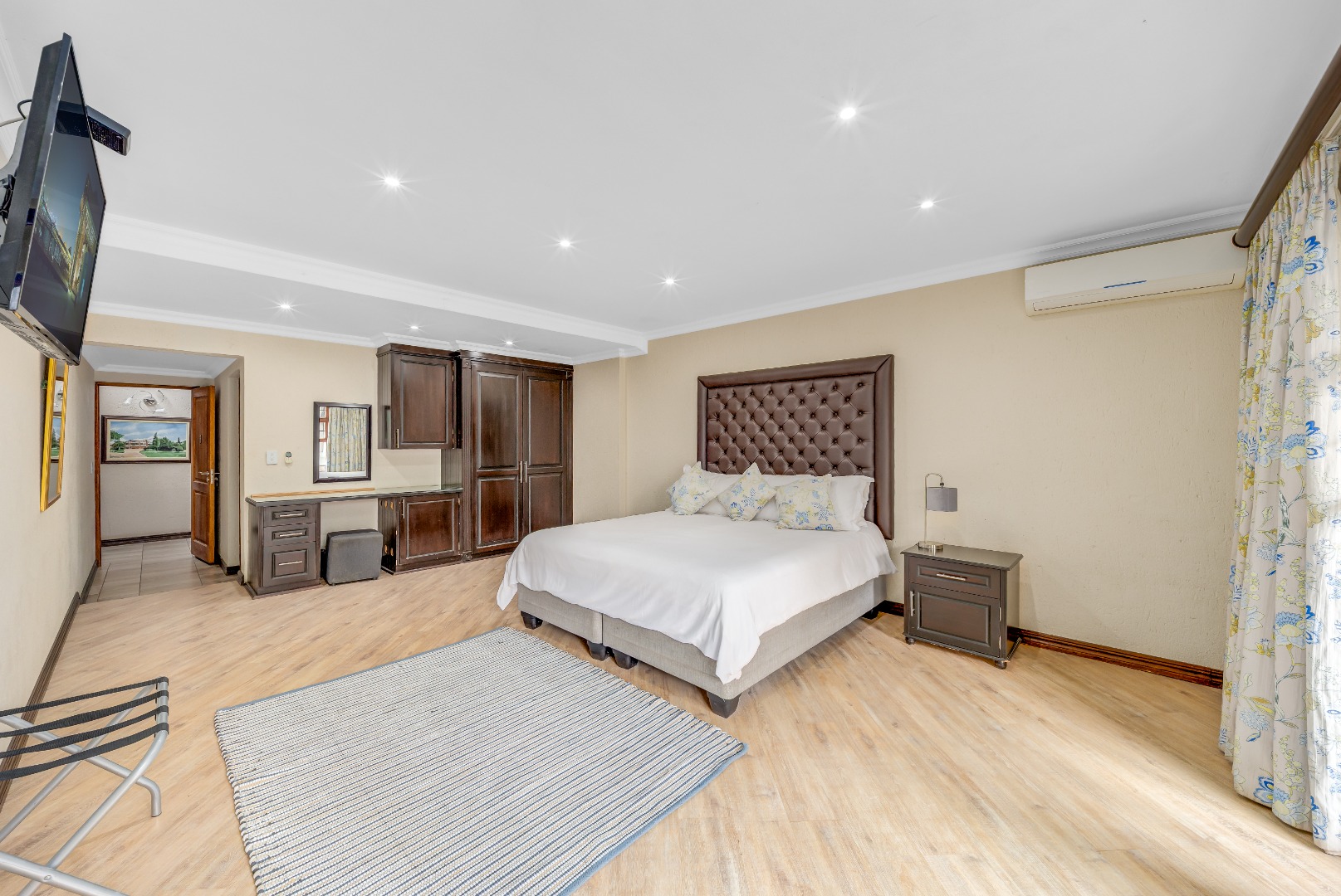 Outdoor living is a highlight, featuring a sparkling pool, a lapa, and beautifully paved areas surrounded by a well-maintained garden, perfect for outdoor gatherings. The property includes six garages and eight additional parking spaces, accommodating numerous vehicles. Security is robust with 24-hour security, an alarm system, electric fencing, and an access gate, providing peace of mind. Practical features such as air conditioning, a borehole, and a sprinkler system enhance comfort and sustainability.