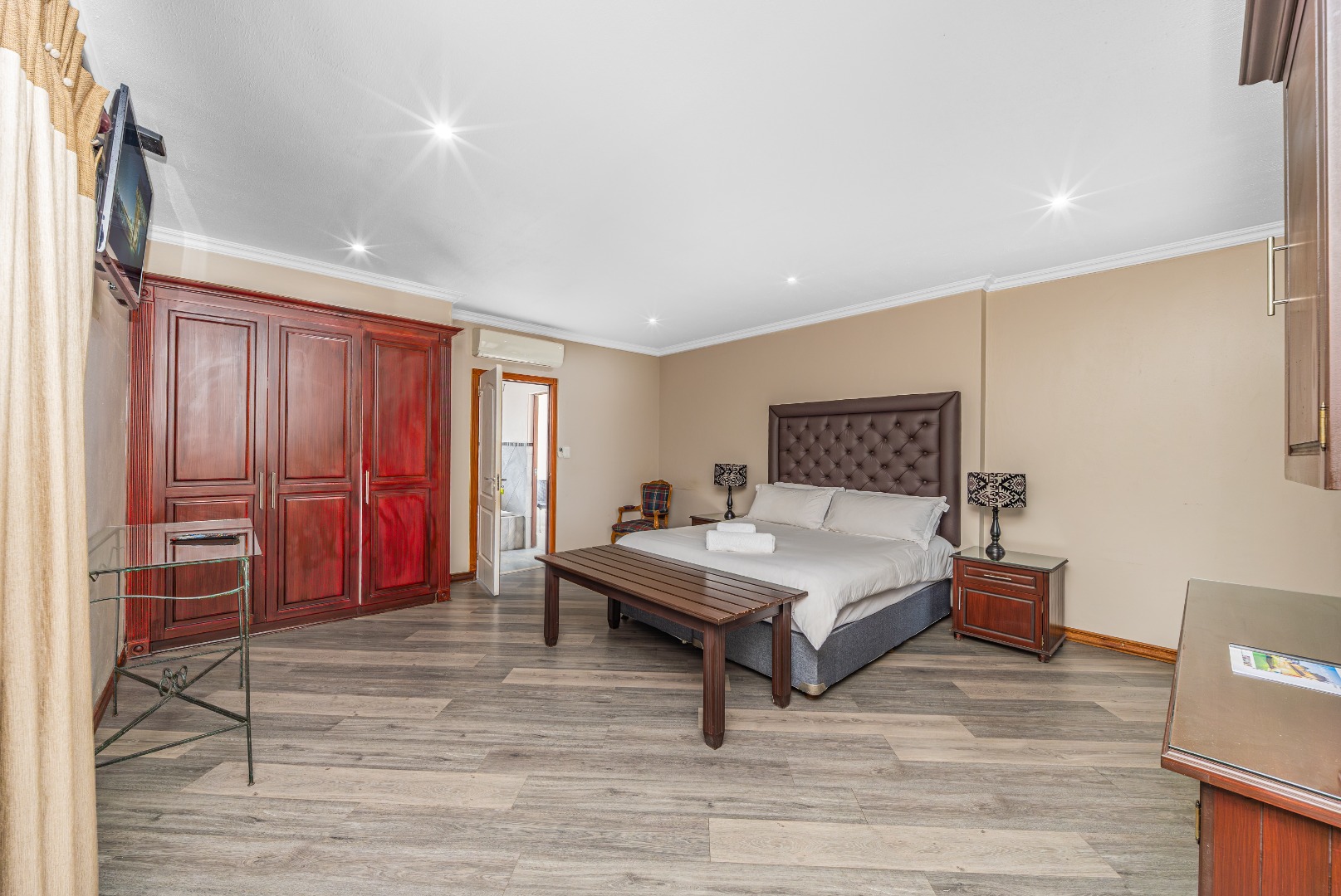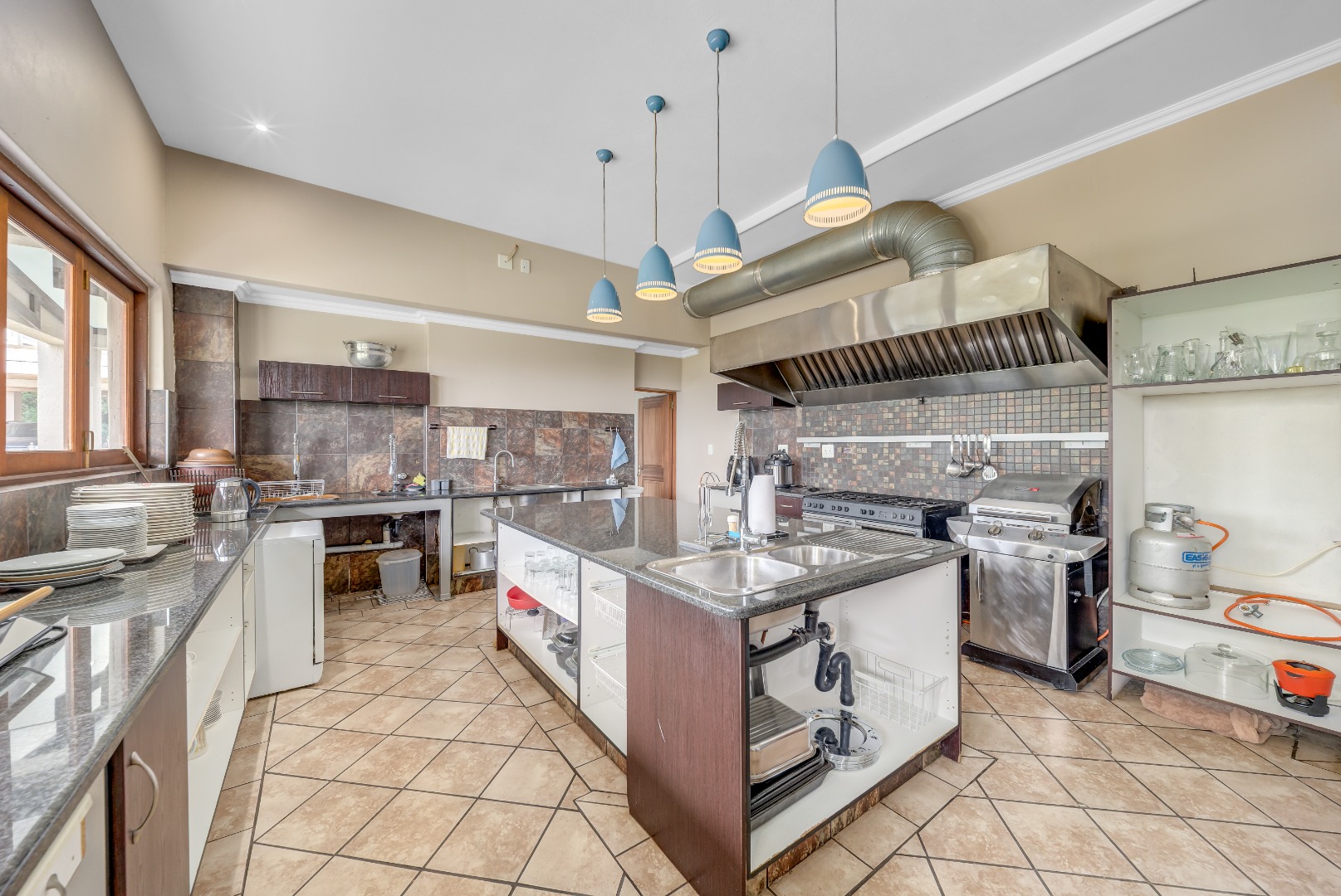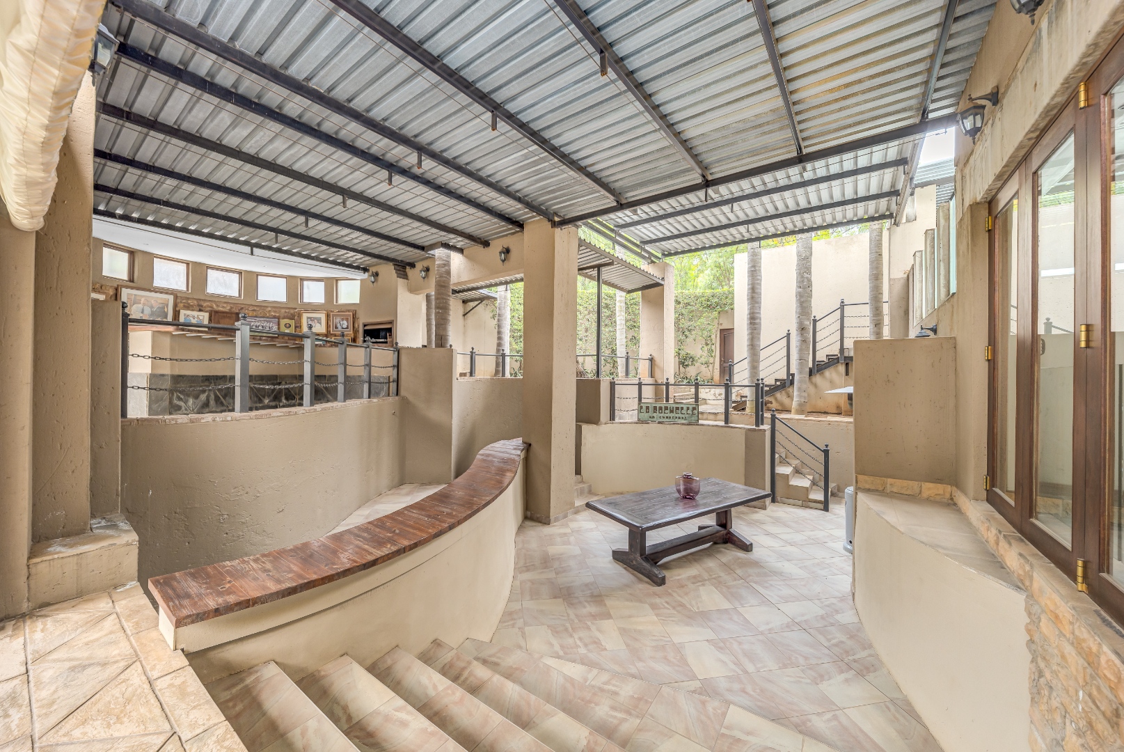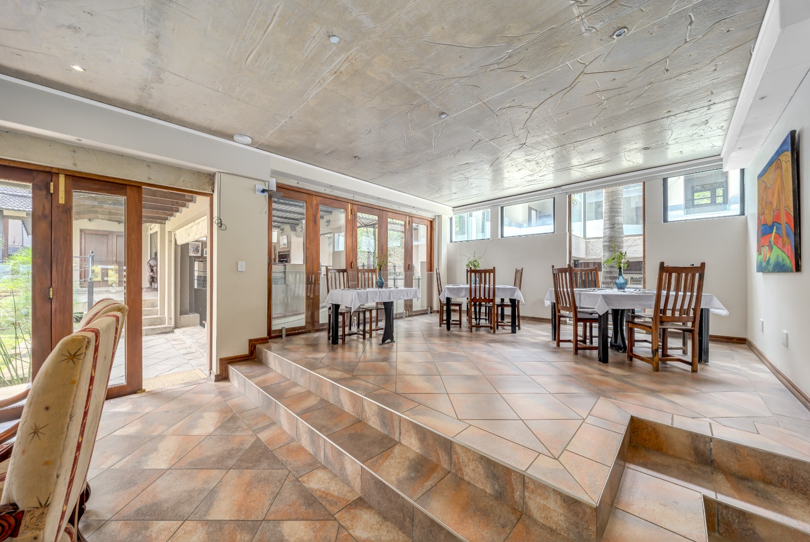 Outdoor living is a highlight, featuring a sparkling pool, a lapa, and beautifully paved areas surrounded by a well-maintained garden, perfect for outdoor gatherings. The property includes six garages and eight additional parking spaces, accommodating numerous vehicles. Security is robust with 24-hour security, an alarm system, electric fencing, and an access gate, providing peace of mind. Practical features such as air conditioning, a borehole, and a sprinkler system enhance comfort and sustainability.