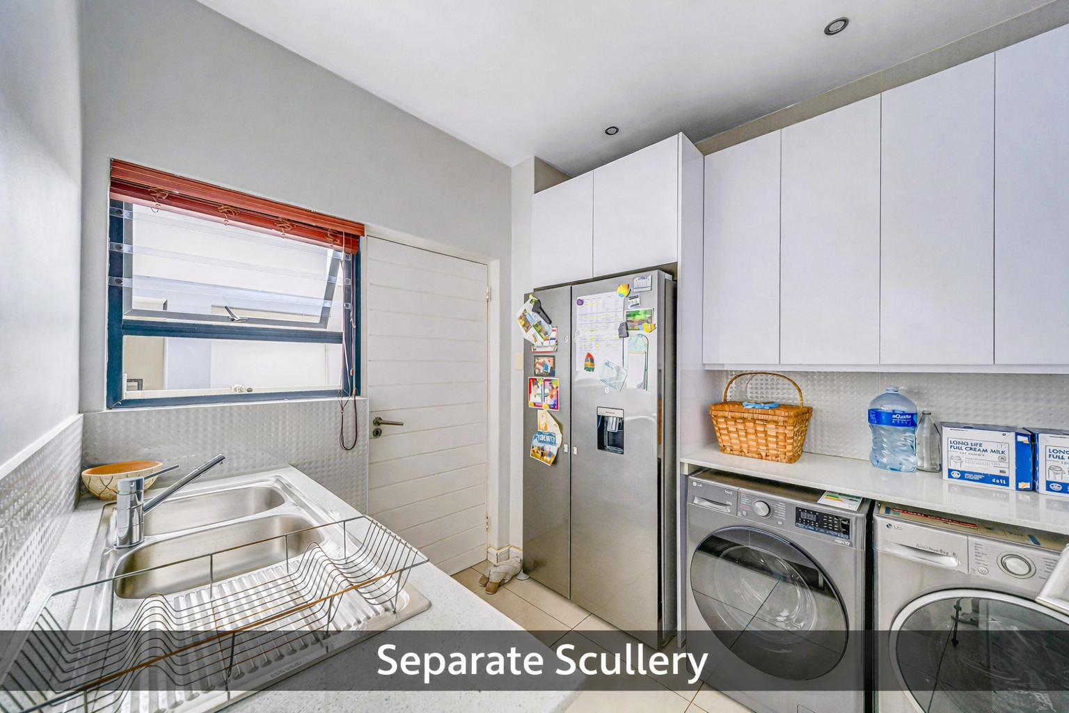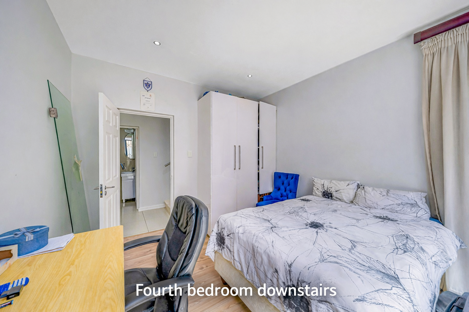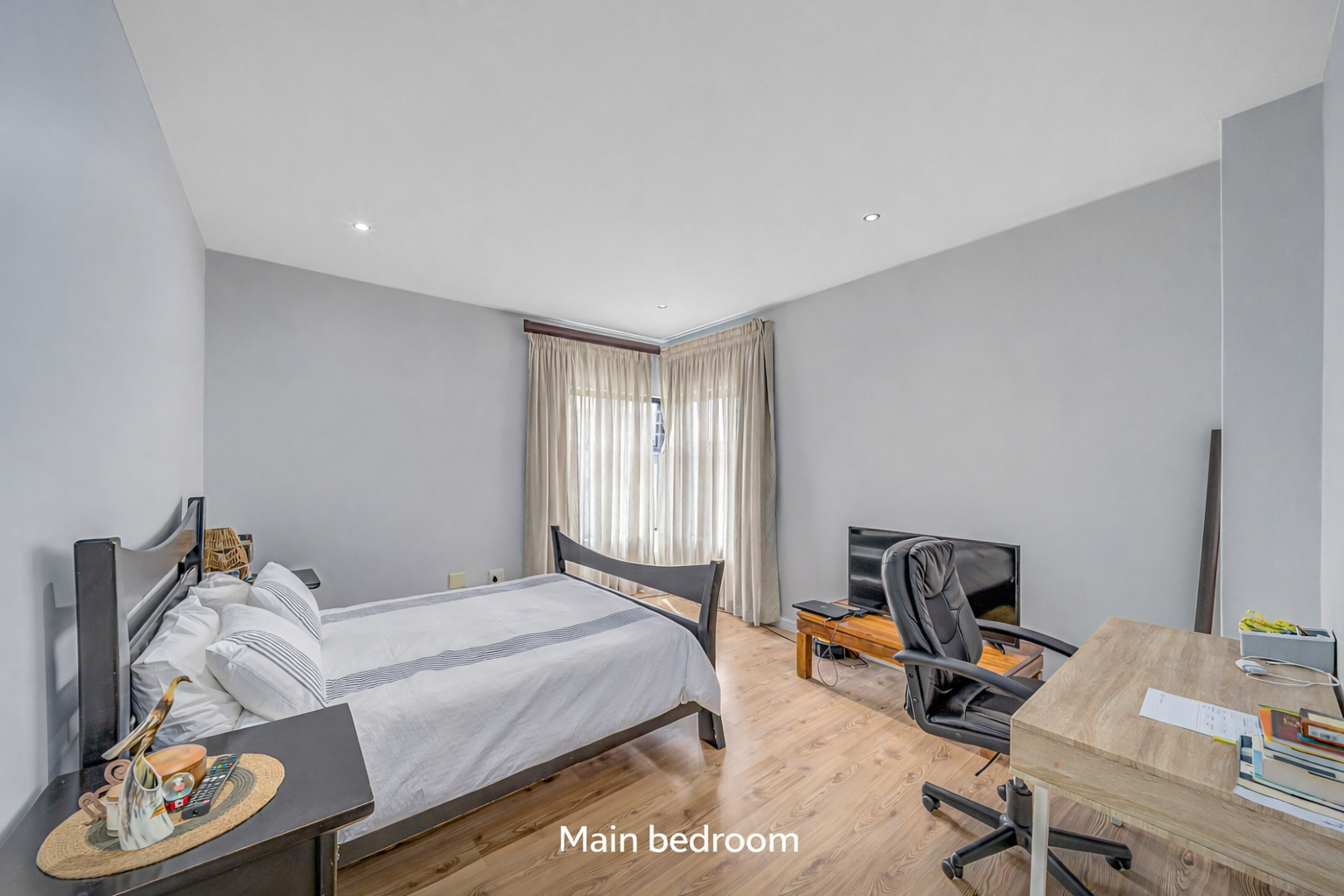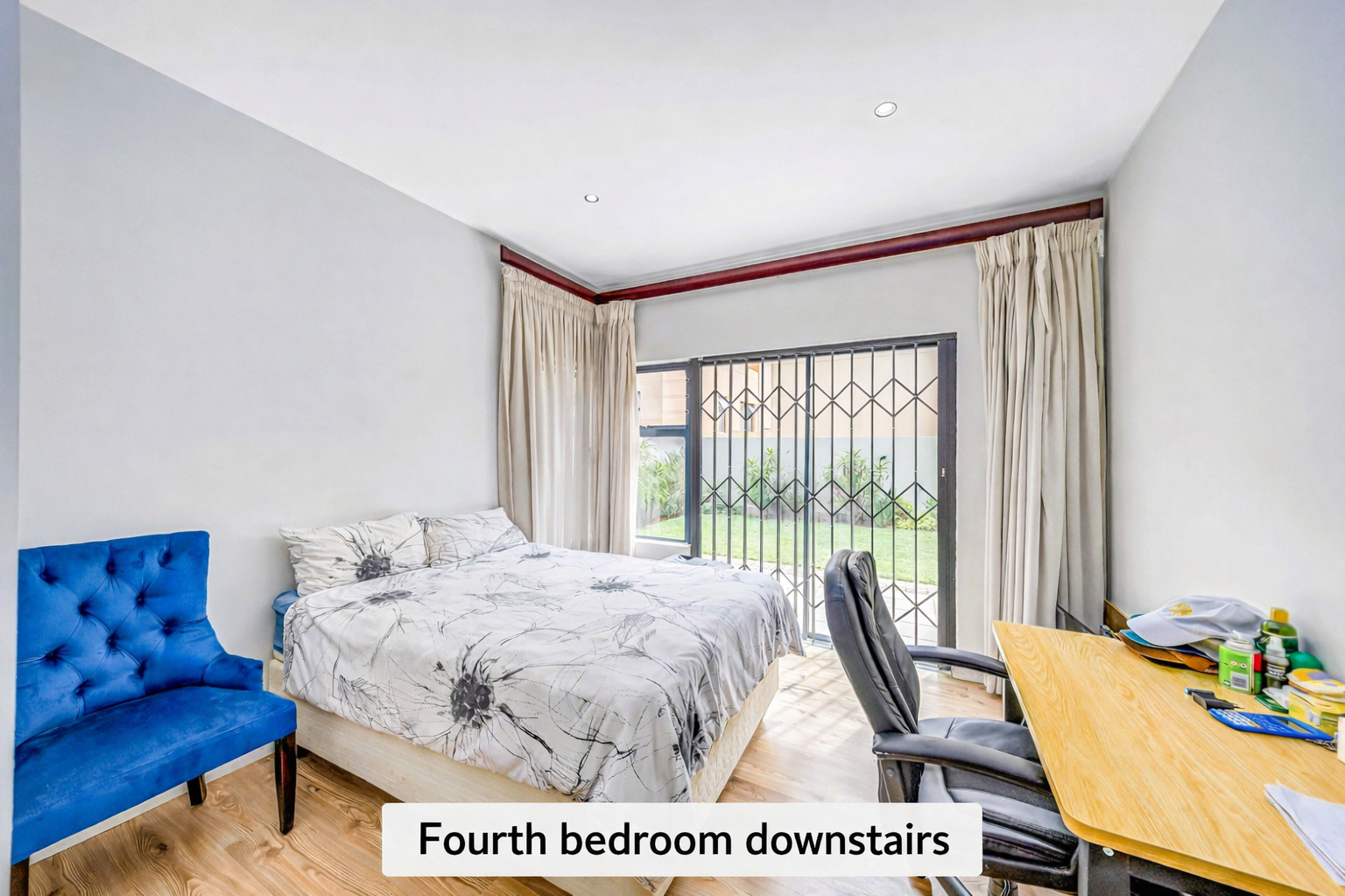 A sunny tiled entrance hall welcomes you into the open-plan lounge and dining area, complete with a cozy gas fireplace. The modern kitchen boasts Caesarstone countertops, a gas hob with electric oven, extractor, built-in microwave, and a separate scullery. There’s ample space for a double-door fridge and two appliances, with direct access from the automated double garage. The fourth bedroom, finished with laminate floors and built-in cupboards, opens onto the entertainment area and sparkling pool. A guest bathroom with shower, toilet, and basin completes the ground floor.