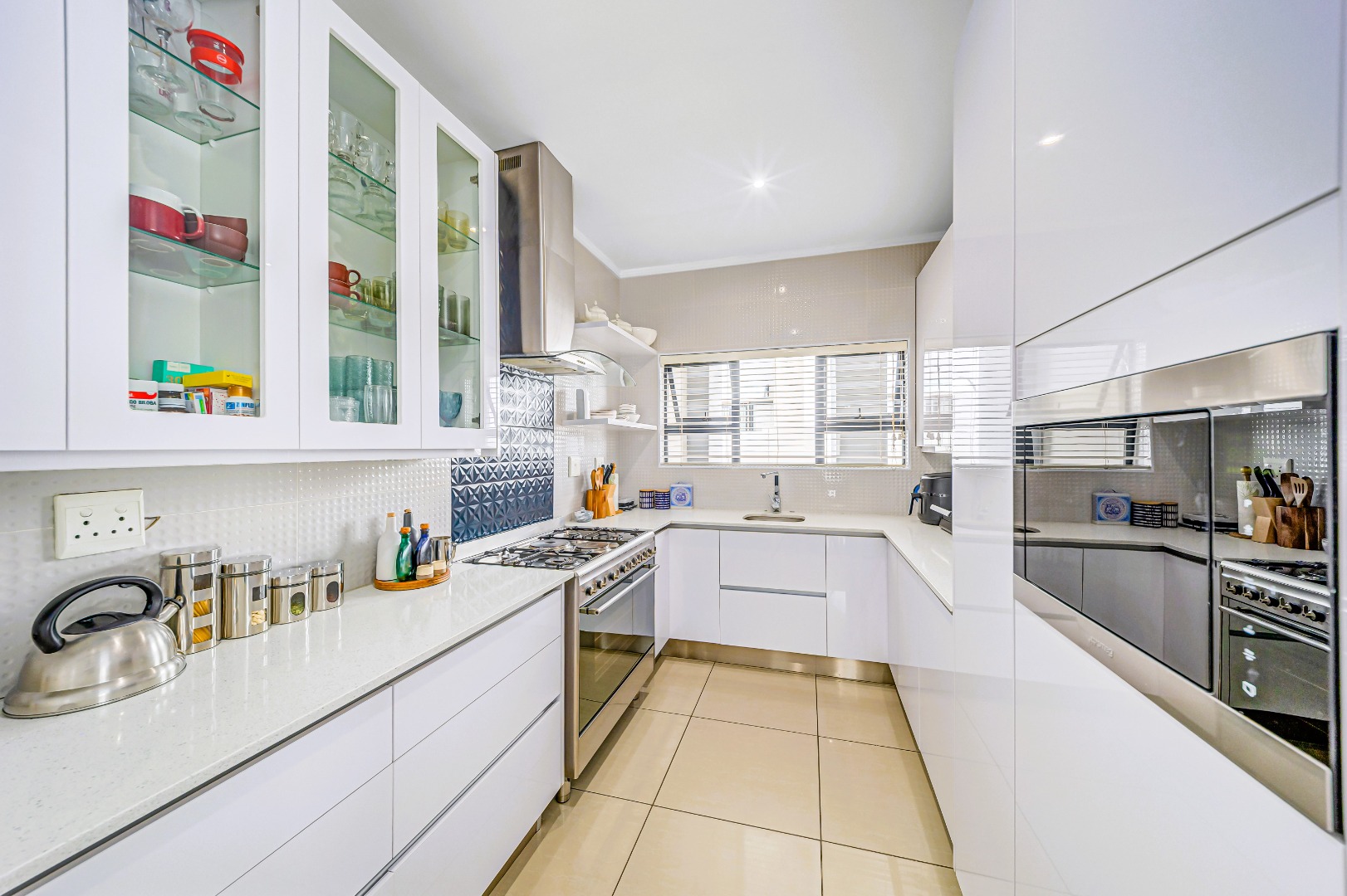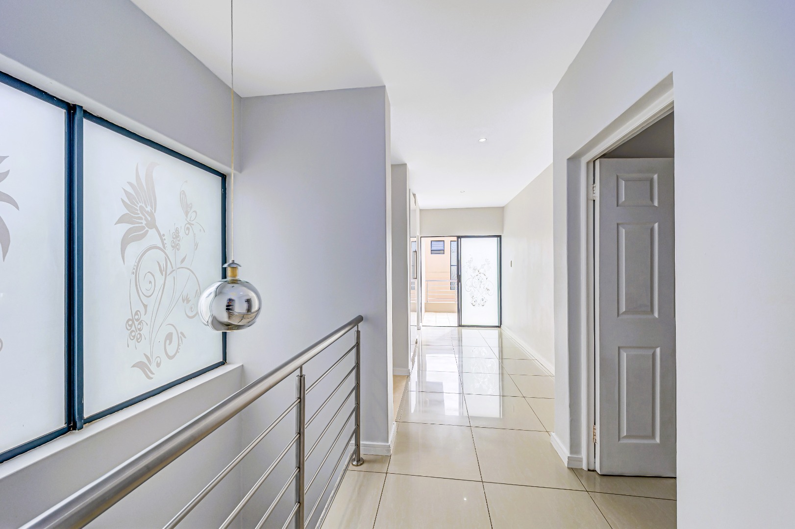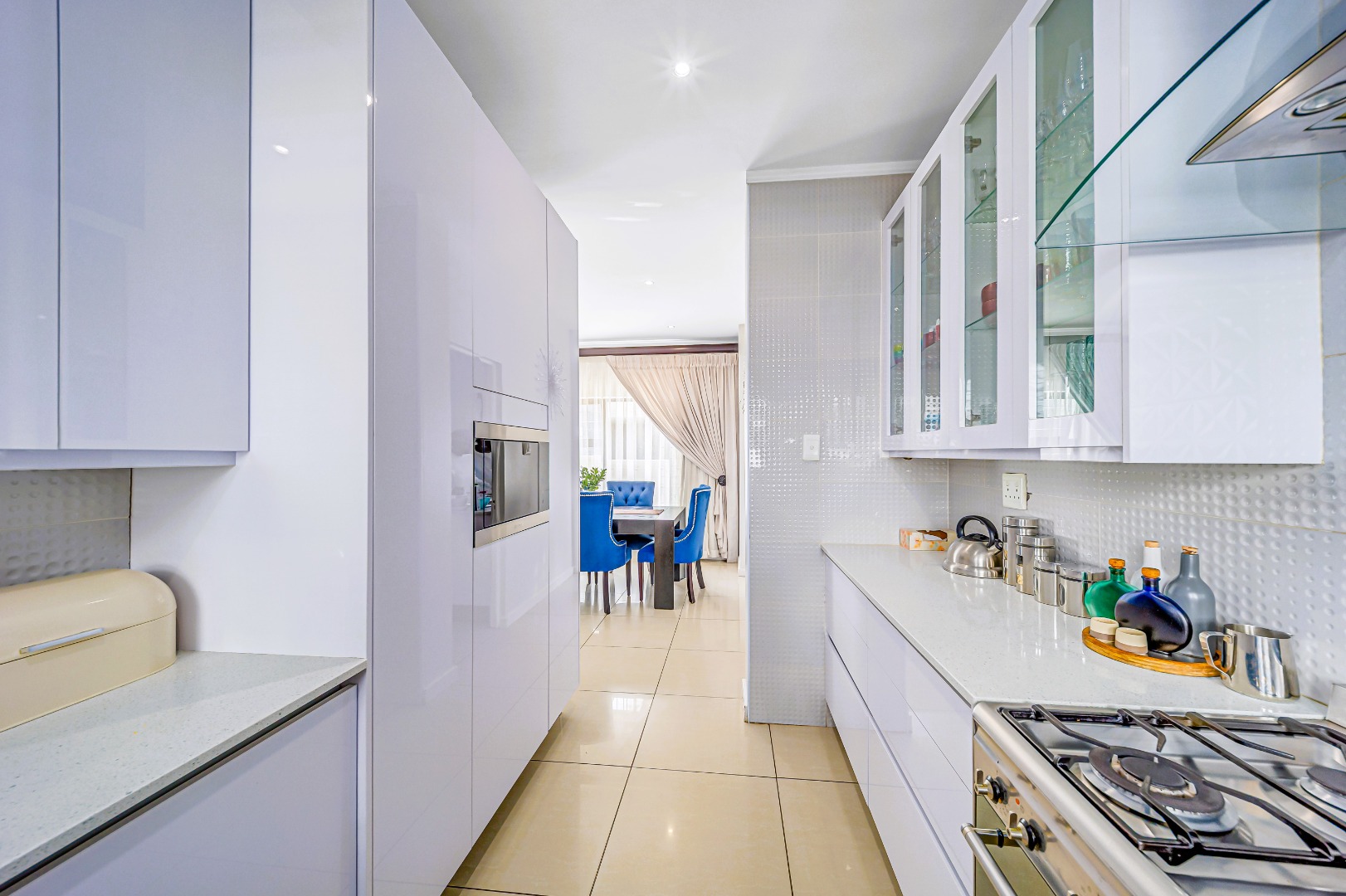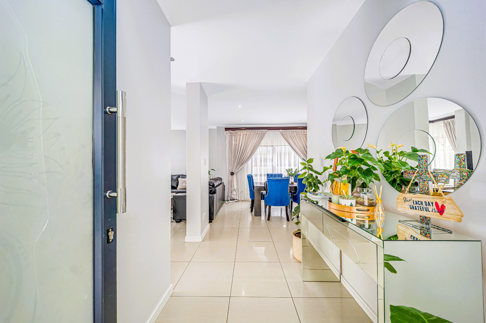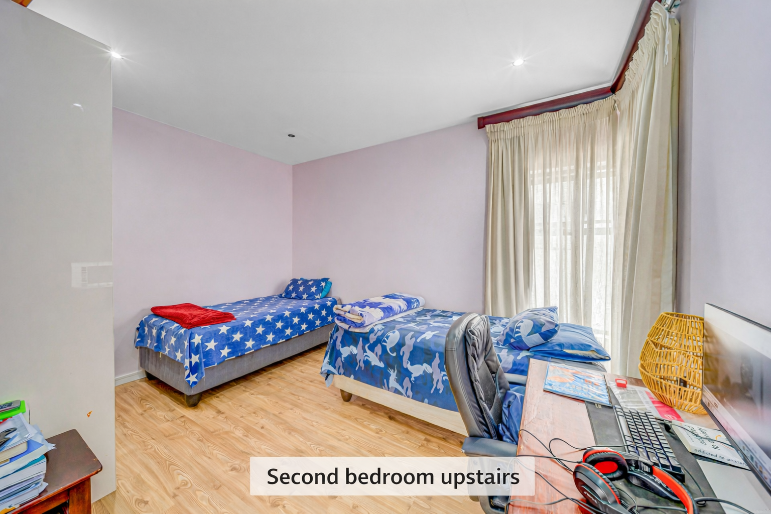 A sunny tiled entrance hall welcomes you into the open-plan lounge and dining area, complete with a cozy gas fireplace. The modern kitchen boasts Caesarstone countertops, a gas hob with electric oven, extractor, built-in microwave, and a separate scullery. There’s ample space for a double-door fridge and two appliances, with direct access from the automated double garage. The fourth bedroom, finished with laminate floors and built-in cupboards, opens onto the entertainment area and sparkling pool. A guest bathroom with shower, toilet, and basin completes the ground floor.