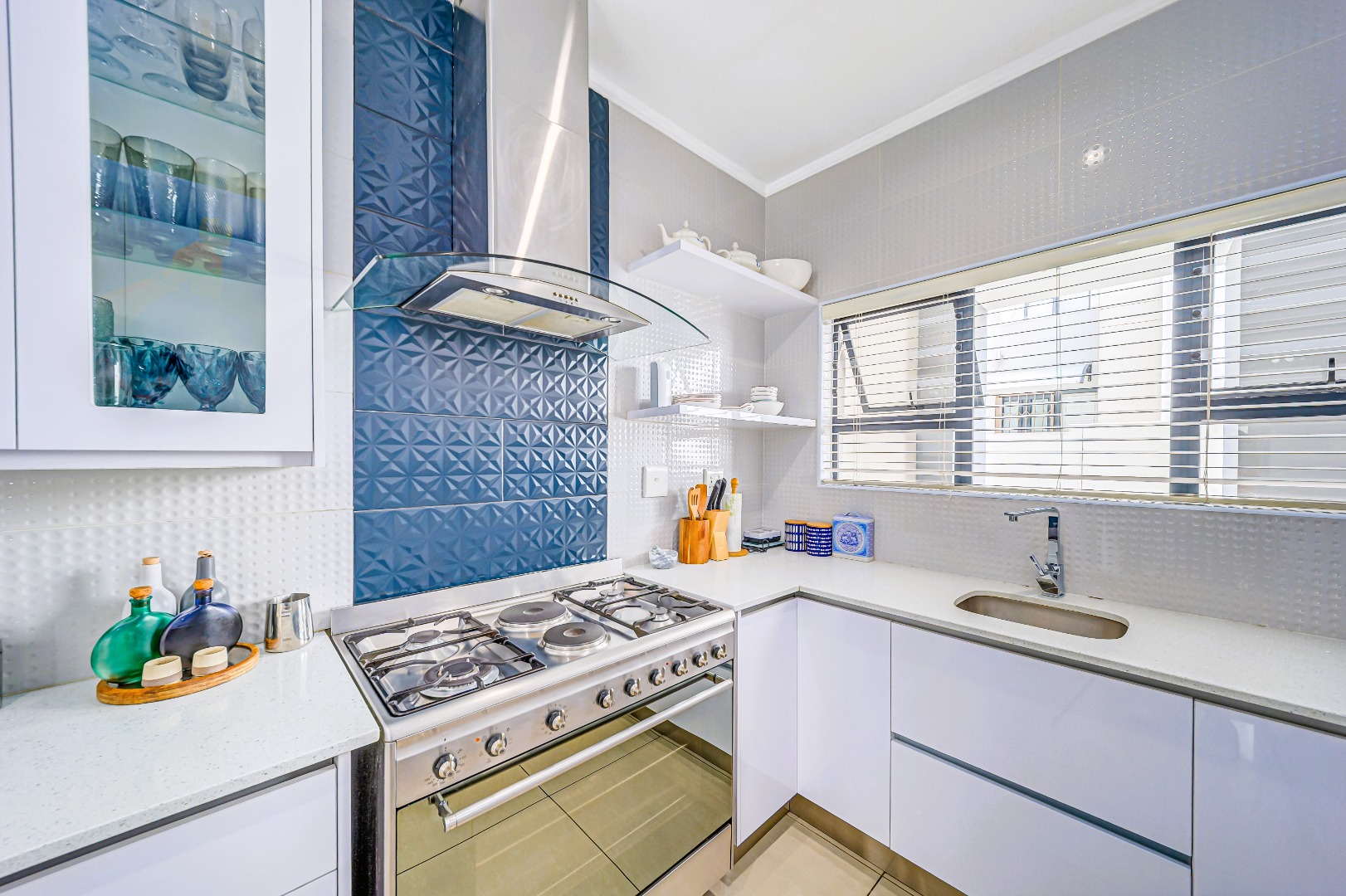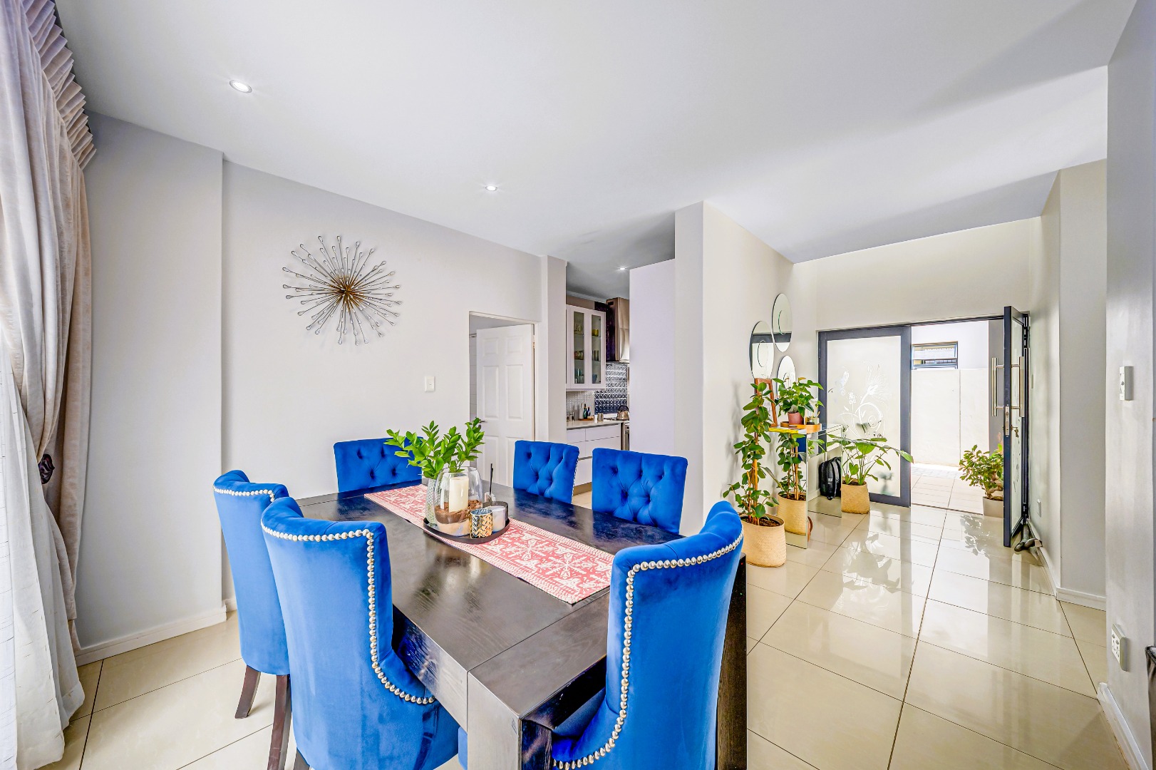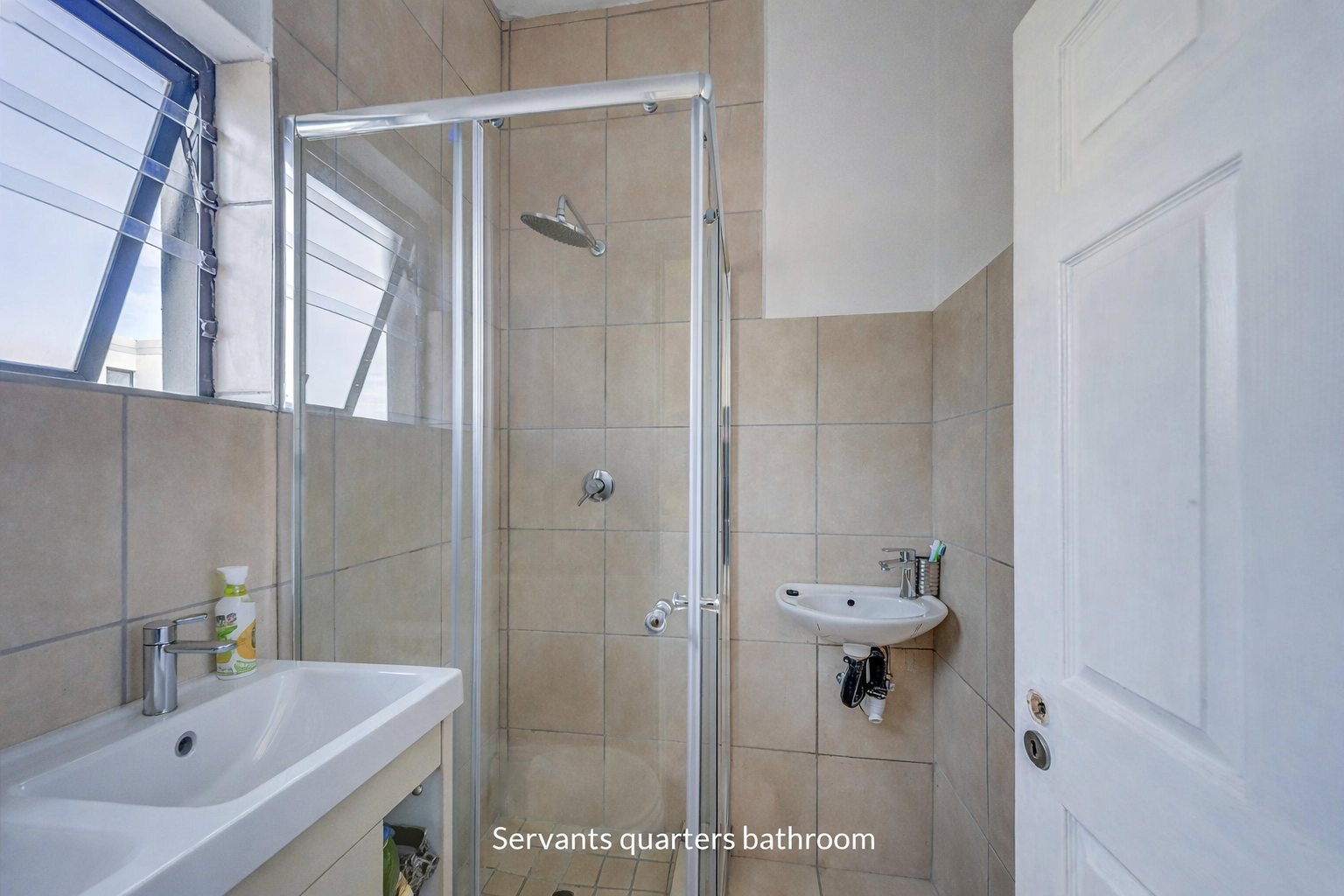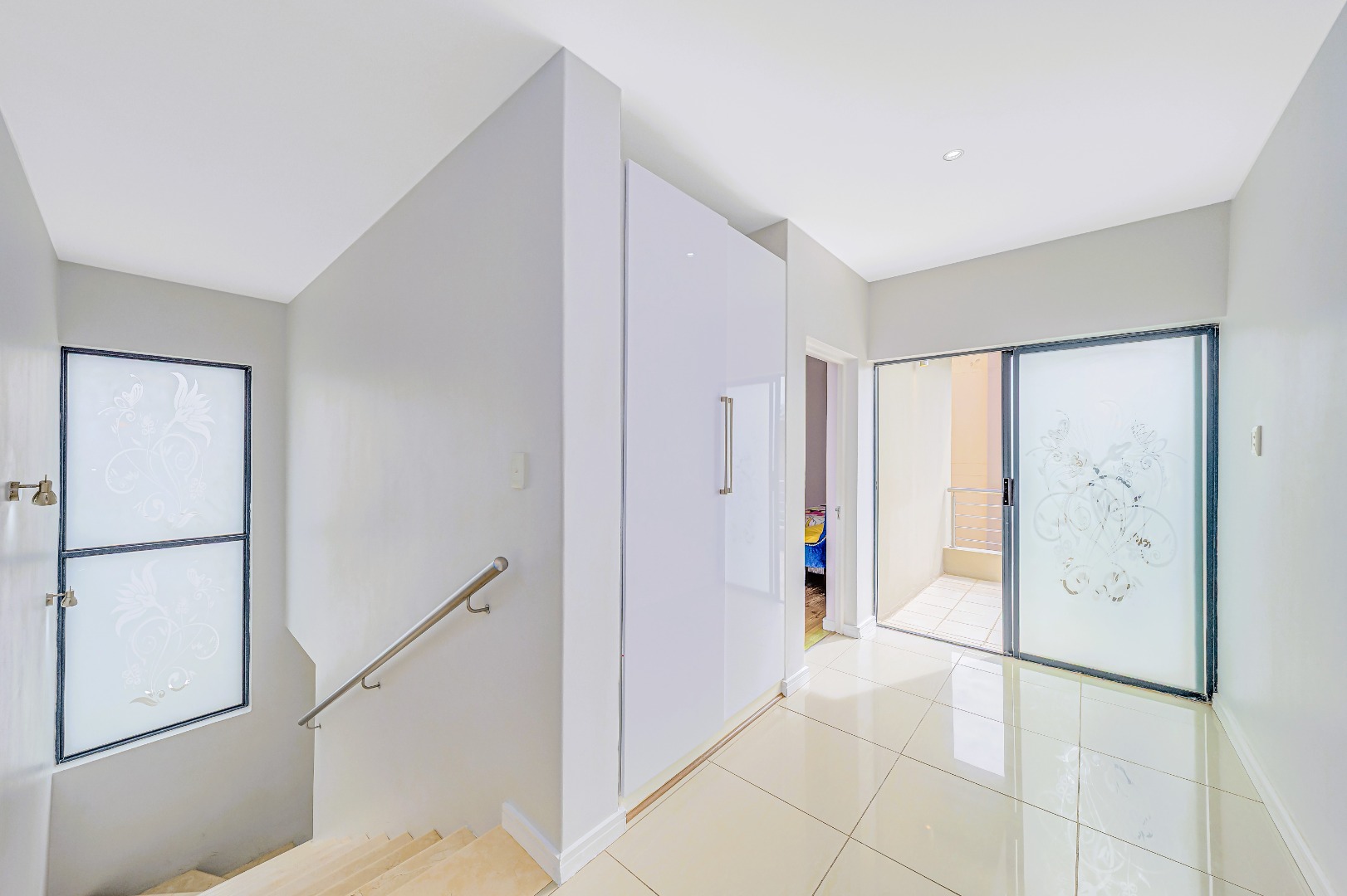 A sunny tiled entrance hall welcomes you into the open-plan lounge and dining area, complete with a cozy gas fireplace. The modern kitchen boasts Caesarstone countertops, a gas hob with electric oven, extractor, built-in microwave, and a separate scullery. There’s ample space for a double-door fridge and two appliances, with direct access from the automated double garage. The fourth bedroom, finished with laminate floors and built-in cupboards, opens onto the entertainment area and sparkling pool. A guest bathroom with shower, toilet, and basin completes the ground floor.