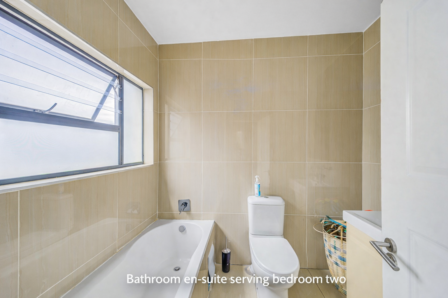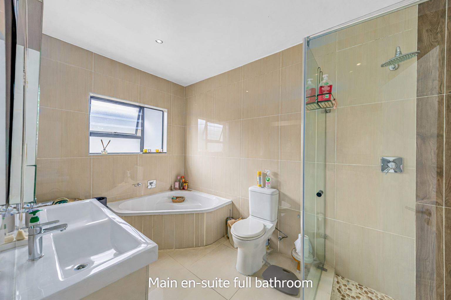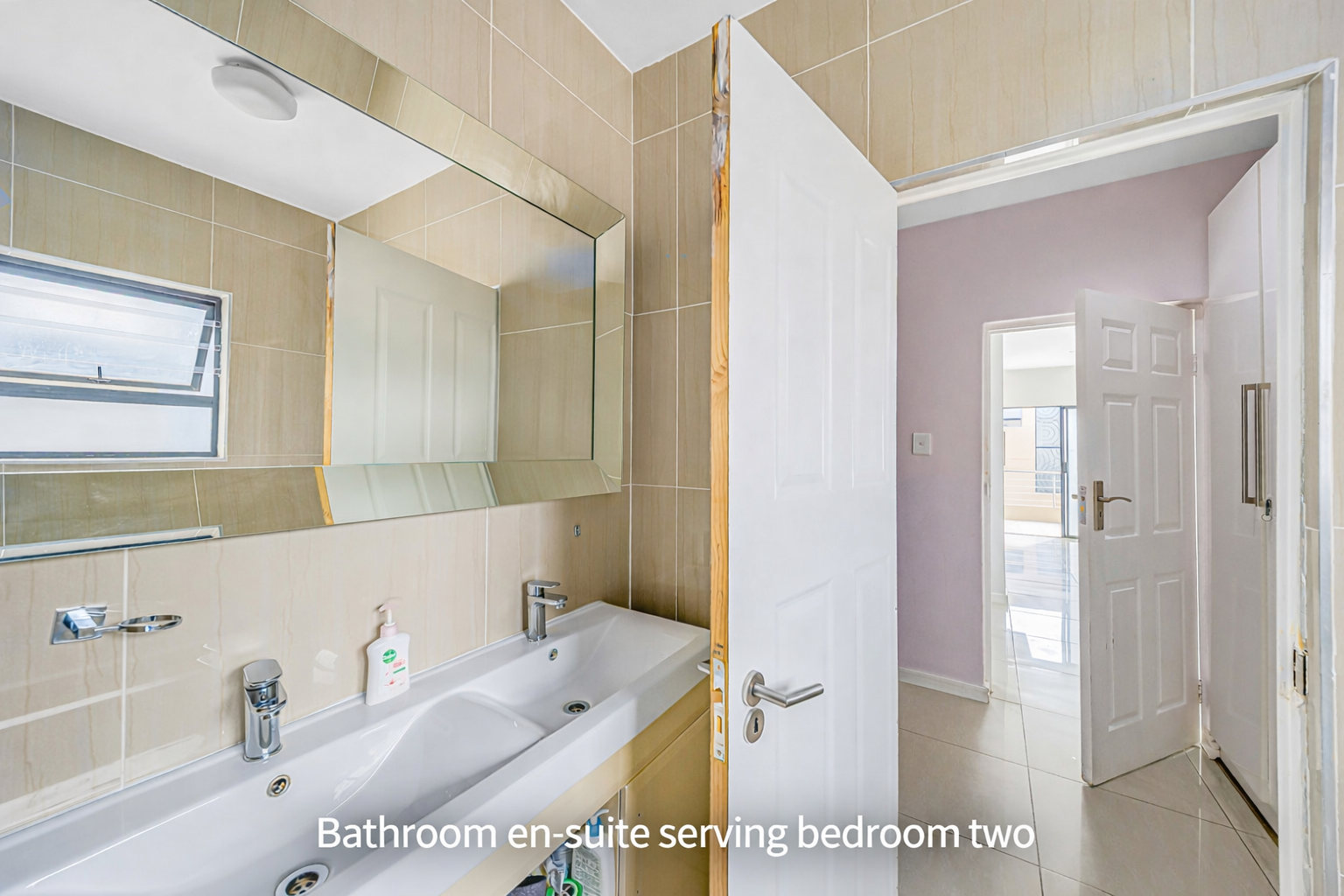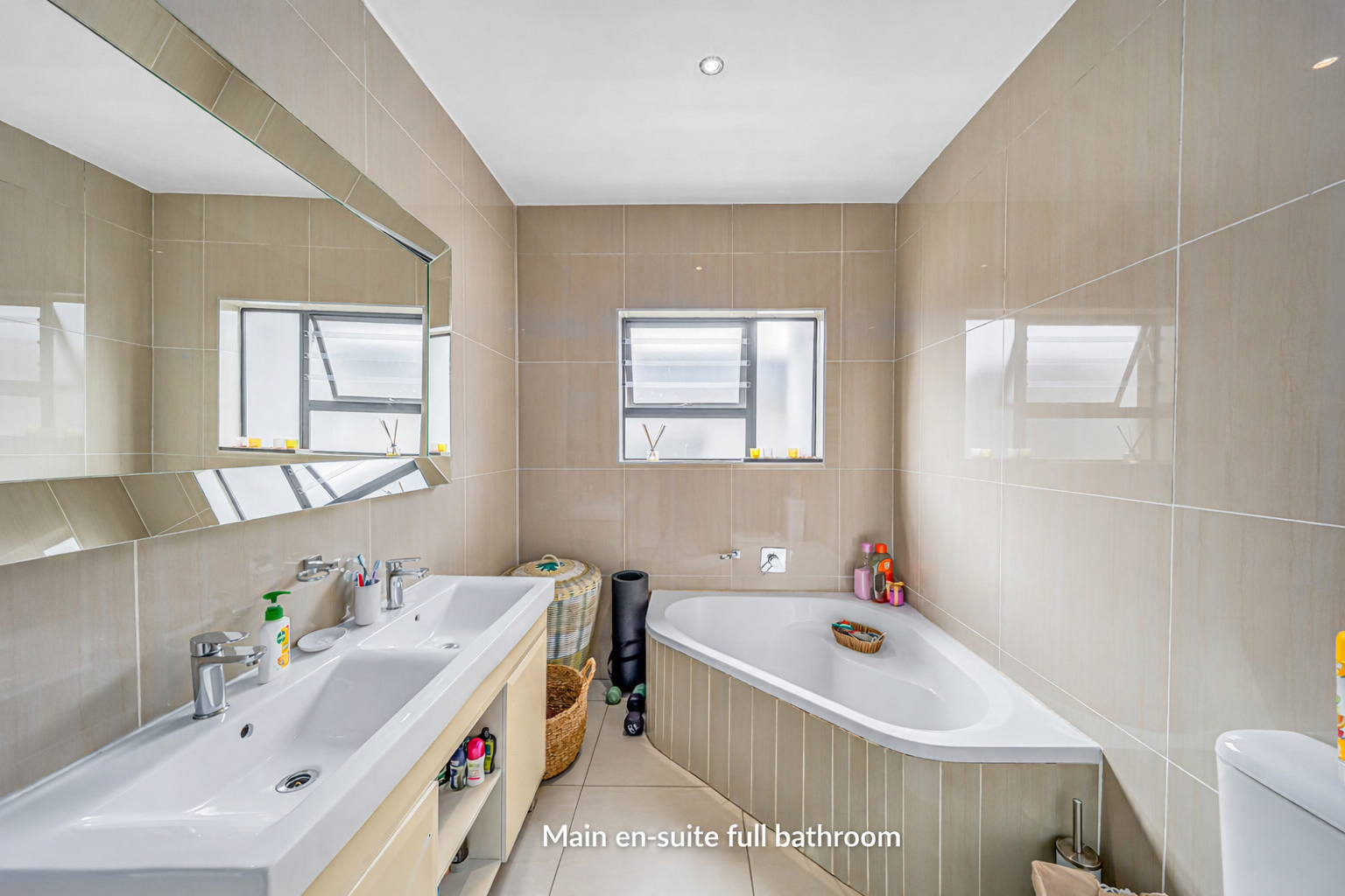 The first bedroom offers laminate floors, generous cupboard space, and a luxurious en suite with double vanity, bath, toilet, and basin. The second bedroom features laminate flooring, cupboards, and its own en suite with shower. The third and main bedroom includes a walk-in dresser and a full en suite with bath, shower, double basins, and toilet. A private balcony overlooks the garden, while a linen cupboard adds practical convenience.