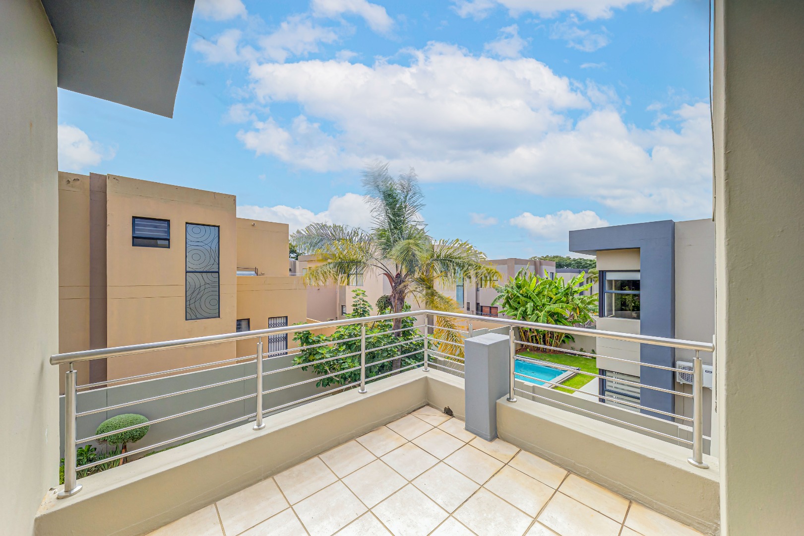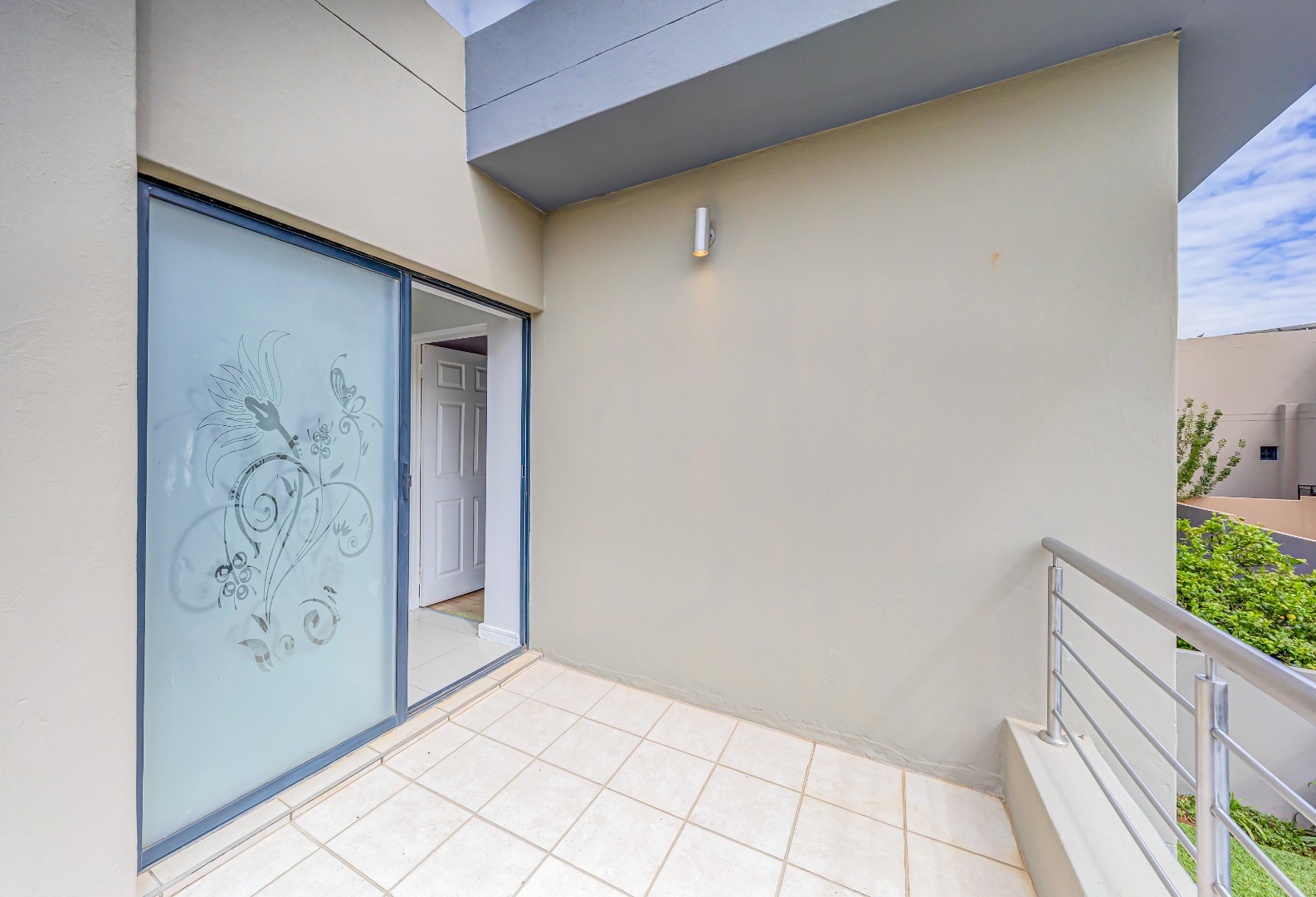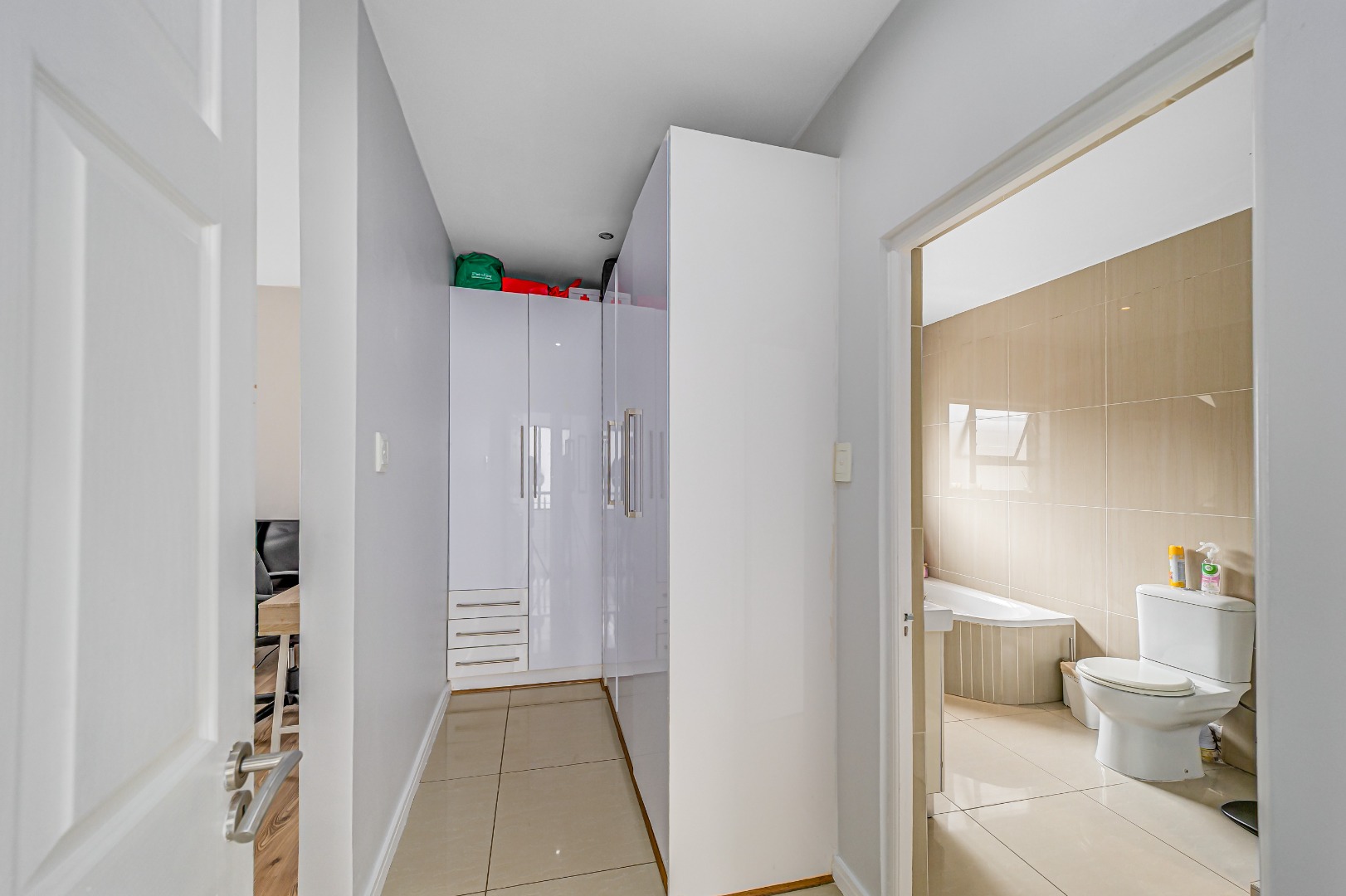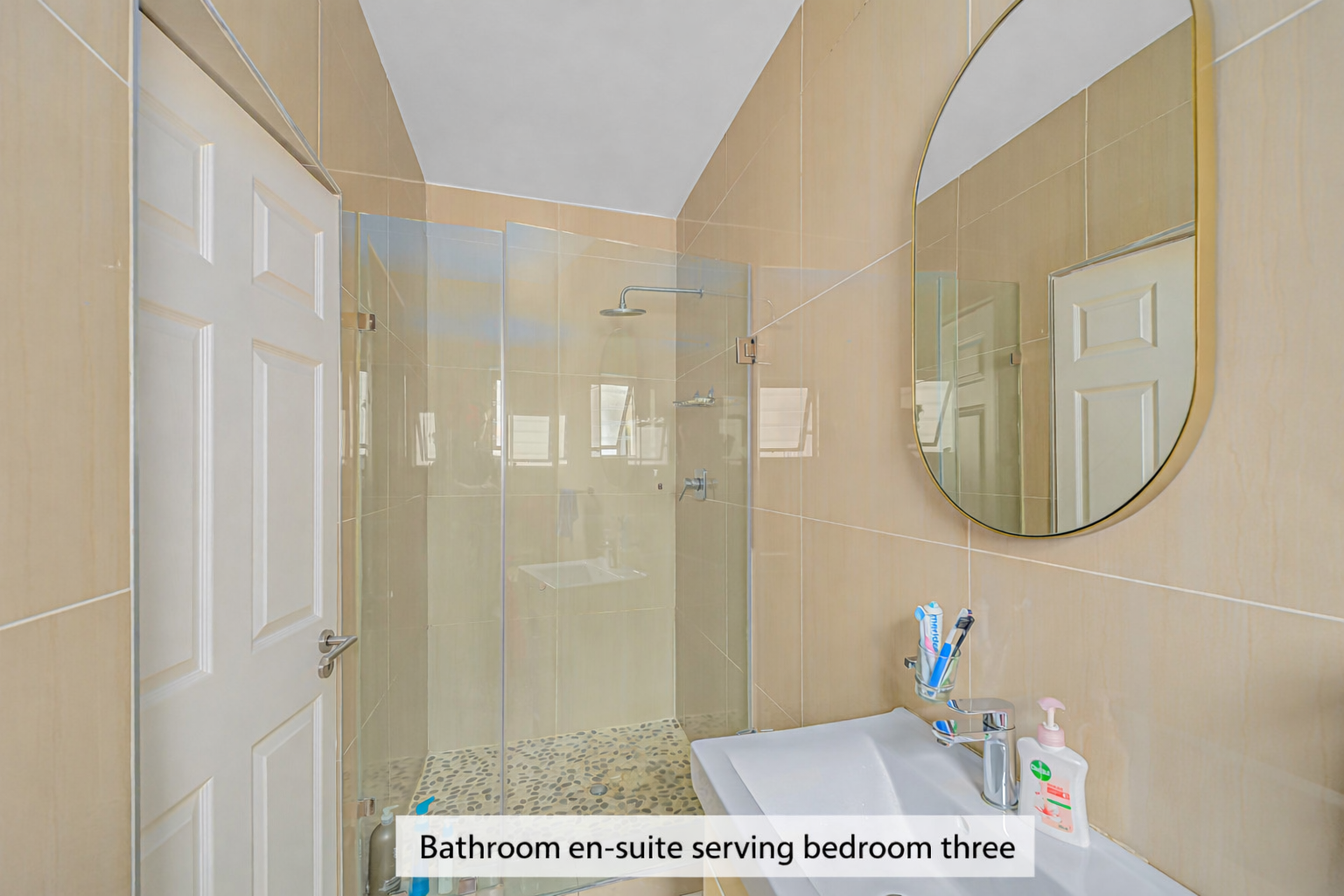 The first bedroom offers laminate floors, generous cupboard space, and a luxurious en suite with double vanity, bath, toilet, and basin. The second bedroom features laminate flooring, cupboards, and its own en suite with shower. The third and main bedroom includes a walk-in dresser and a full en suite with bath, shower, double basins, and toilet. A private balcony overlooks the garden, while a linen cupboard adds practical convenience.