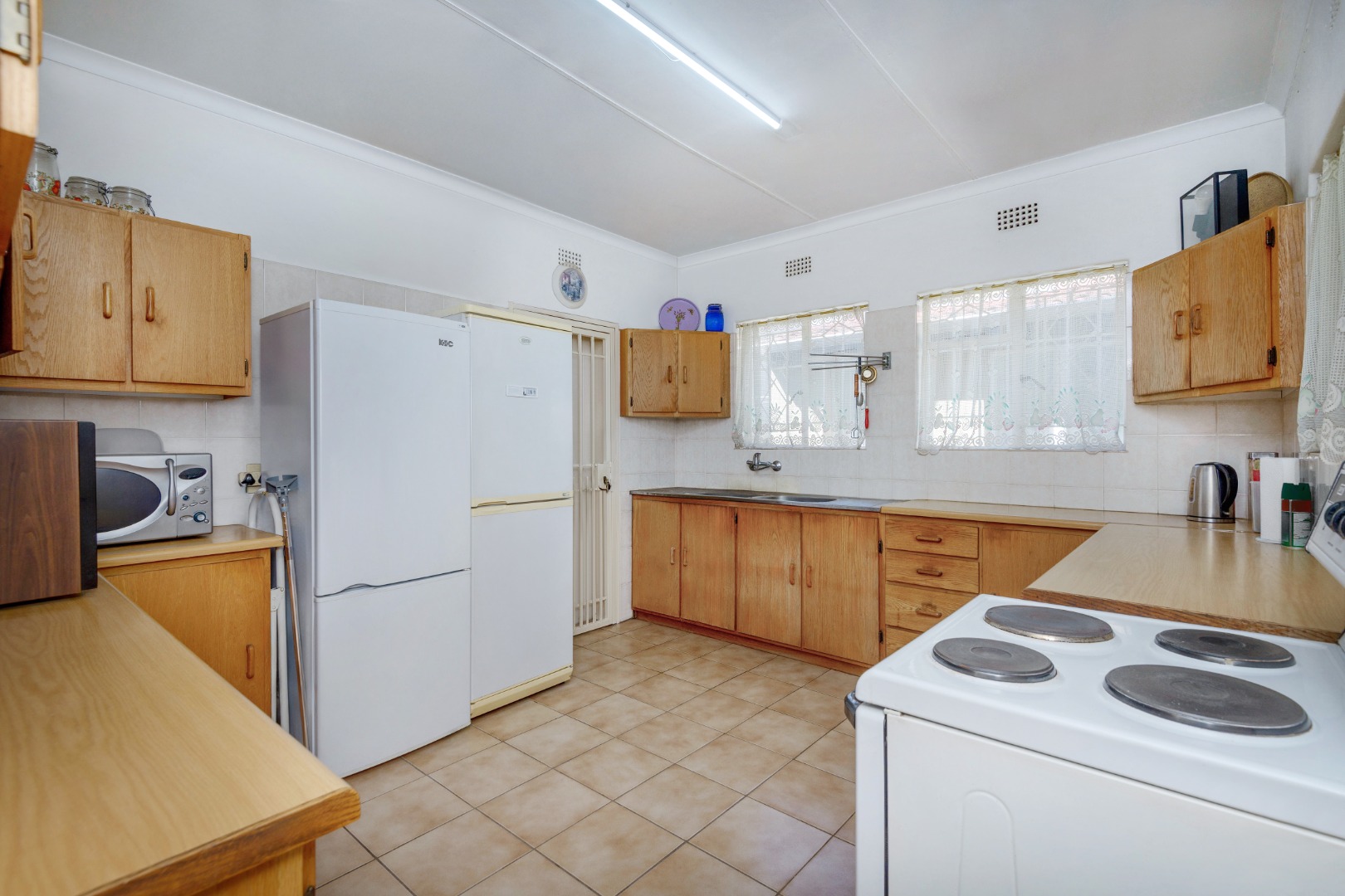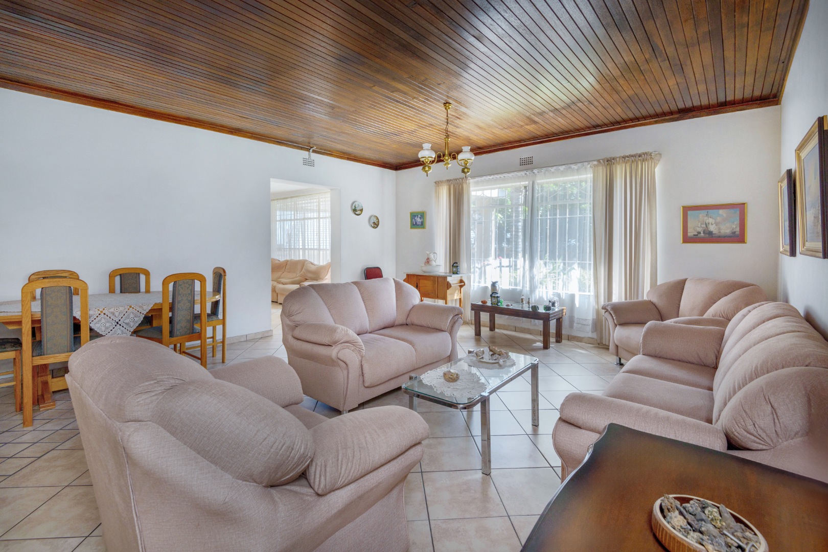 Inside, the home presents a functional layout spanning 272 sqm. It boasts two spacious lounges and an open-plan living and dining area, all featuring durable tiled flooring and benefiting from abundant natural light through large windows. A distinctive wooden slatted ceiling adds character to the main living spaces. The kitchen is equipped with ample wooden cabinetry, tiled floors, and sufficient counter space, accommodating essential appliances including two refrigerators, a stove, and a microwave, ensuring practicality for daily living.