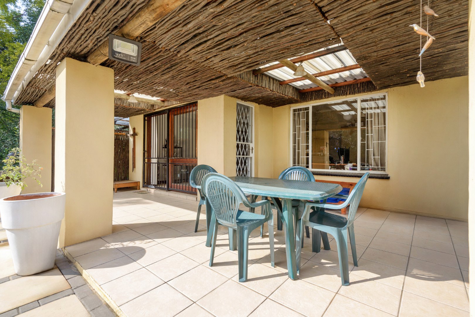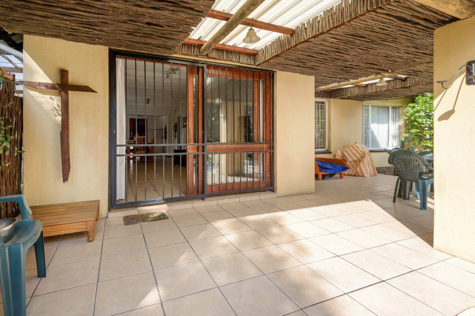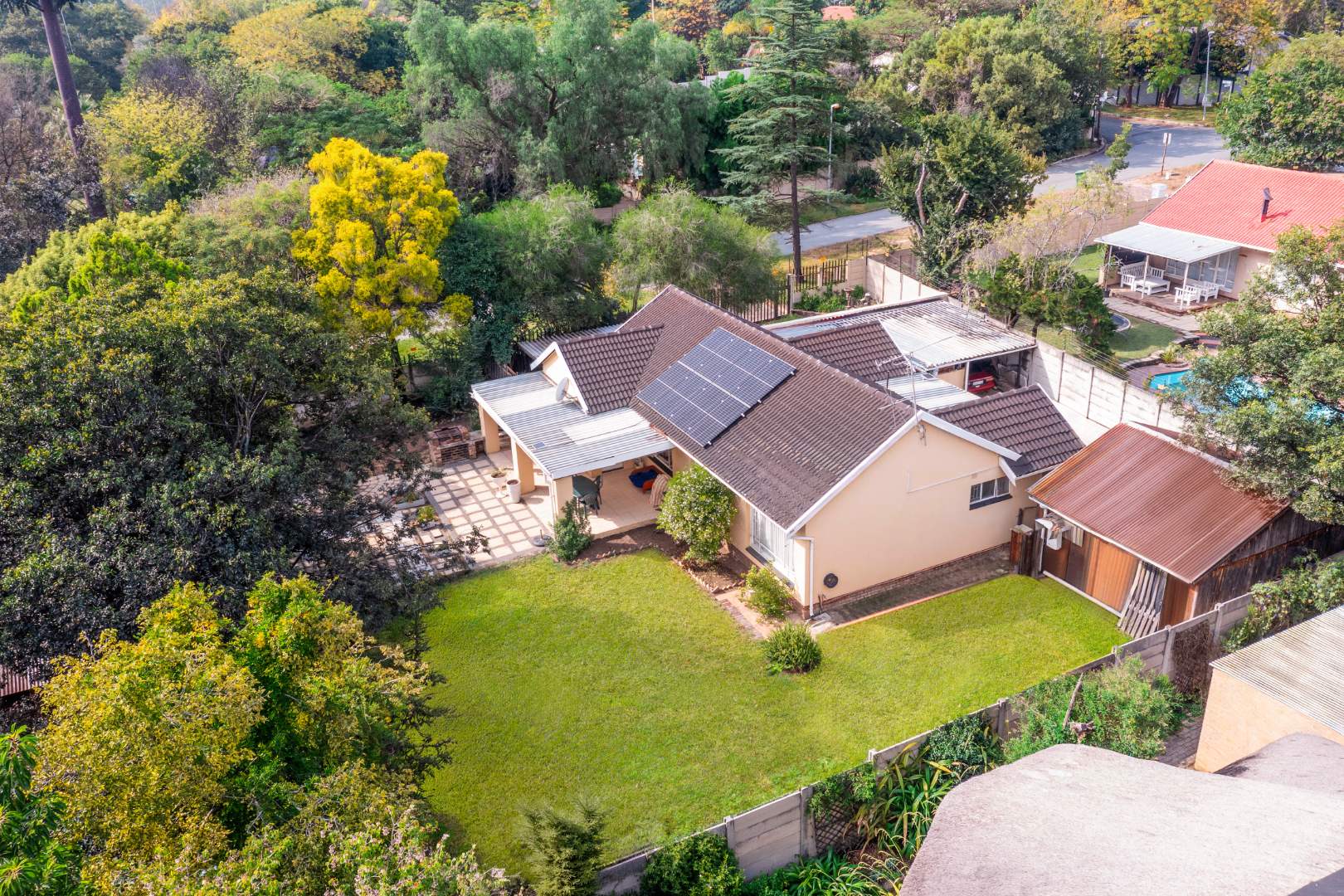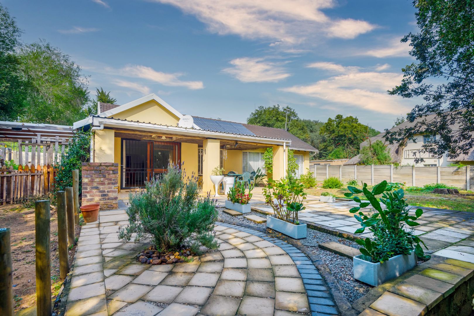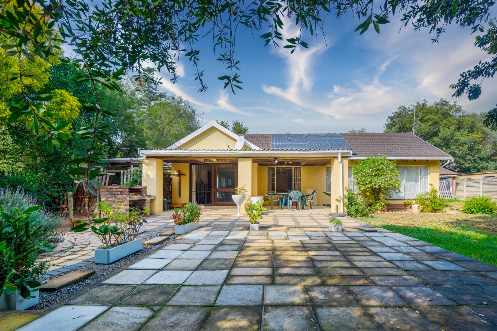 Externally, the property benefits from a double Hollywood garage and additional undercover parking, catering to multiple vehicles. The established garden, complemented by paving, offers a pleasant outdoor environment. For added peace of mind, the home is equipped with an alarm system, burglar bars, a security gate, and is totally walled, ensuring a secure living space. Practical additions include staff quarters, domestic rooms, and outside toilets.