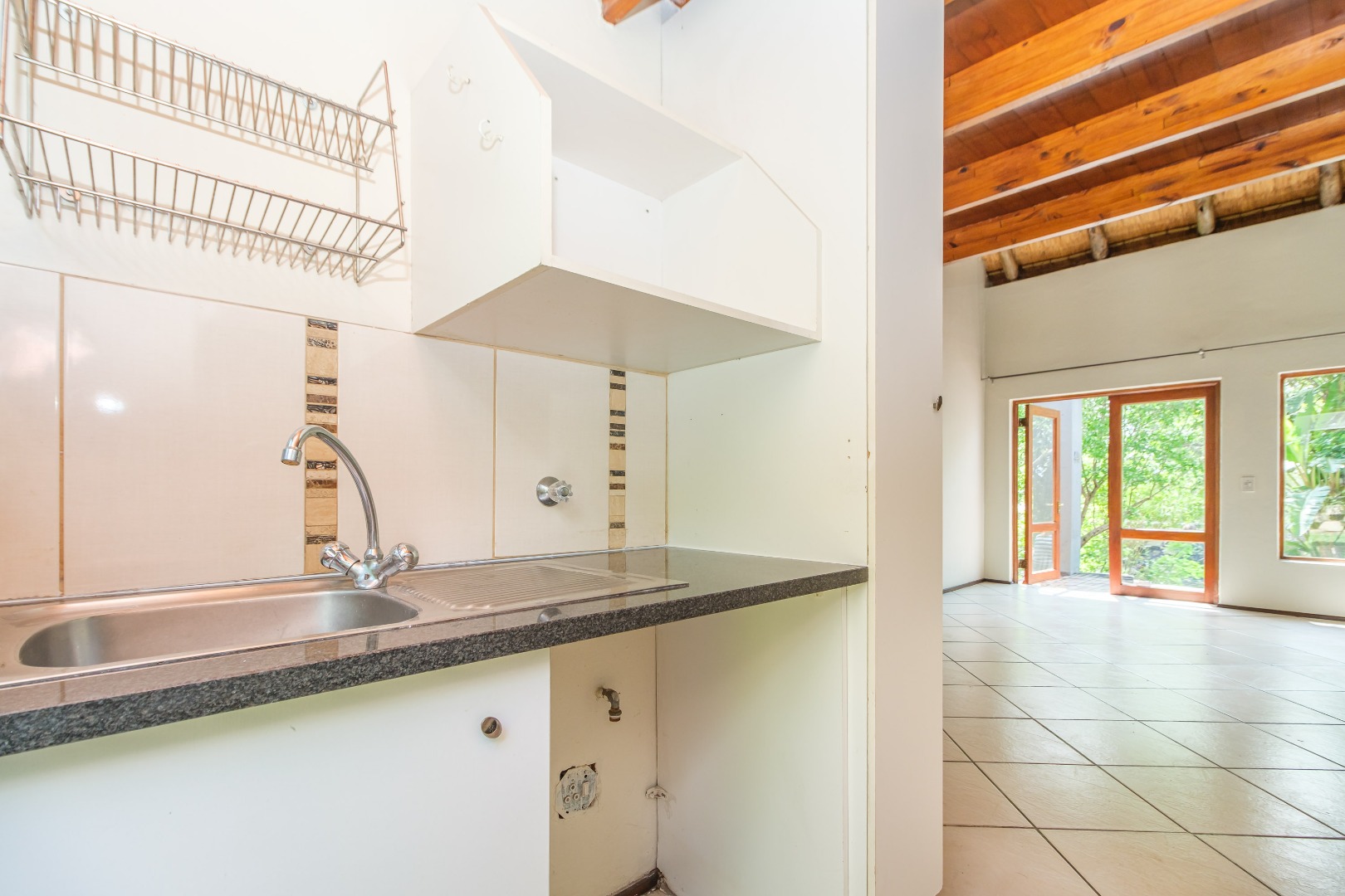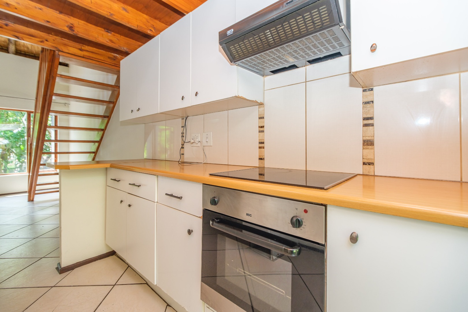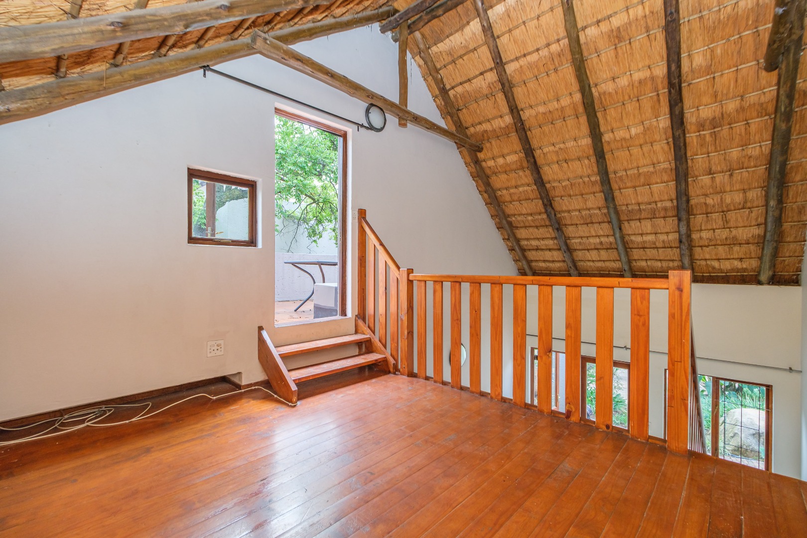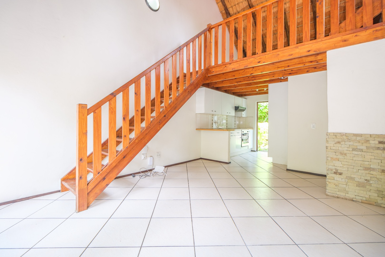 This charming 2-bedroom, 1-bath home, offers a unique blend of modern and rustic feel within Riverglades Estate. The interior features an inviting open-plan living area with bright white tiled flooring, seamlessly connecting to a compact, modern kitchen equipped with ample cupboards. A wooden staircase leads to loft area..
