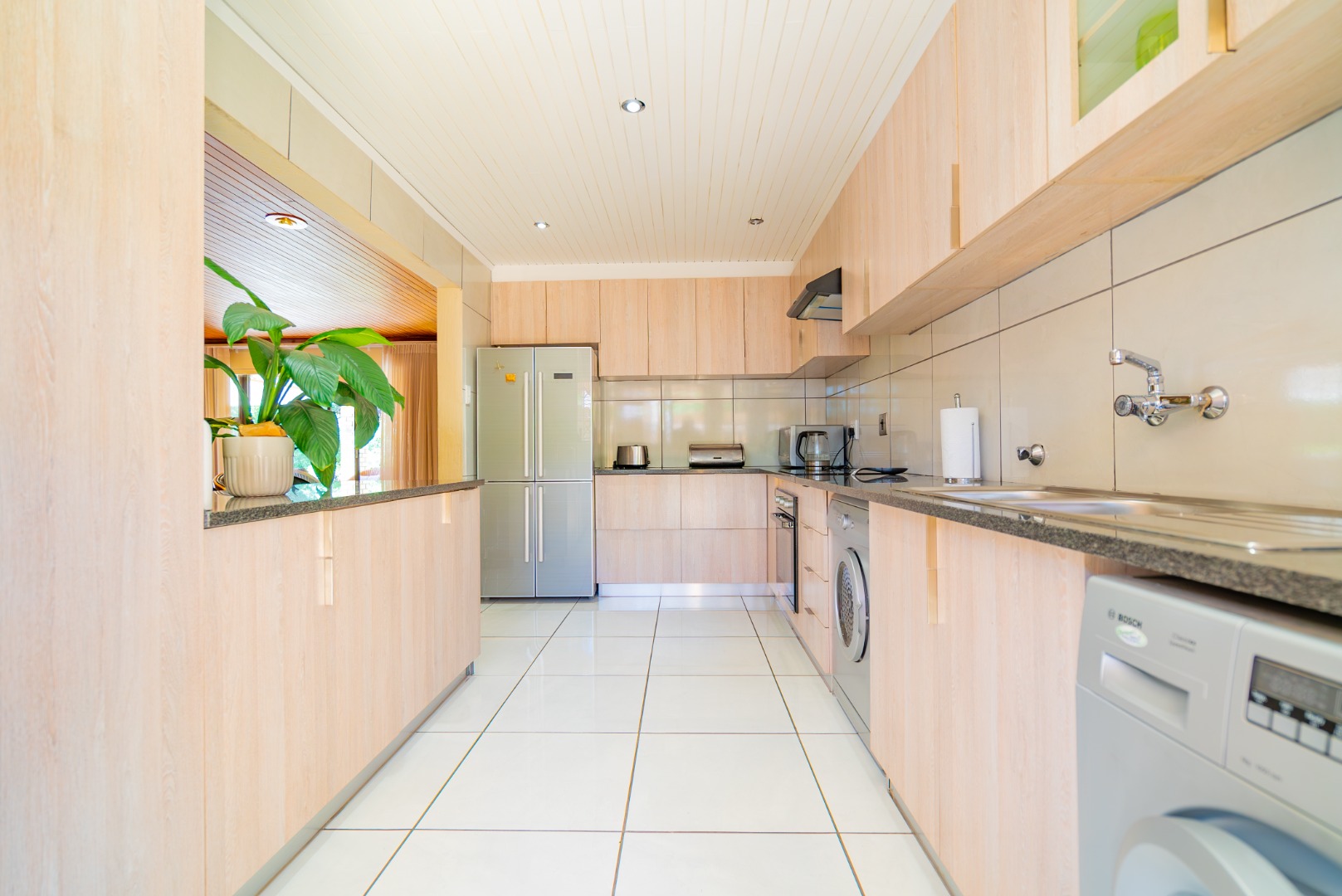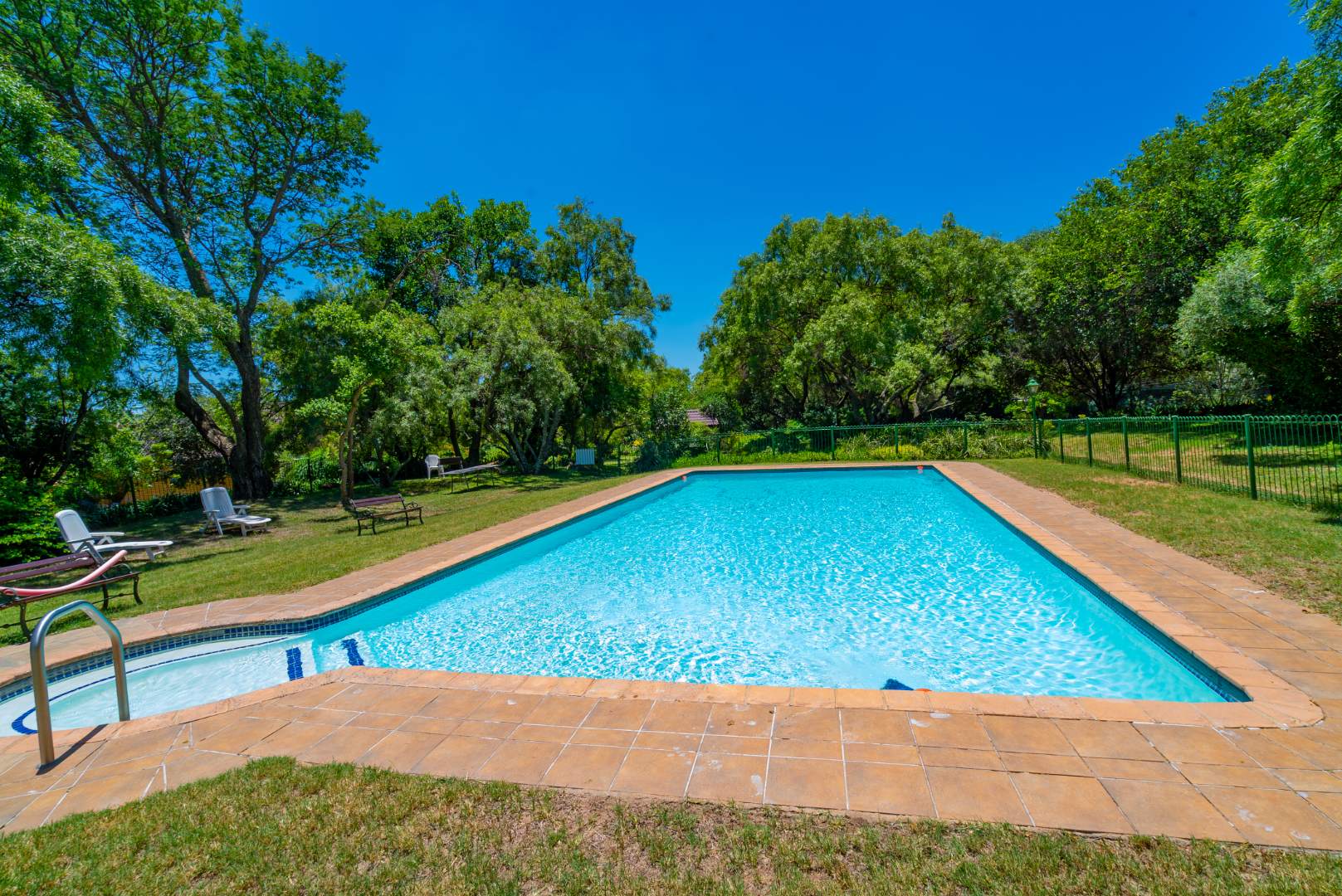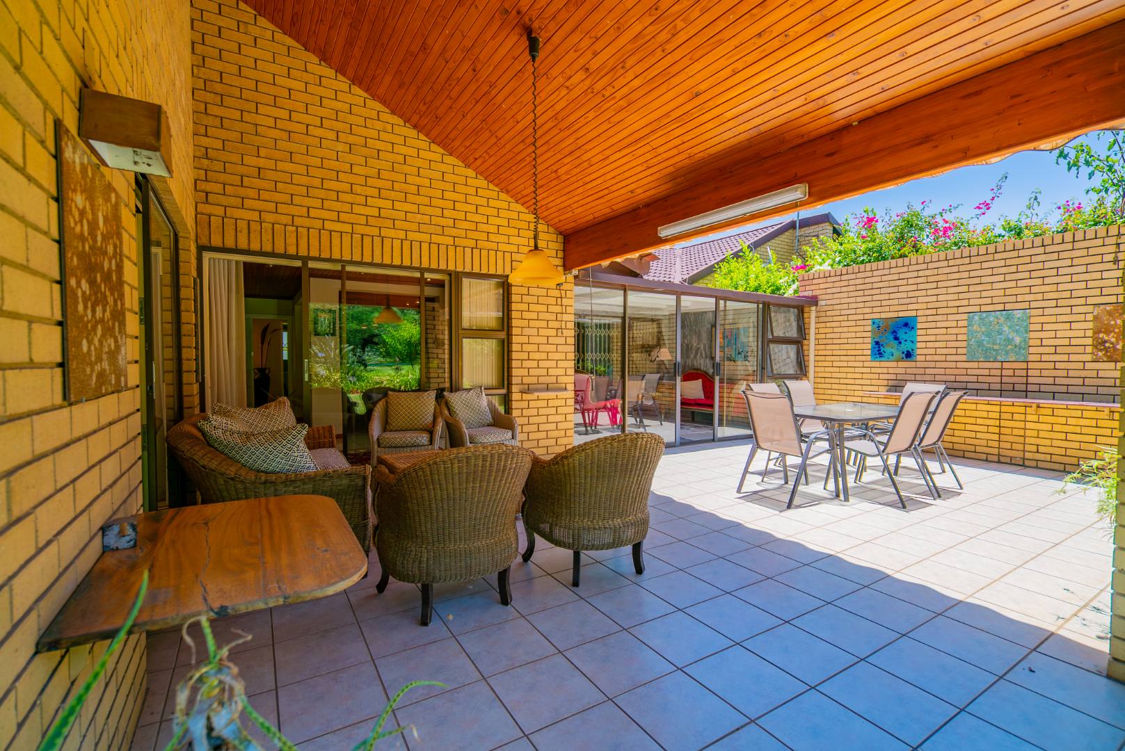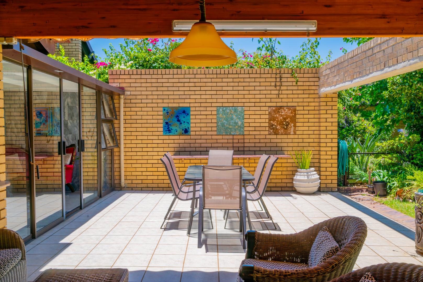 Step outside to a private patio, an idyllic spot for enjoying your morning coffee or al fresco dining, overlooking a beautifully maintained garden. The refreshing swimming pool offers a perfect retreat during warmer months. Set on an expansive 10028 sqm erf, the property provides a remarkable sense of openness and privacy, a rare find in residential settings.