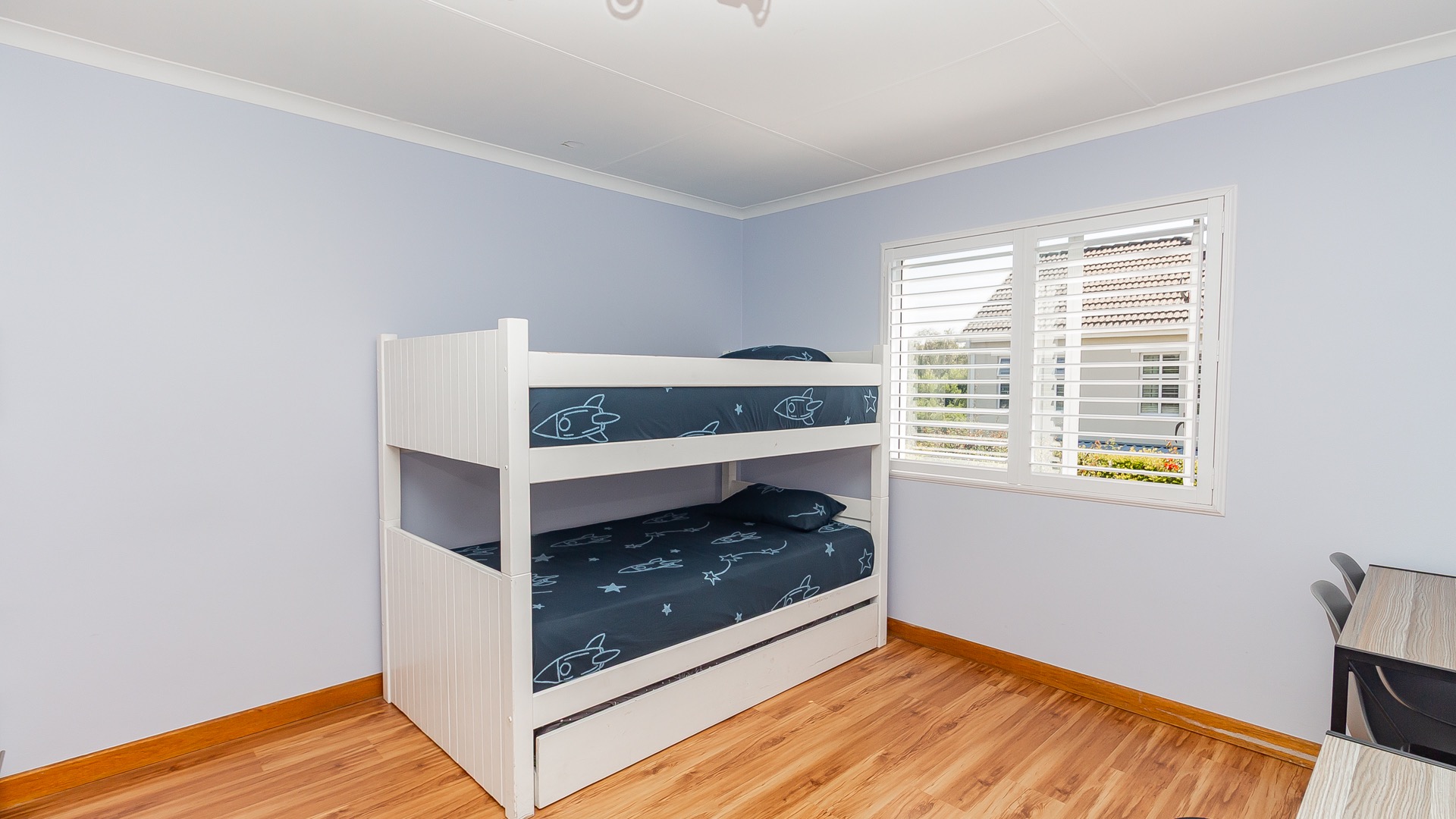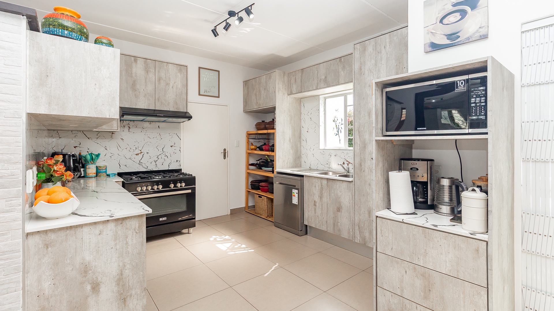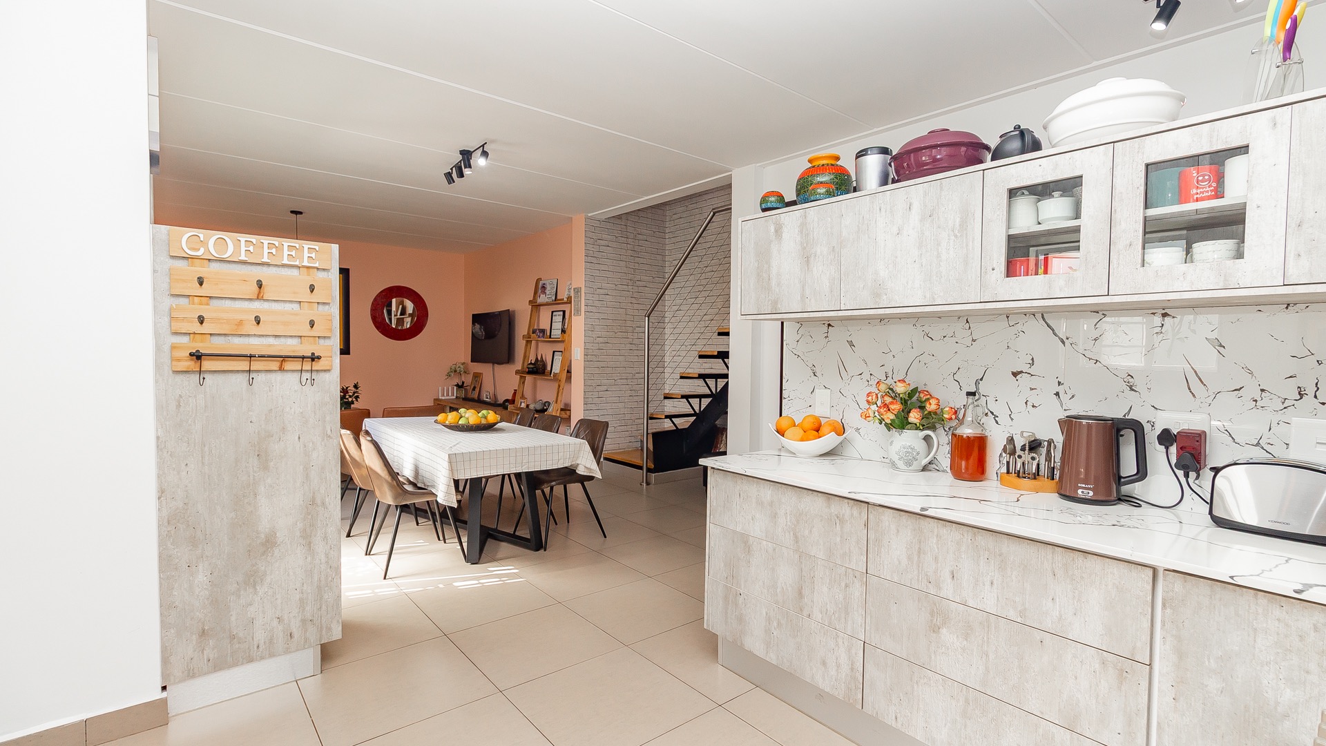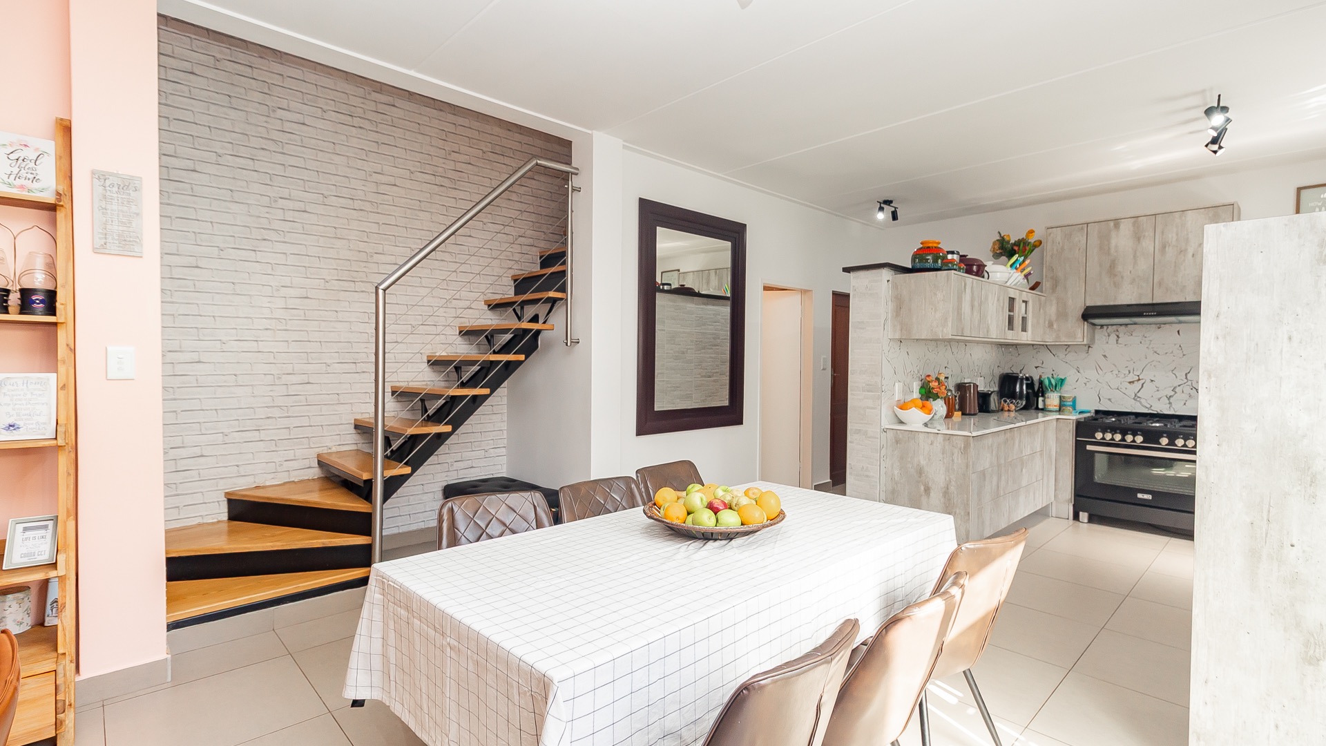 Downstairs, the living, dining and kitchen areas drift together with an easy, unhurried rhythm. The lounge opens onto the undercover patio, a space that naturally becomes the gathering place for braais, long afternoons and evenings that stretch comfortably into the night.