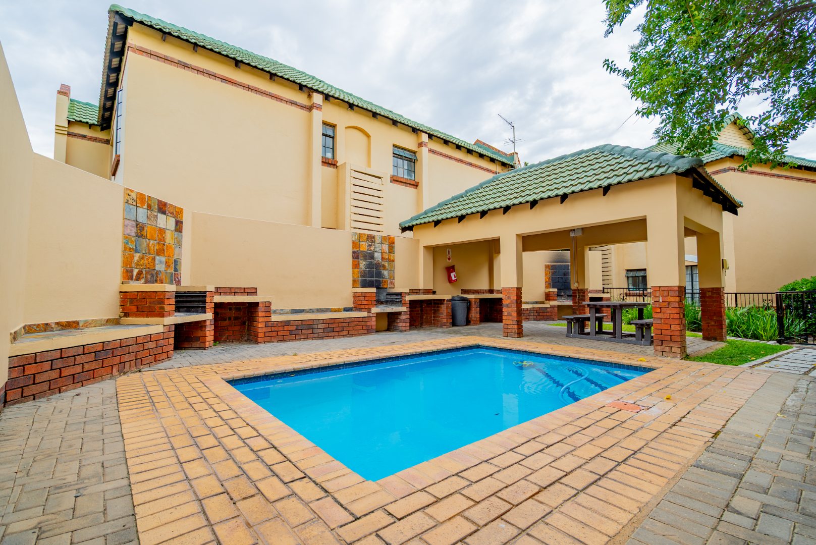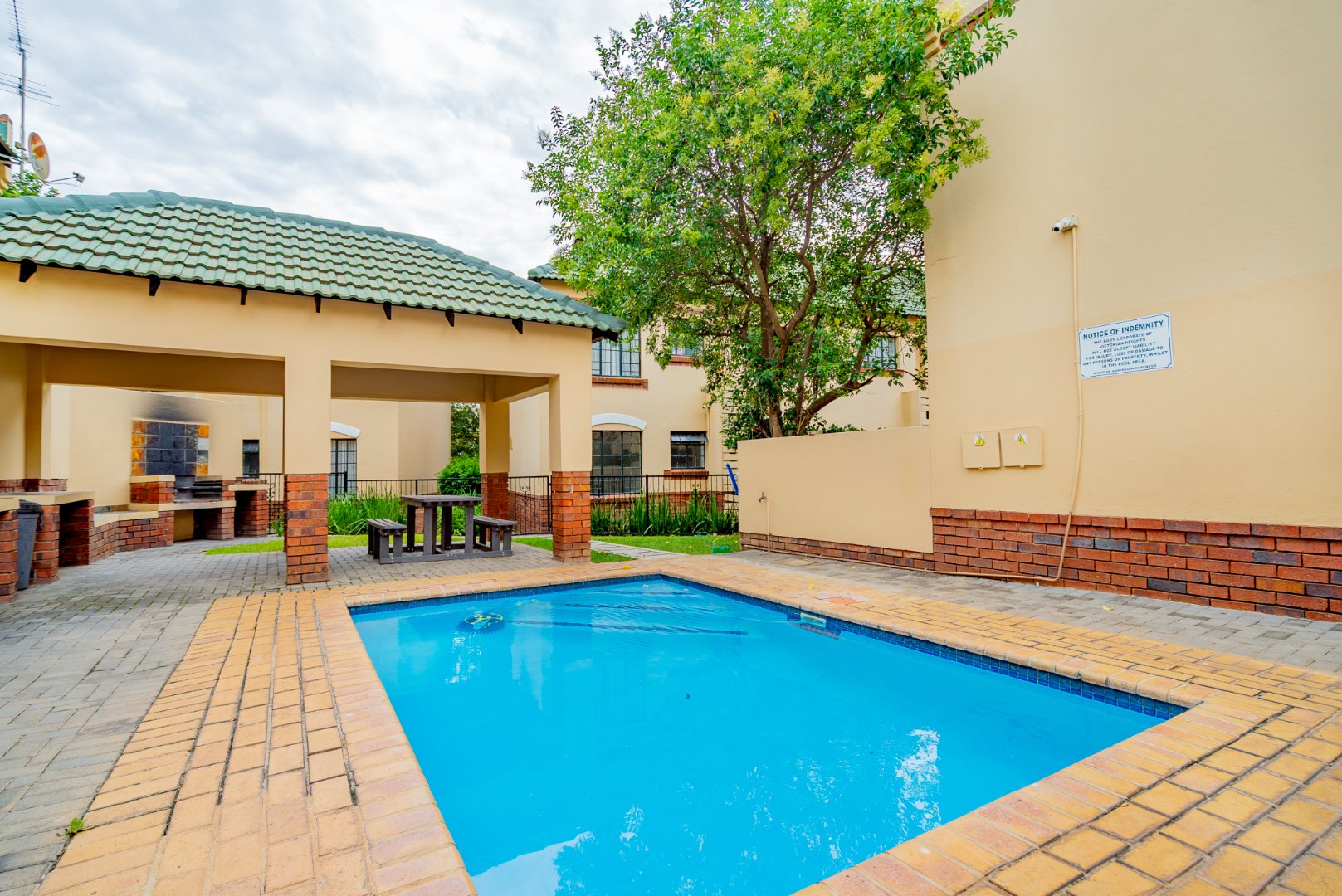 The complex immediately impresses with manicured gardens, strong gate security, a sparkling communal pool and covered social area — clear signs of solid management.