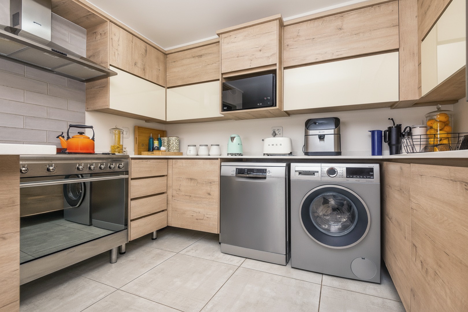 The modern kitchen features Smeg appliances, sleek cabinetry, and a breakfast counter designed for easy, sociable living.