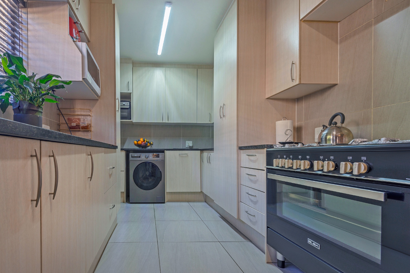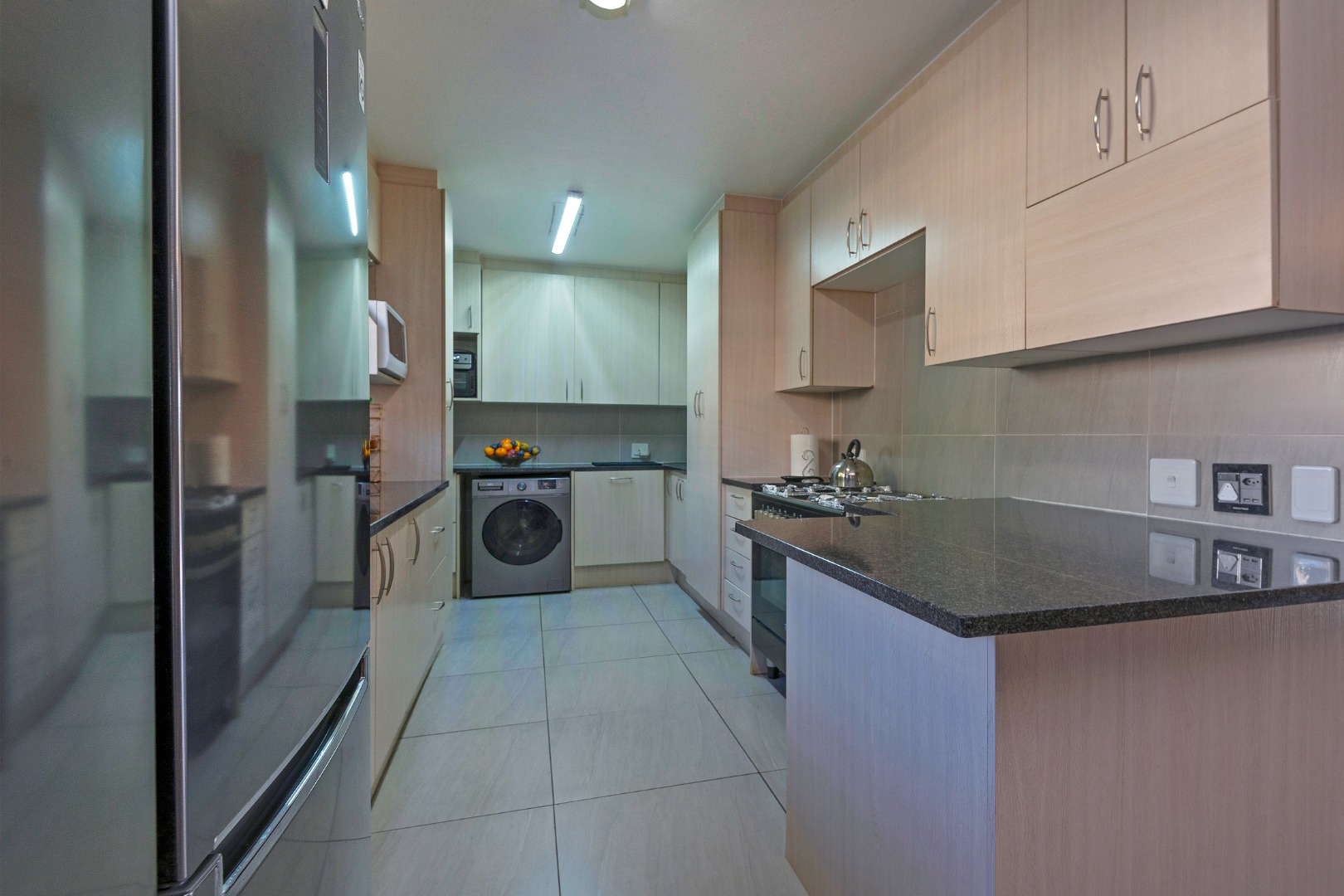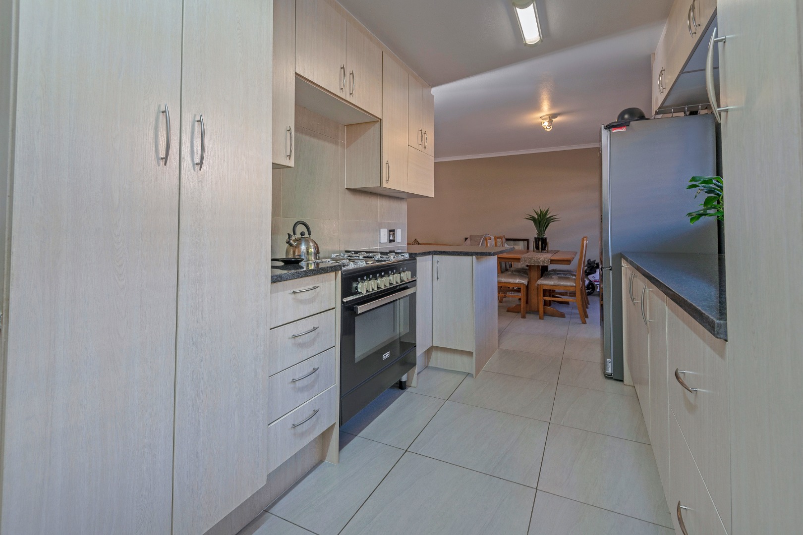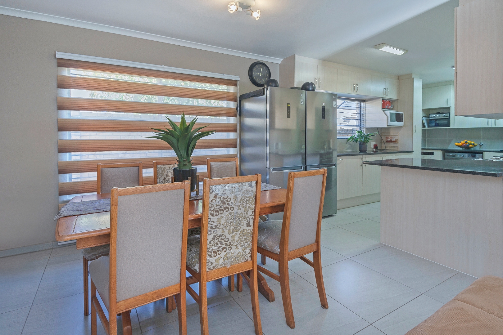 The spacious lounge and dining area flow seamlessly into a stylish kitchen featuring granite countertops, gas, ample cupboard space,