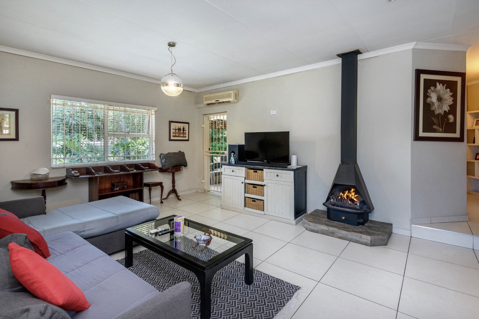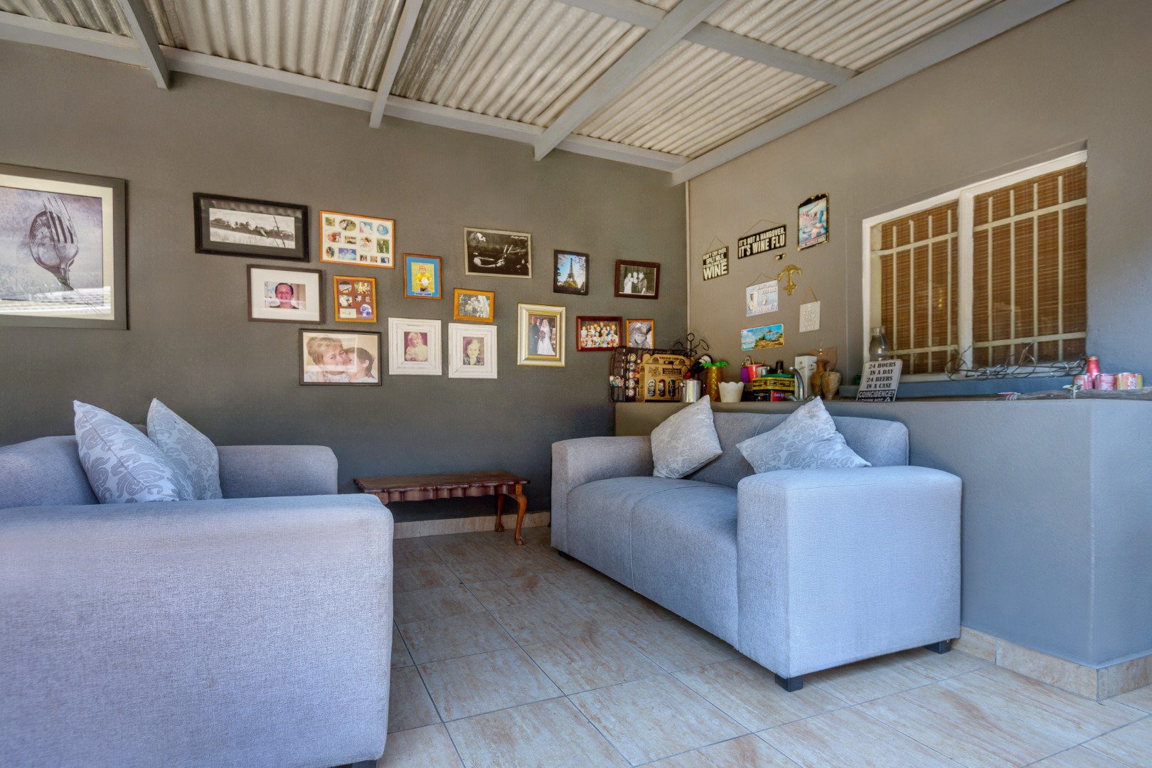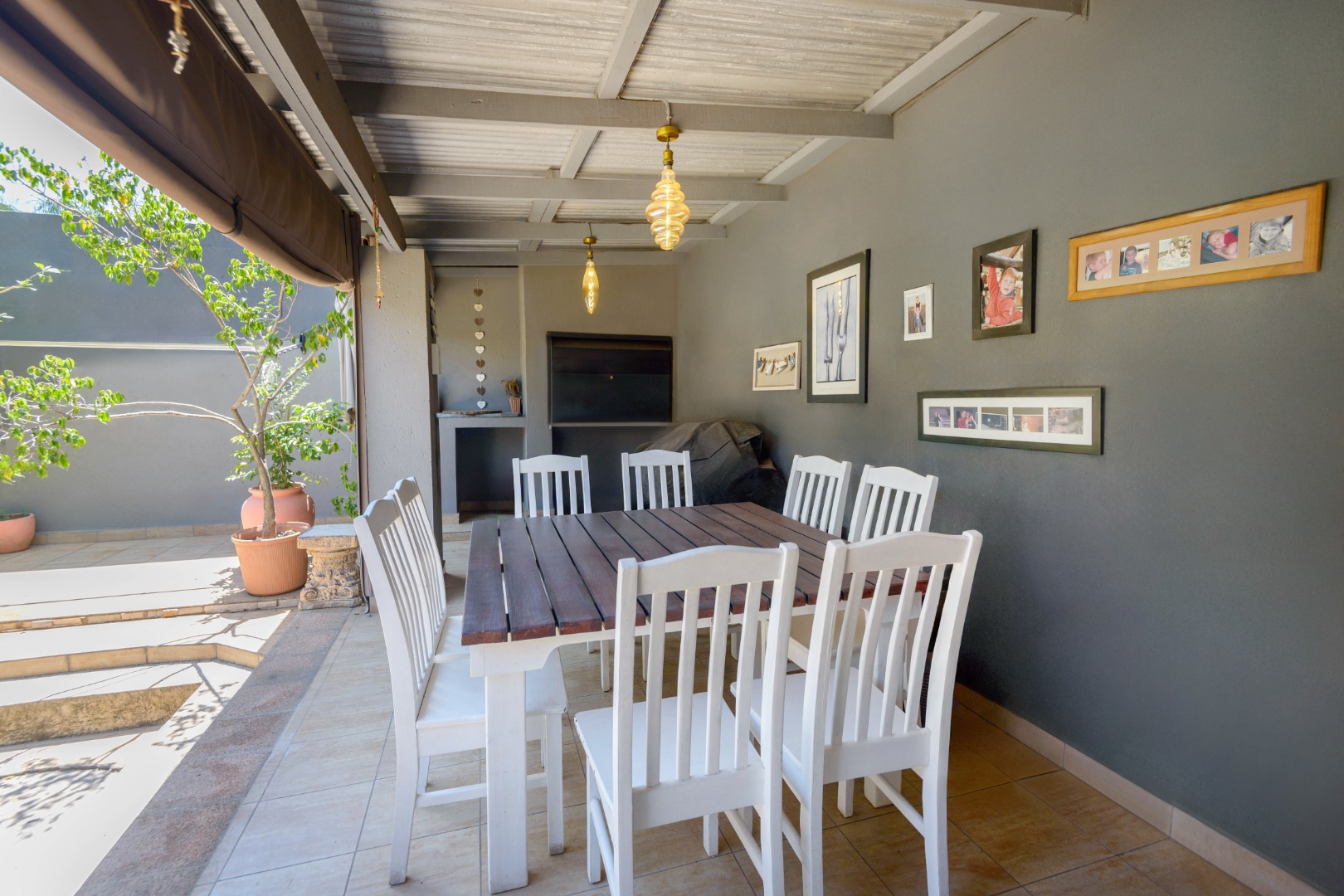 The outdoor spaces are a true highlight, designed for tranquil living and entertaining. A verdant, covered patio extends from the interior, offering a shaded oasis with ample seating, perfect for al fresco dining. A dedicated entertainment patio includes a built-in braai, ideal for hosting gatherings. Security is enhanced by visible burglar bars and a security gate. This home provides convenient access to local amenities.