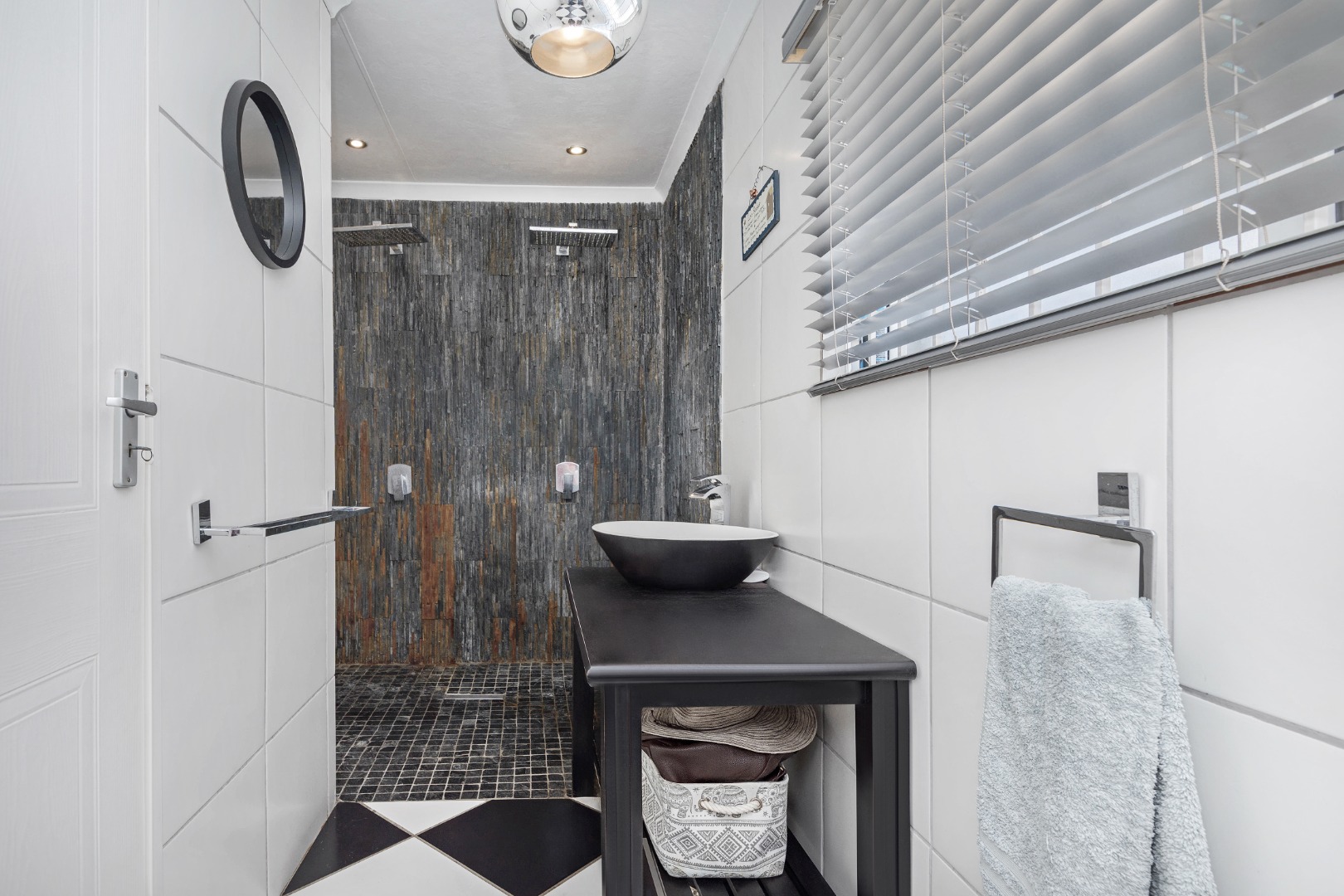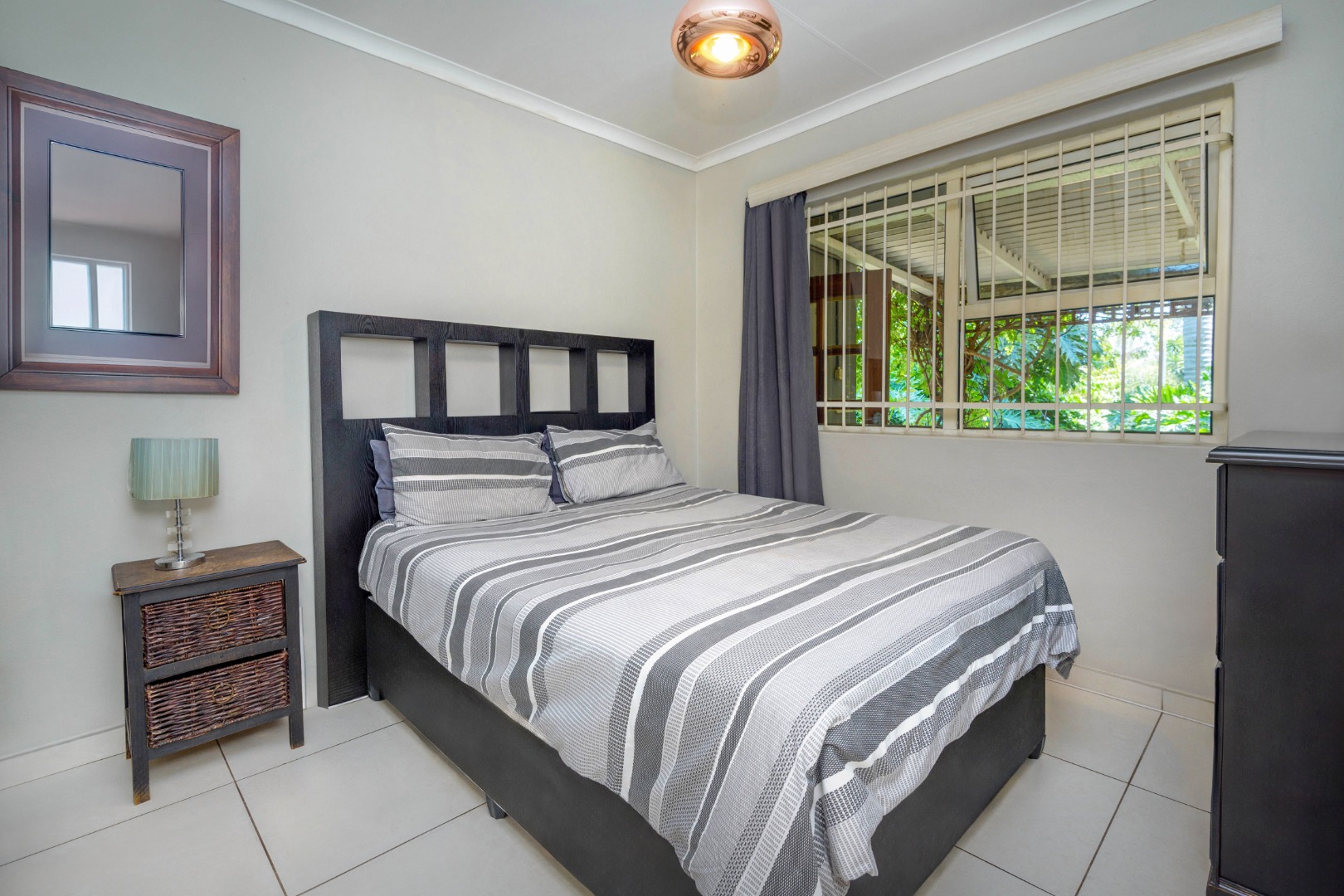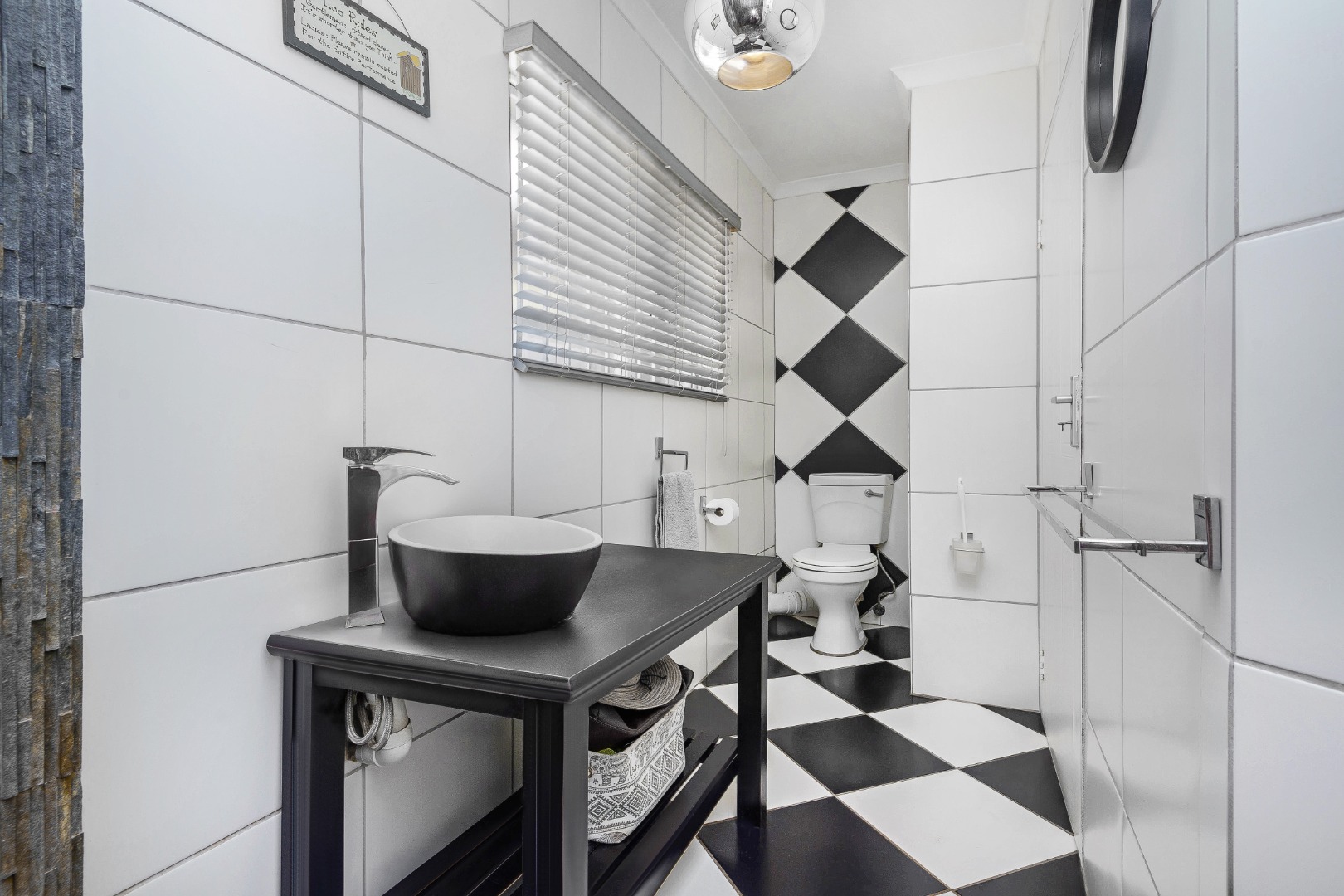 The outdoor spaces are a true highlight, designed for tranquil living and entertaining. A verdant, covered patio extends from the interior, offering a shaded oasis with ample seating, perfect for al fresco dining. A dedicated entertainment patio includes a built-in braai, ideal for hosting gatherings. Security is enhanced by visible burglar bars and a security gate. This home provides convenient access to local amenities.