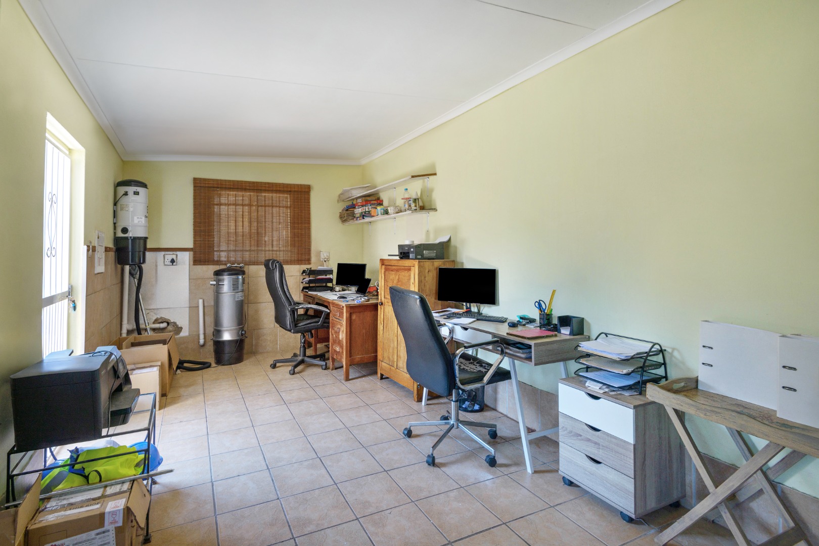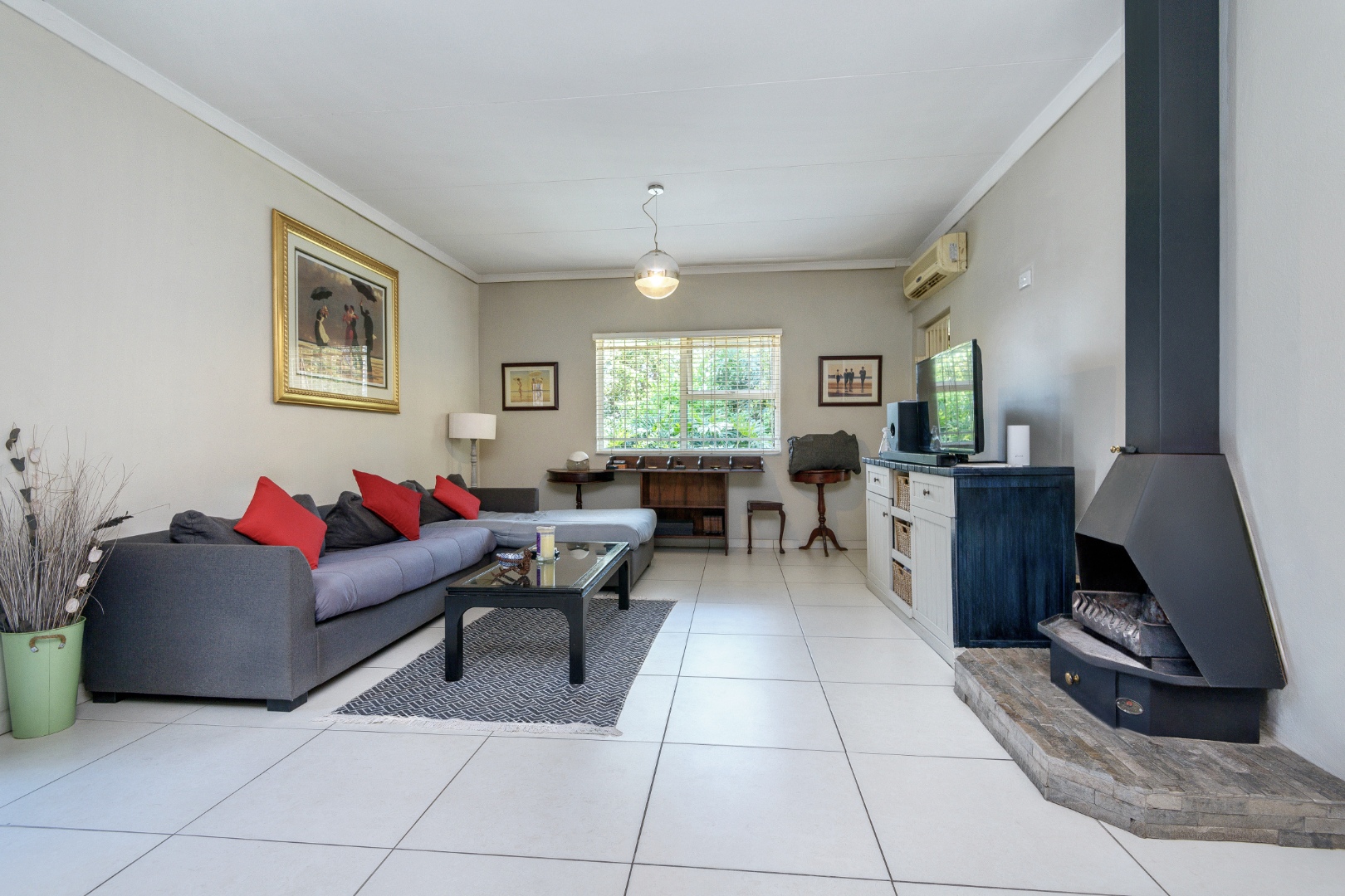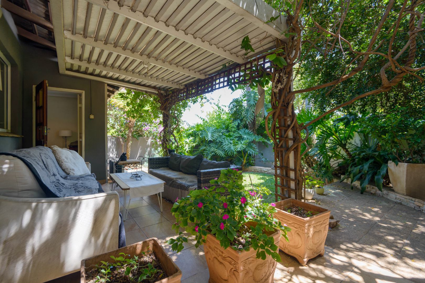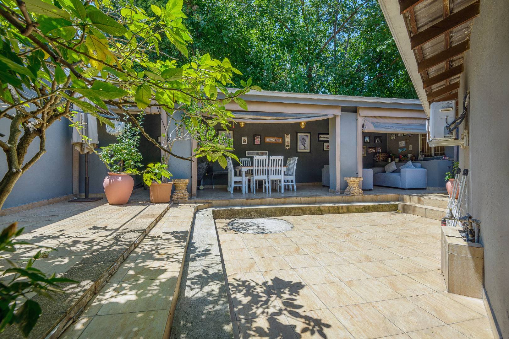 The outdoor spaces are a true highlight, designed for tranquil living and entertaining. A verdant, covered patio extends from the interior, offering a shaded oasis with ample seating, perfect for al fresco dining. A dedicated entertainment patio includes a built-in braai, ideal for hosting gatherings. Security is enhanced by visible burglar bars and a security gate. This home provides convenient access to local amenities.