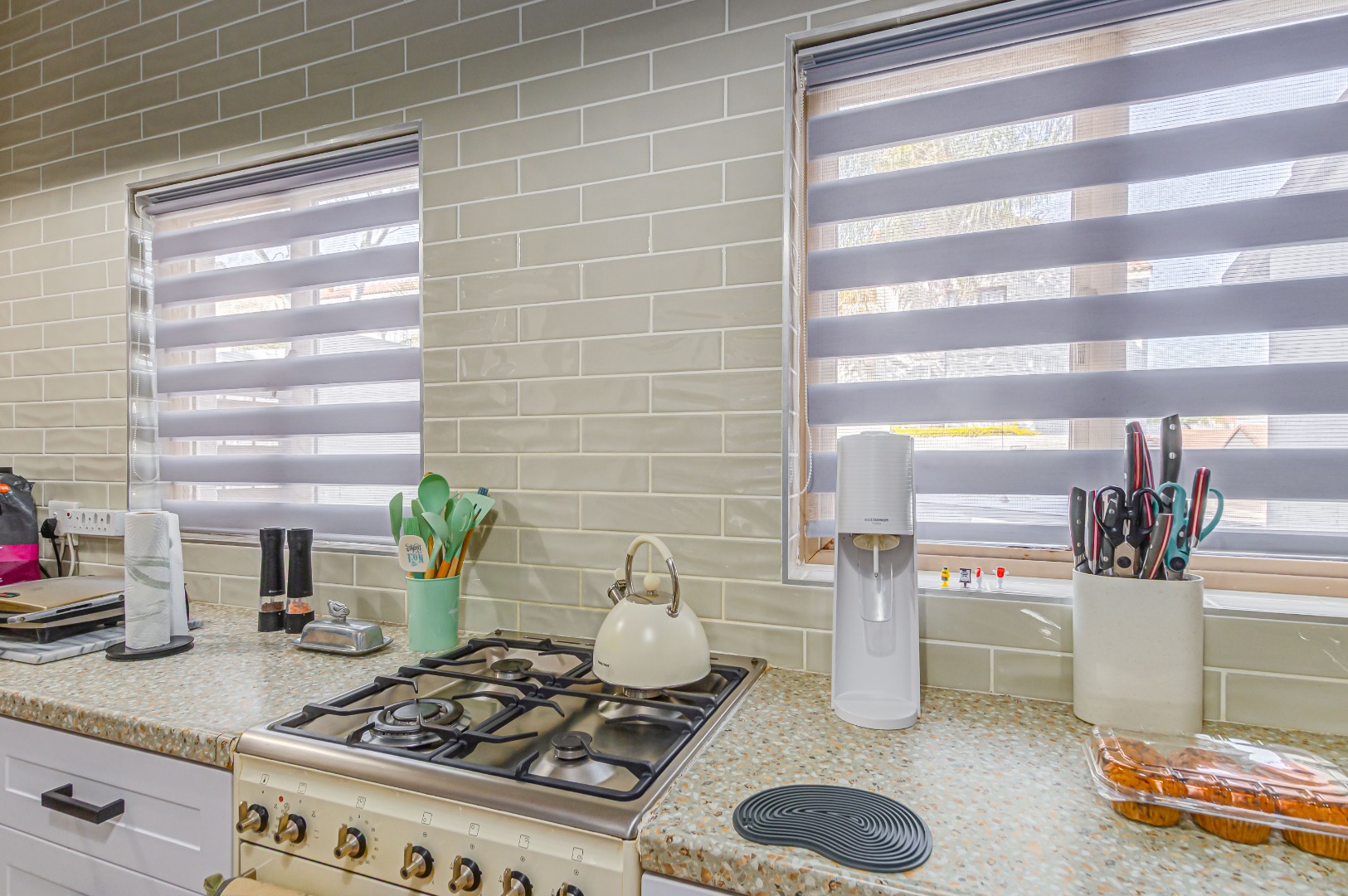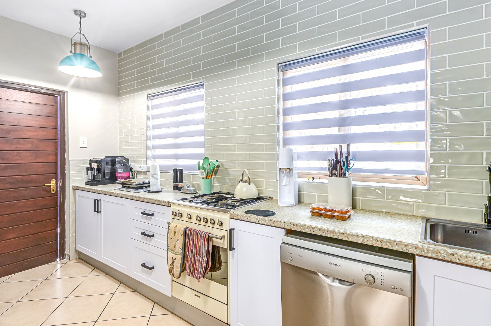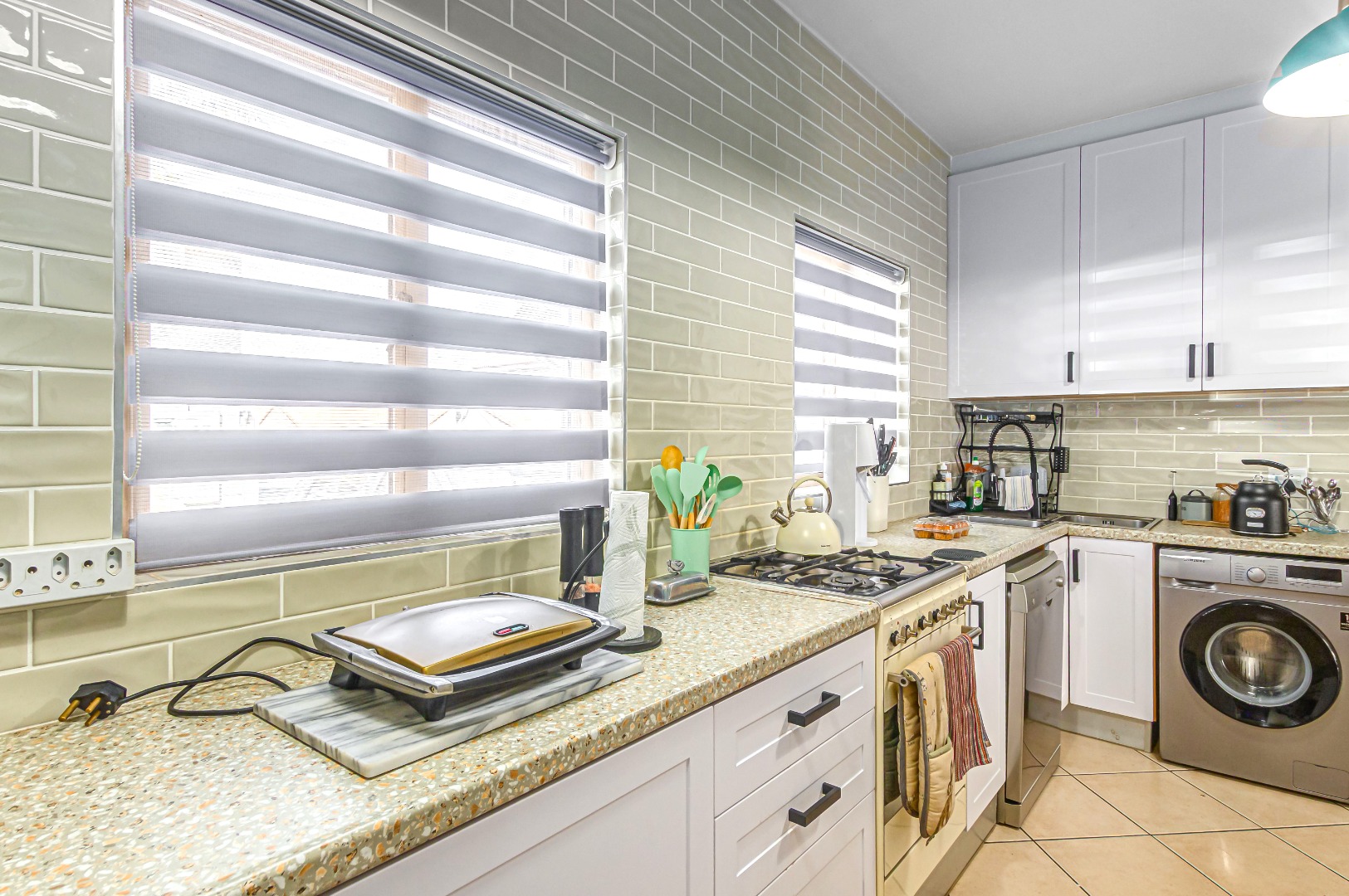 The modern kitchen offers a gas hob and oven, space for two appliances, room for a double-door fridge, and a walk-in pantry.