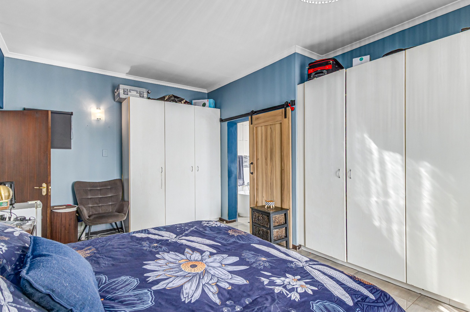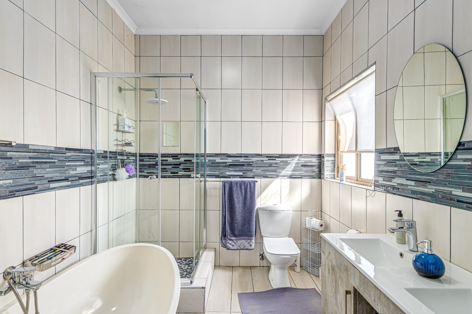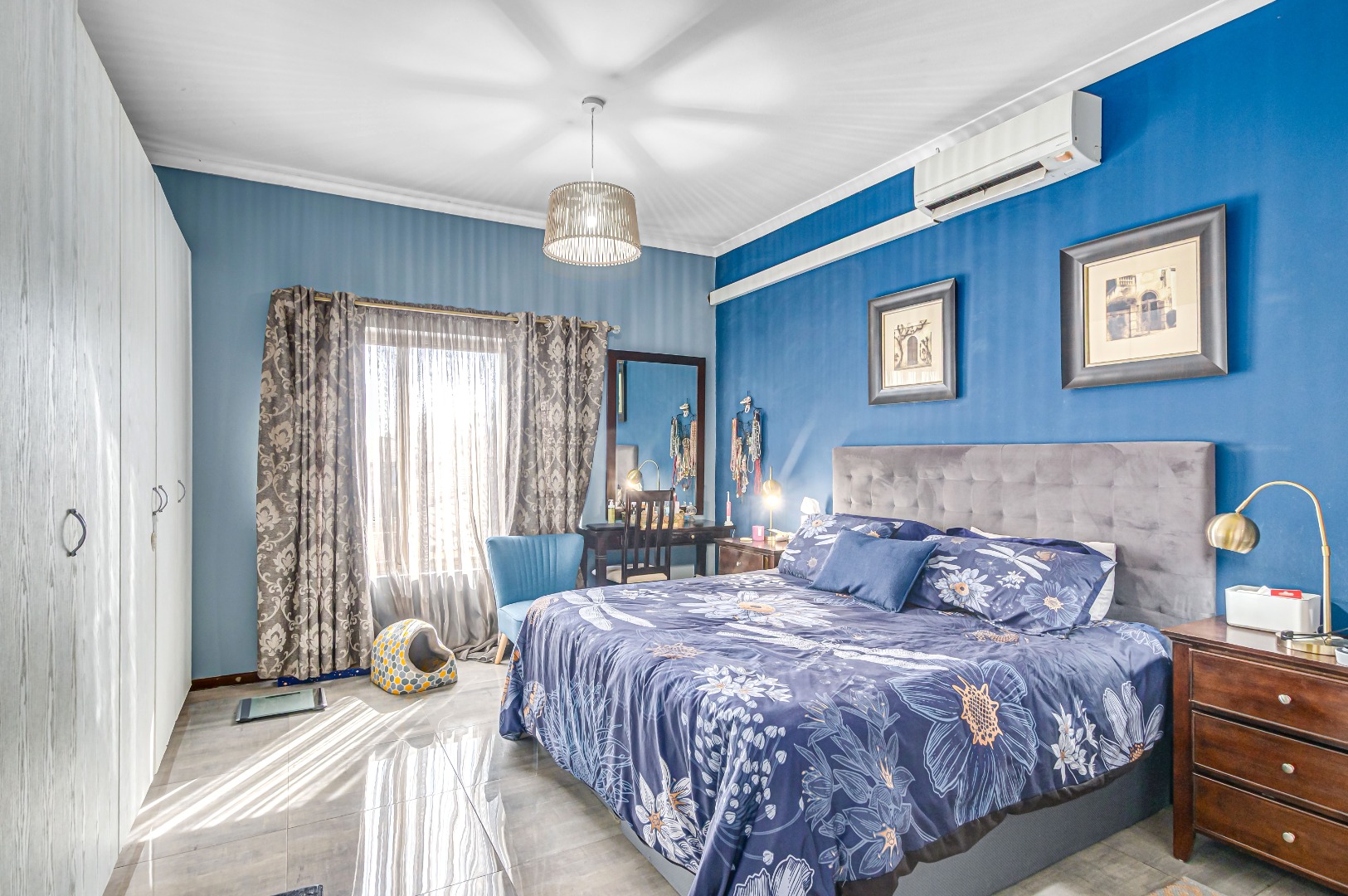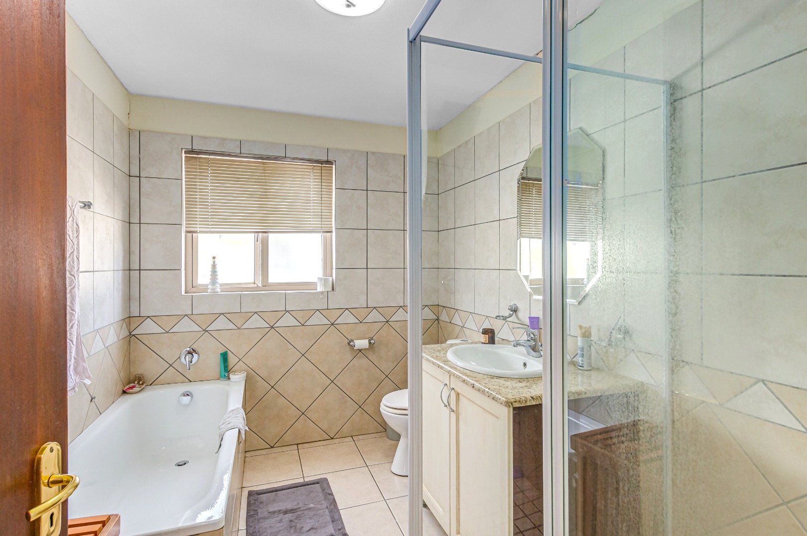 The main bedroom is tiled and spacious, featuring an air conditioner, abundant cupboard space, and curtain rails. Its full en-suite bathroom includes a bath, shower, his-and-hers basins, and toilet.
