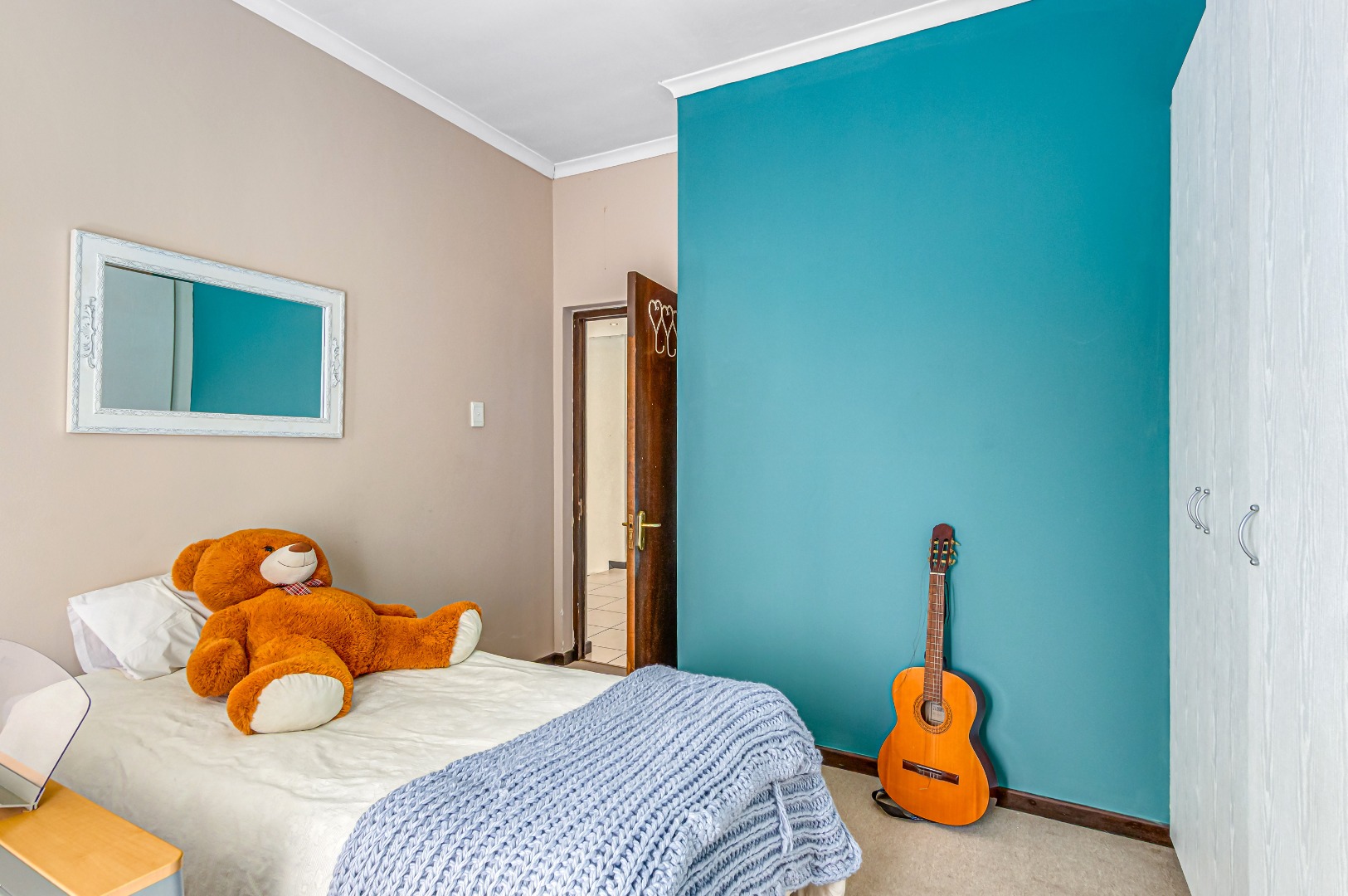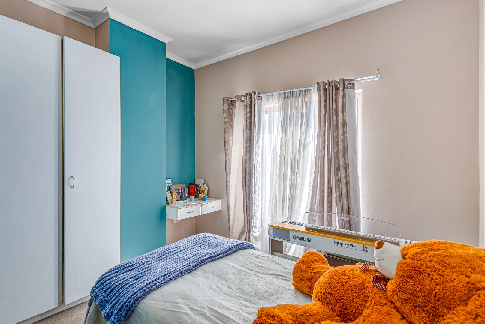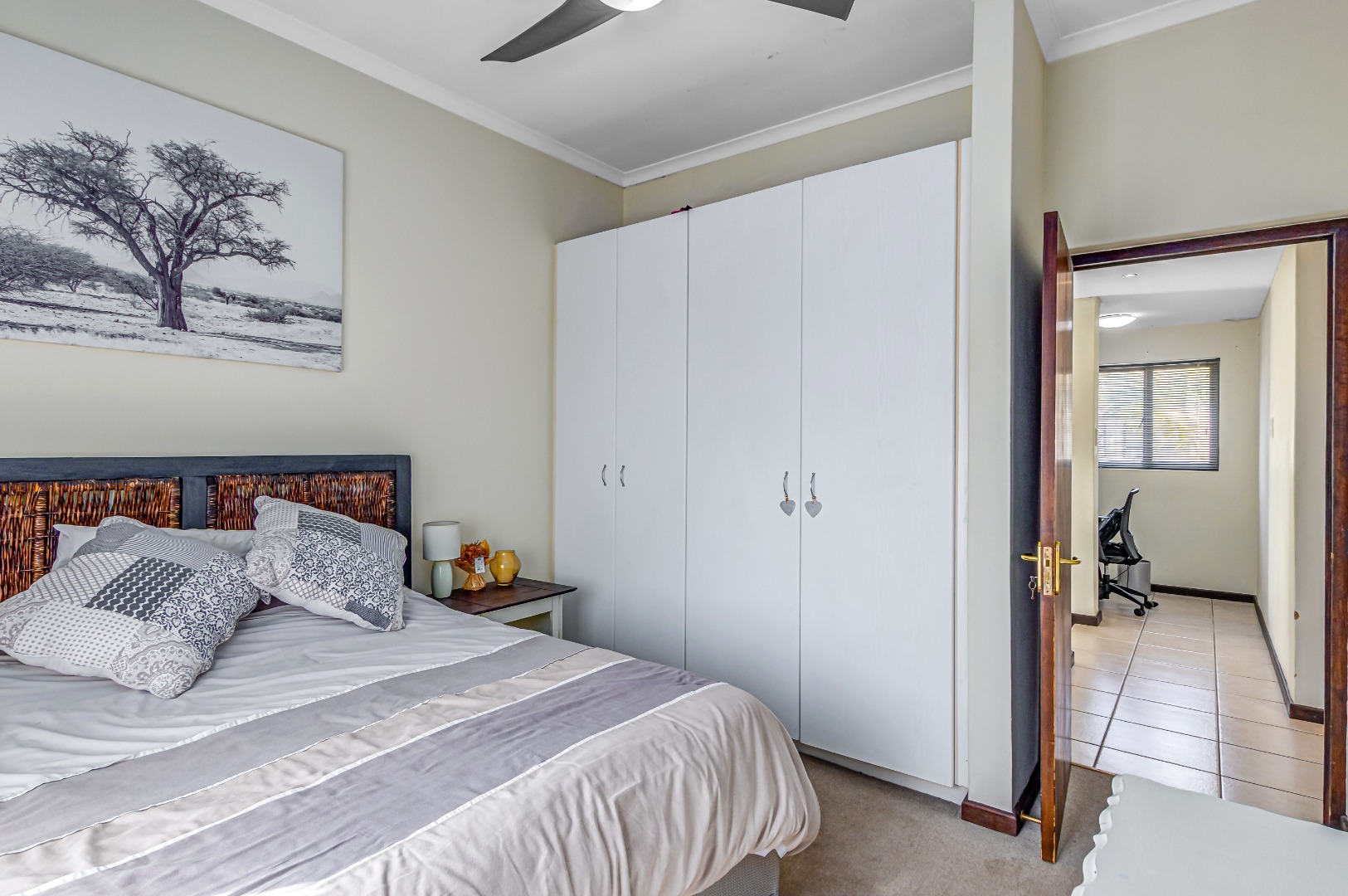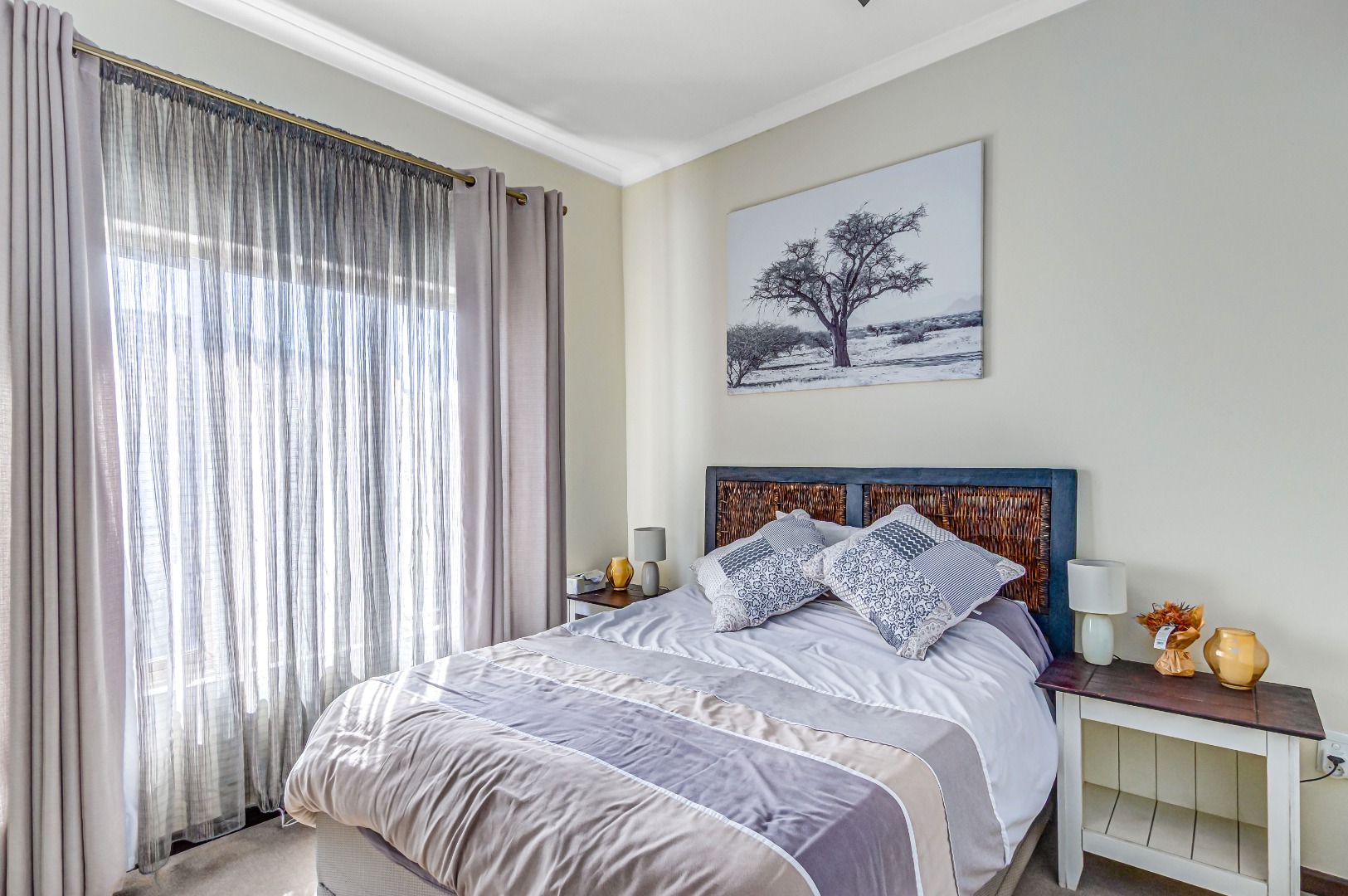 The main bedroom is tiled and spacious, featuring an air conditioner, abundant cupboard space, and curtain rails. Its full en-suite bathroom includes a bath, shower, his-and-hers basins, and toilet.