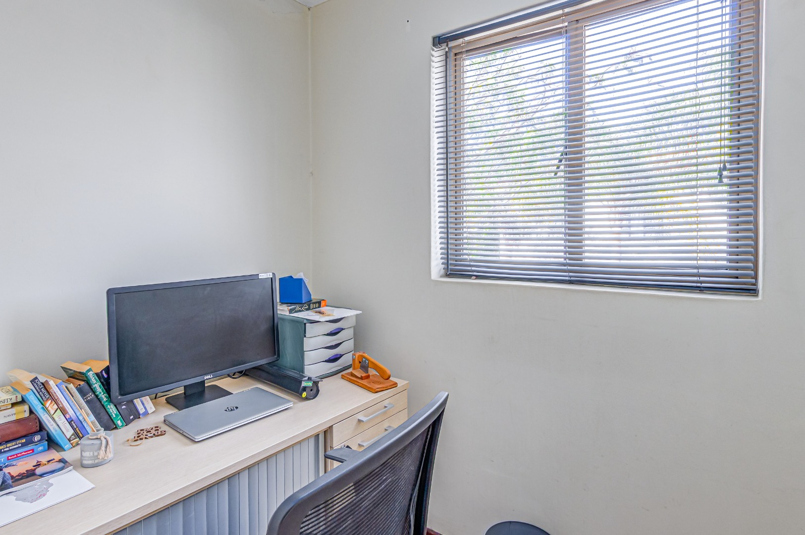 Upstairs, a compact study nook is located on the landing, with a passage fitted with linen cupboards. Two carpeted bedrooms, each with built-in cupboards, and curtain rails, share a full family bathroom with bath, shower, basin, and toilet.