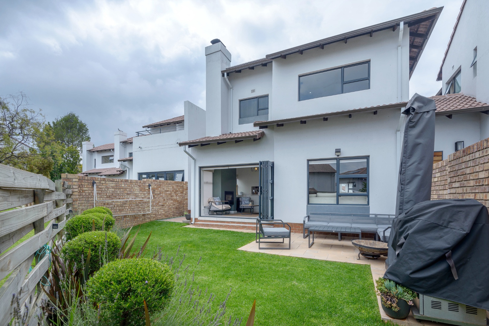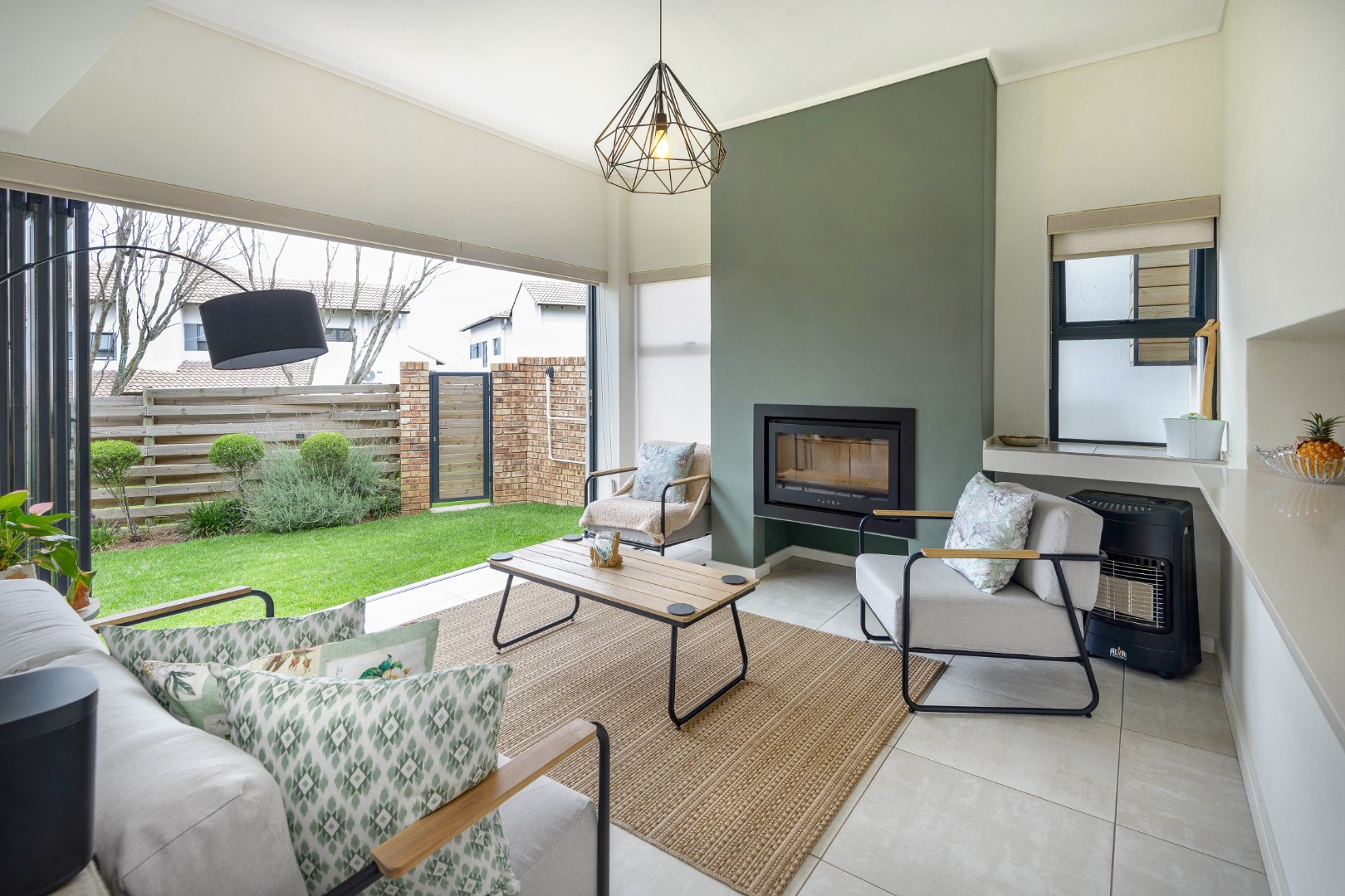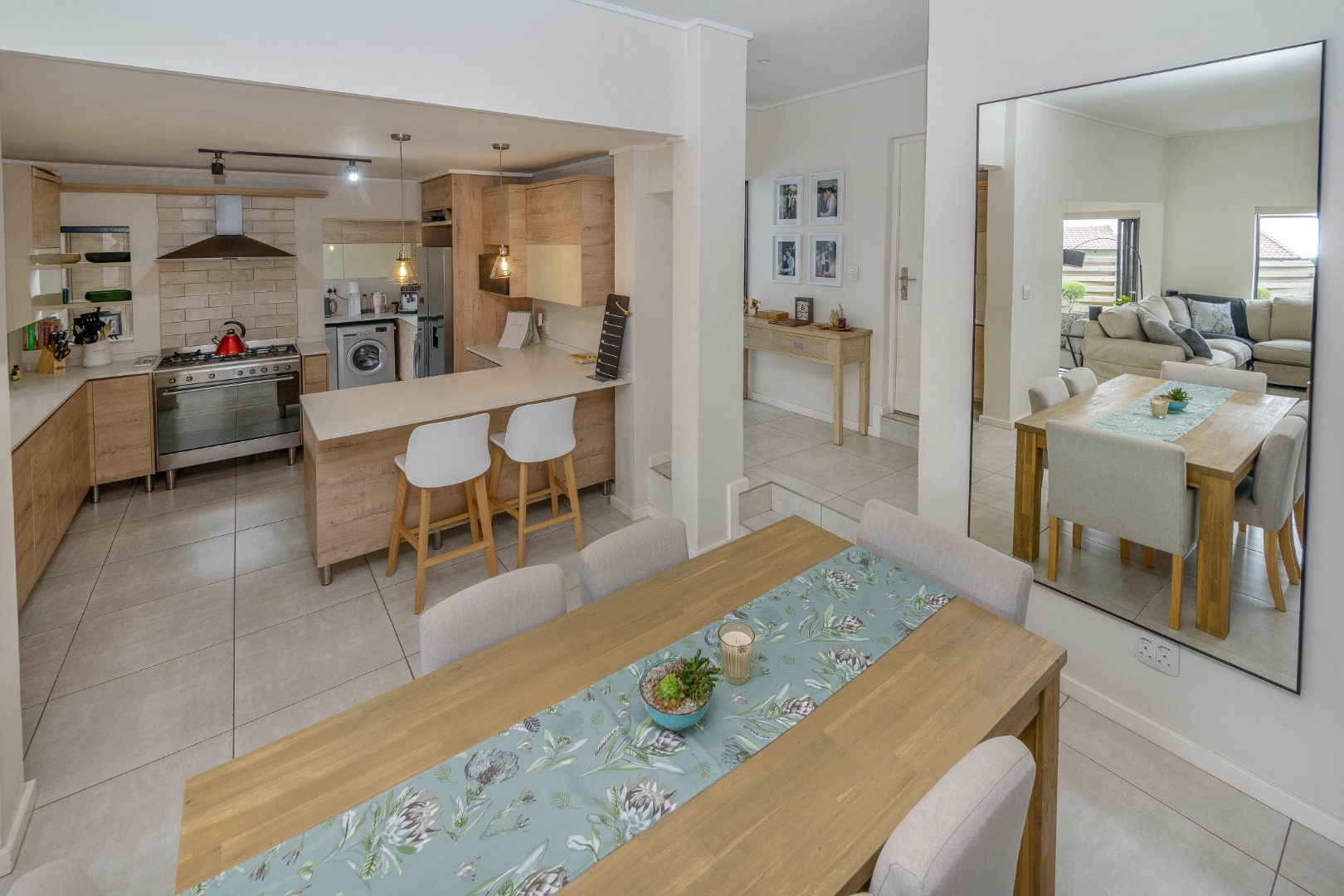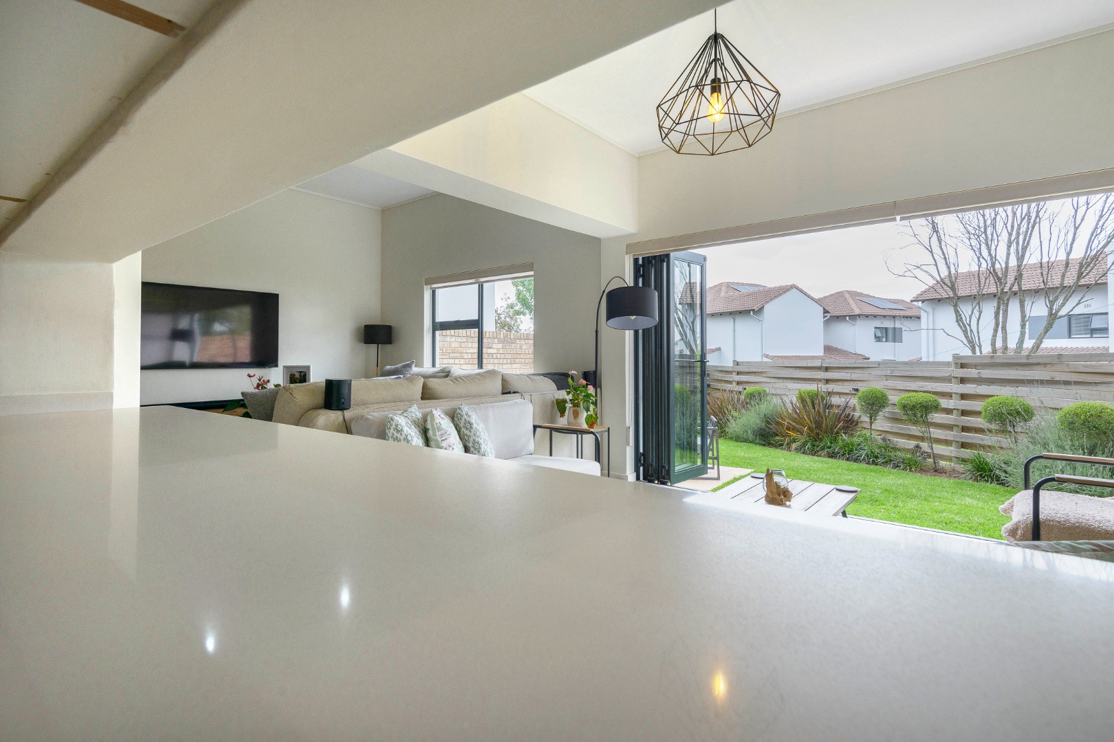 The open-plan layout includes a bright lounge, dining area, entertainment room, and a sleek kitchen with soft-close cupboards and a gas oven and stove. Stacking doors open to a private, low-maintenance garden.