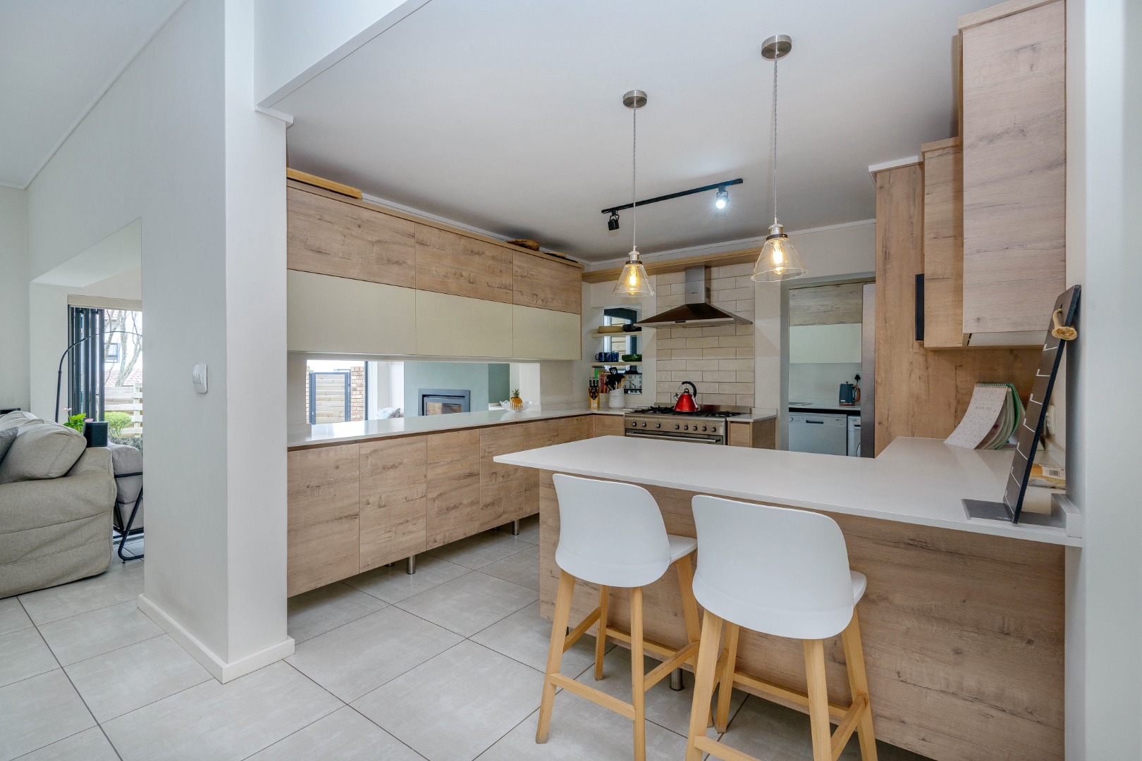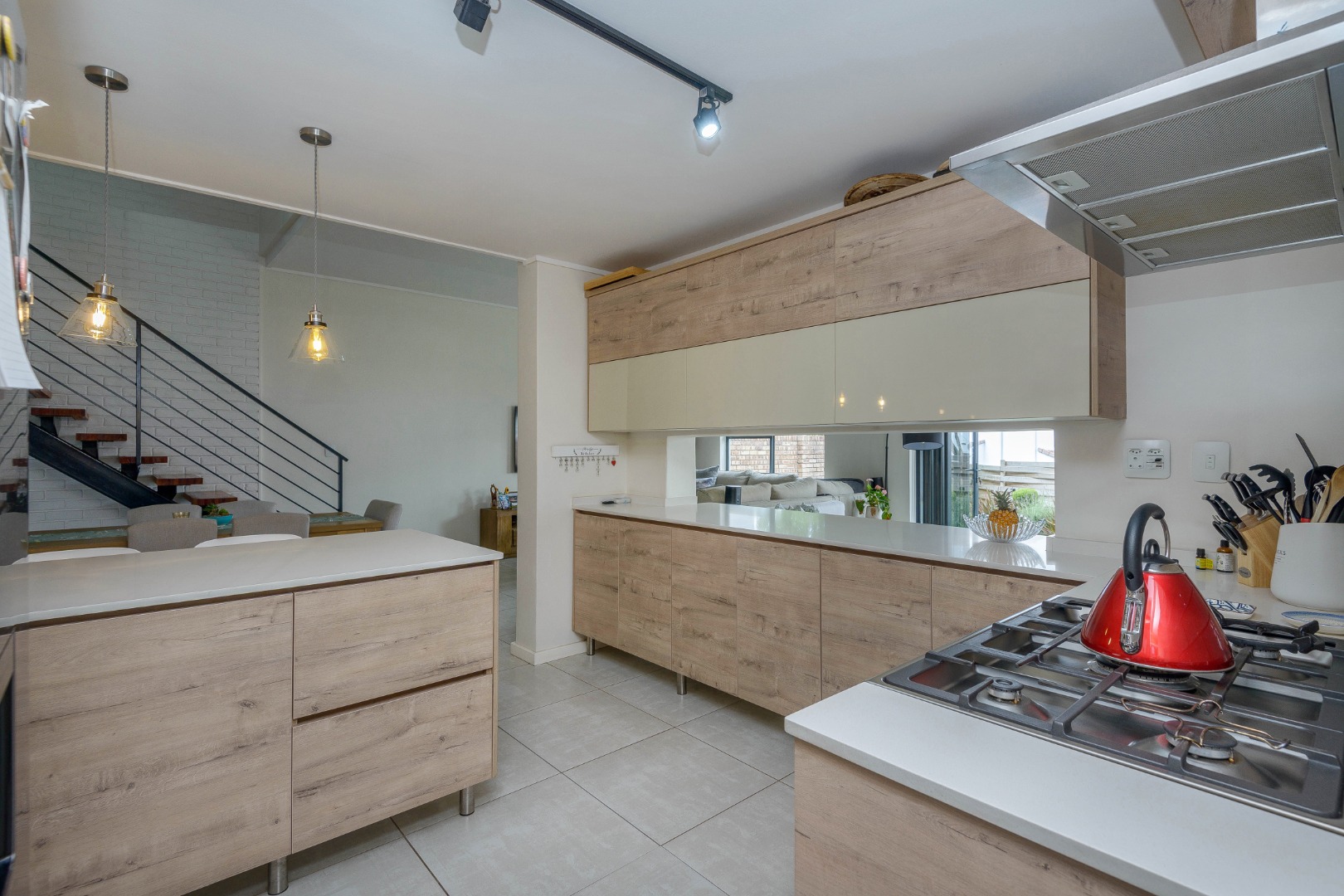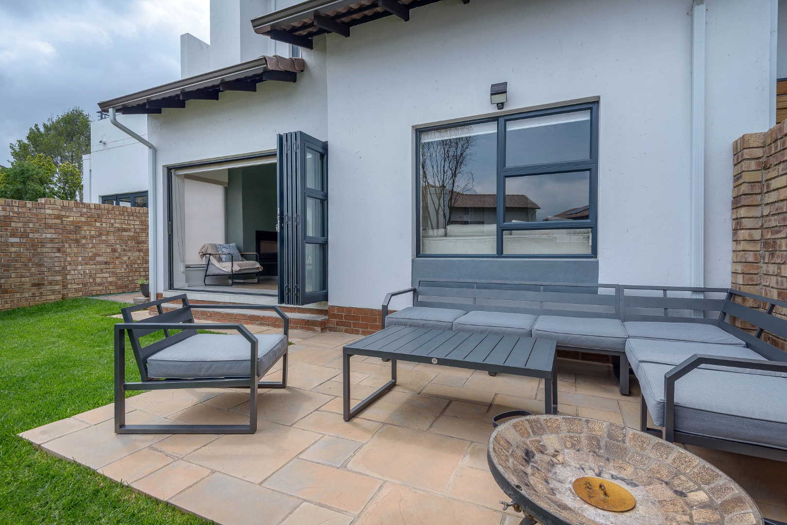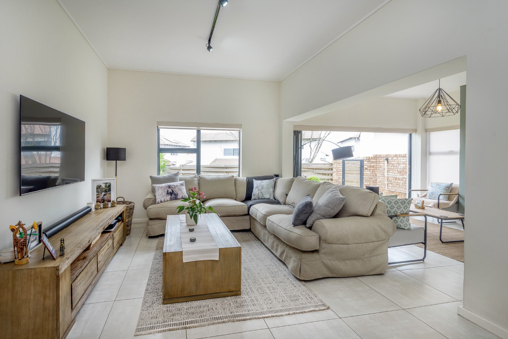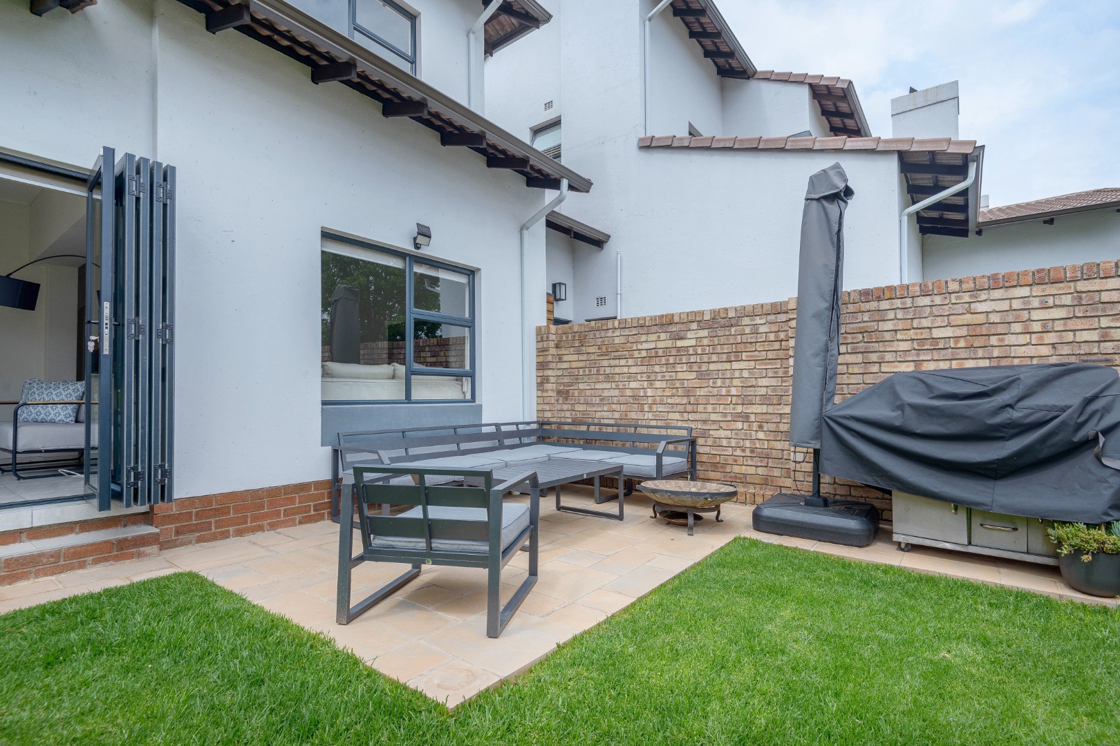 The open-plan layout includes a bright lounge, dining area, entertainment room, and a sleek kitchen with soft-close cupboards and a gas oven and stove. Stacking doors open to a private, low-maintenance garden.