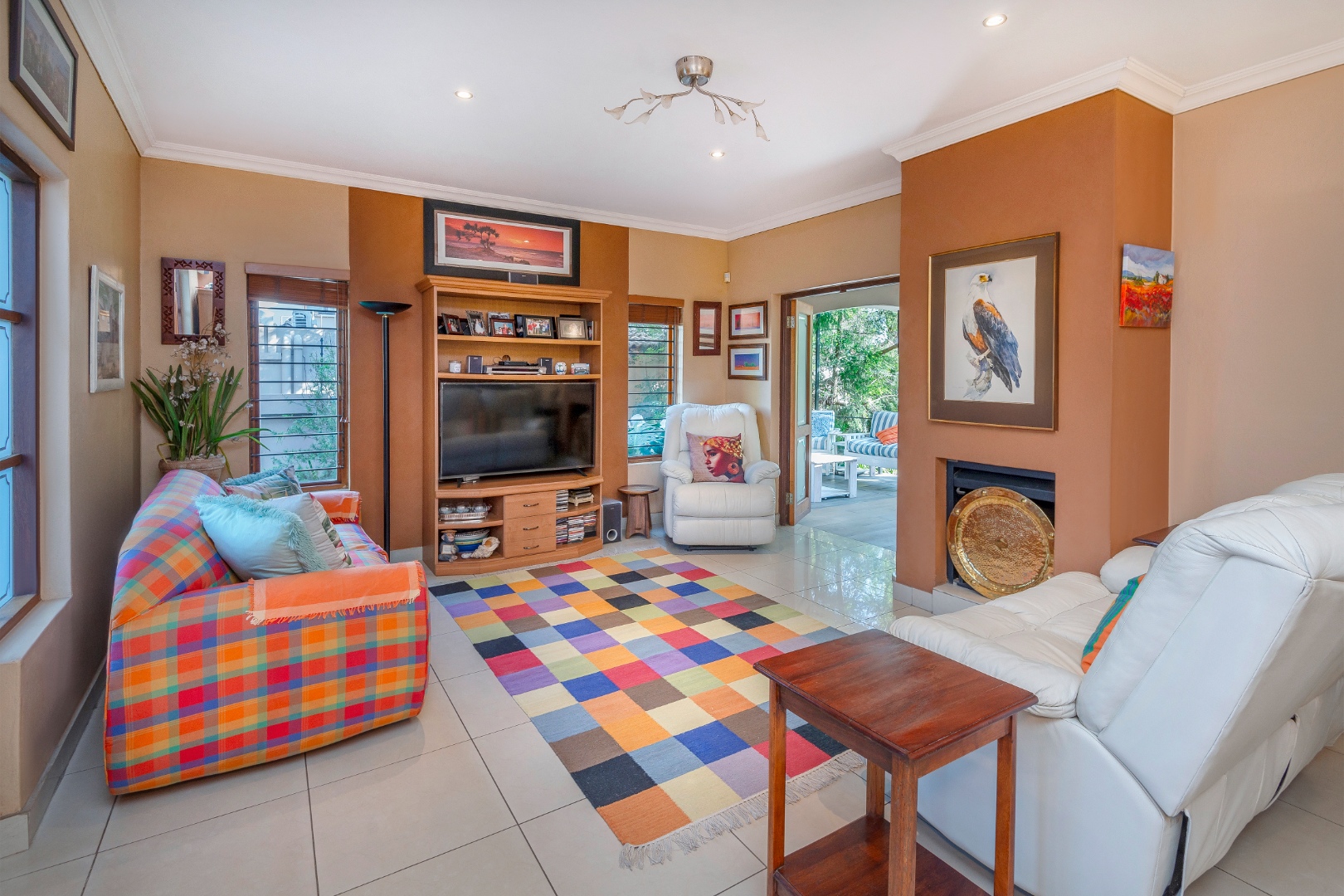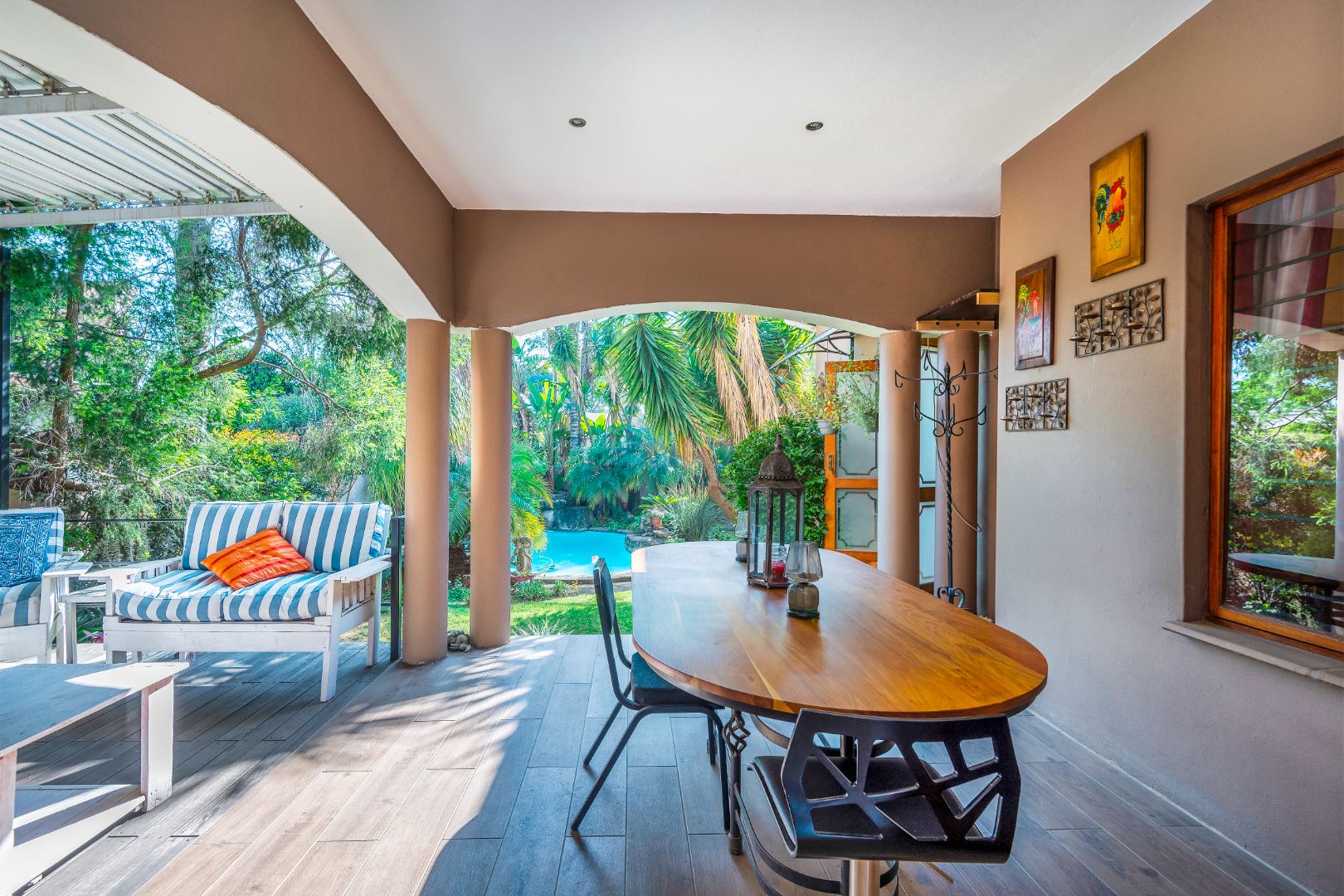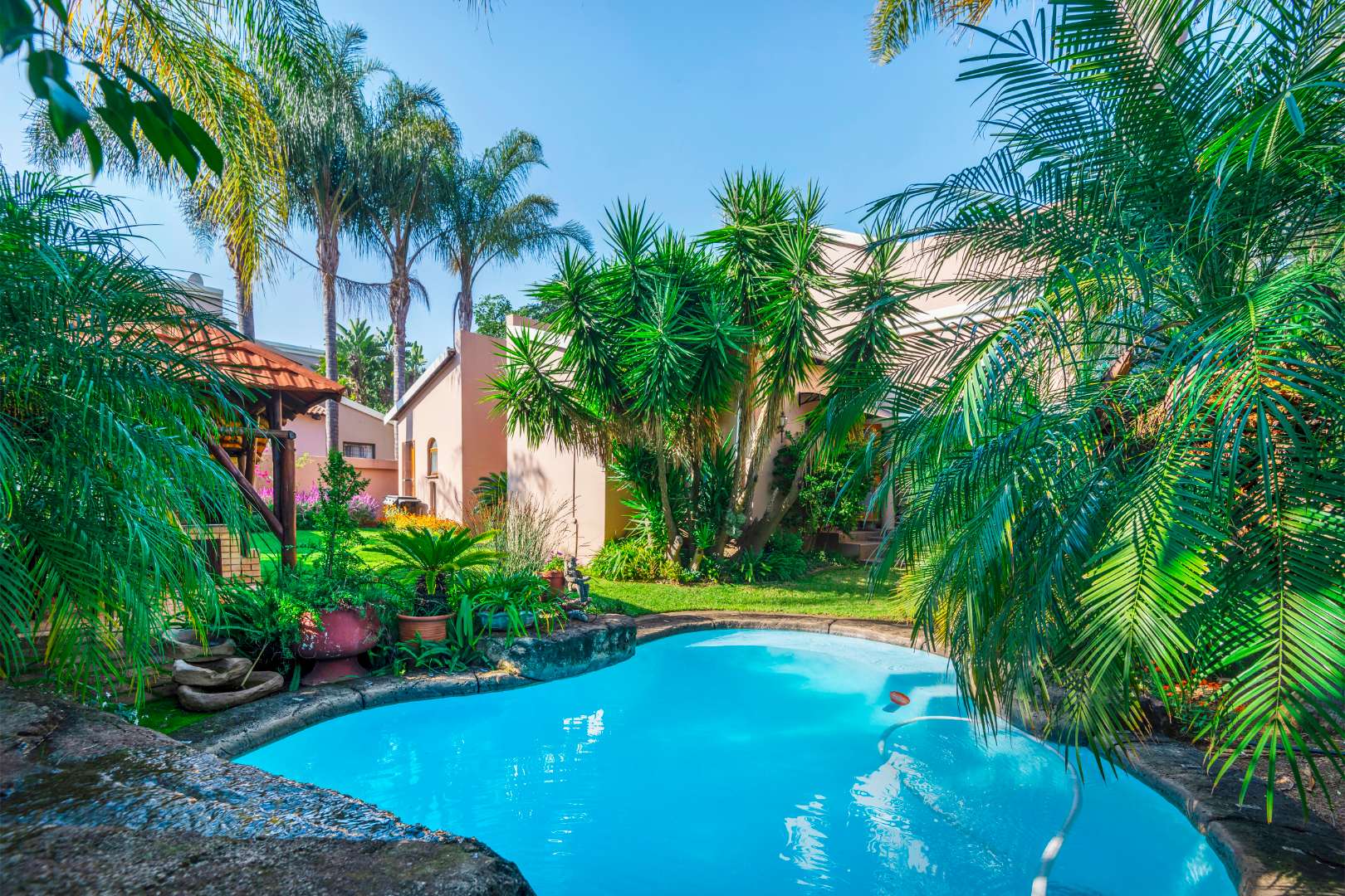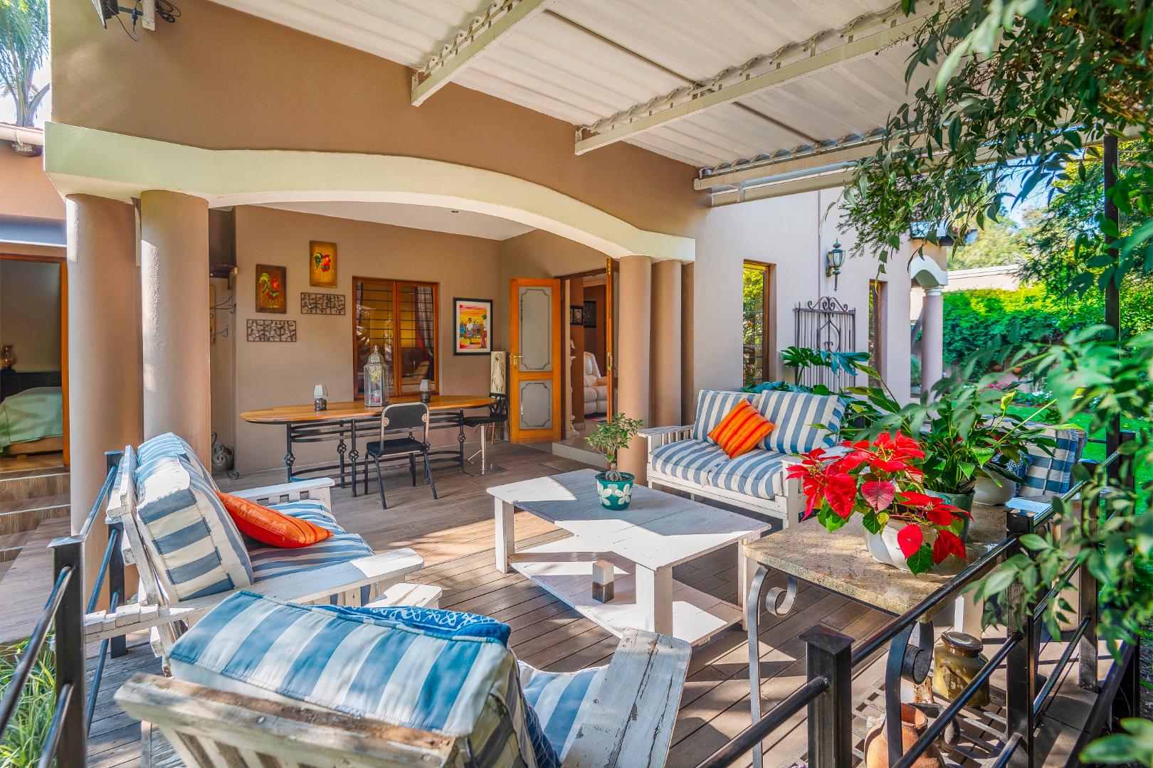 Step outside to a generously sized covered patio, where you can unwind and enjoy the peaceful surroundings. Beyond lies a magnificent, landscaped garden, meticulously maintained and bursting with natural beauty. It features a sparkling blue rock pool and a built-in braai with an outdoor entertainment area—perfect for embracing outdoor living at its finest.