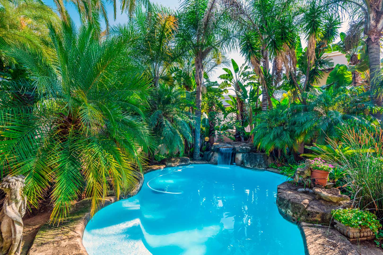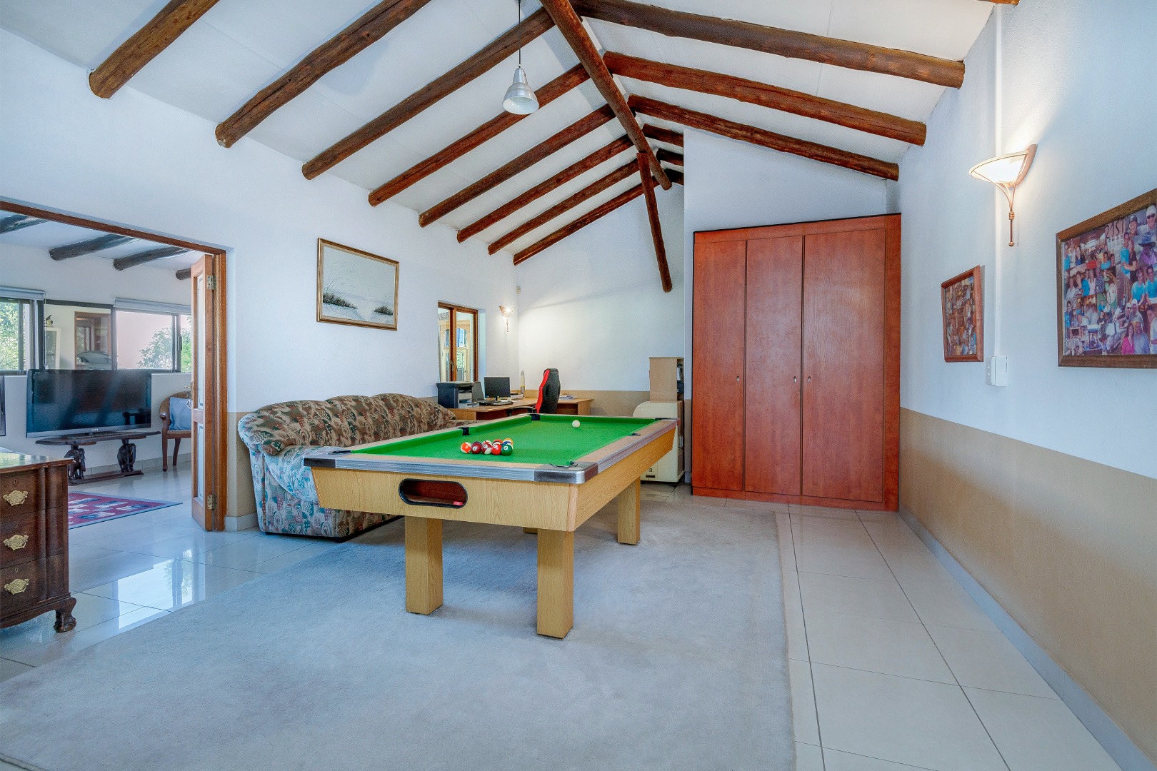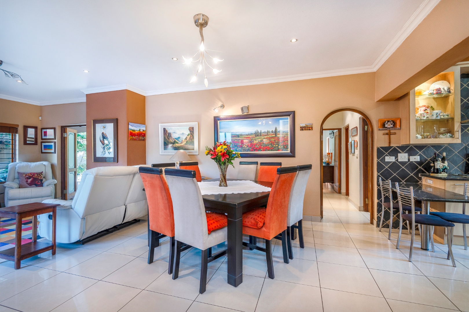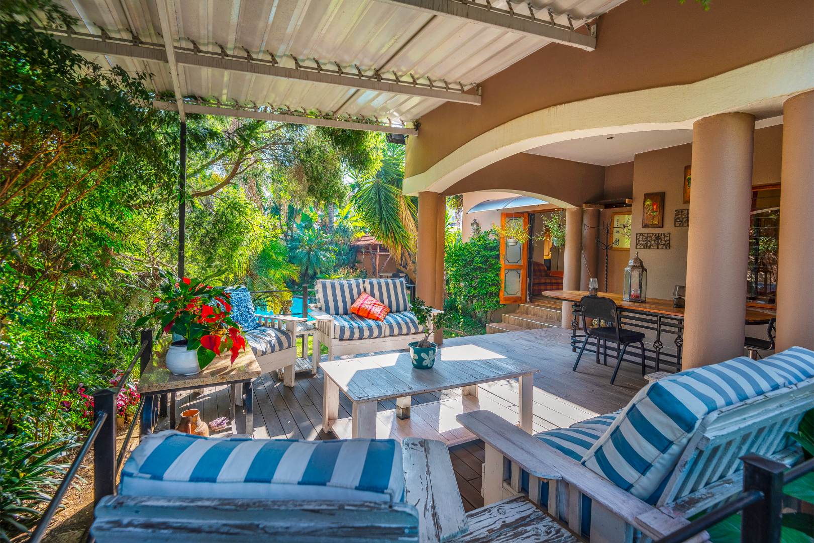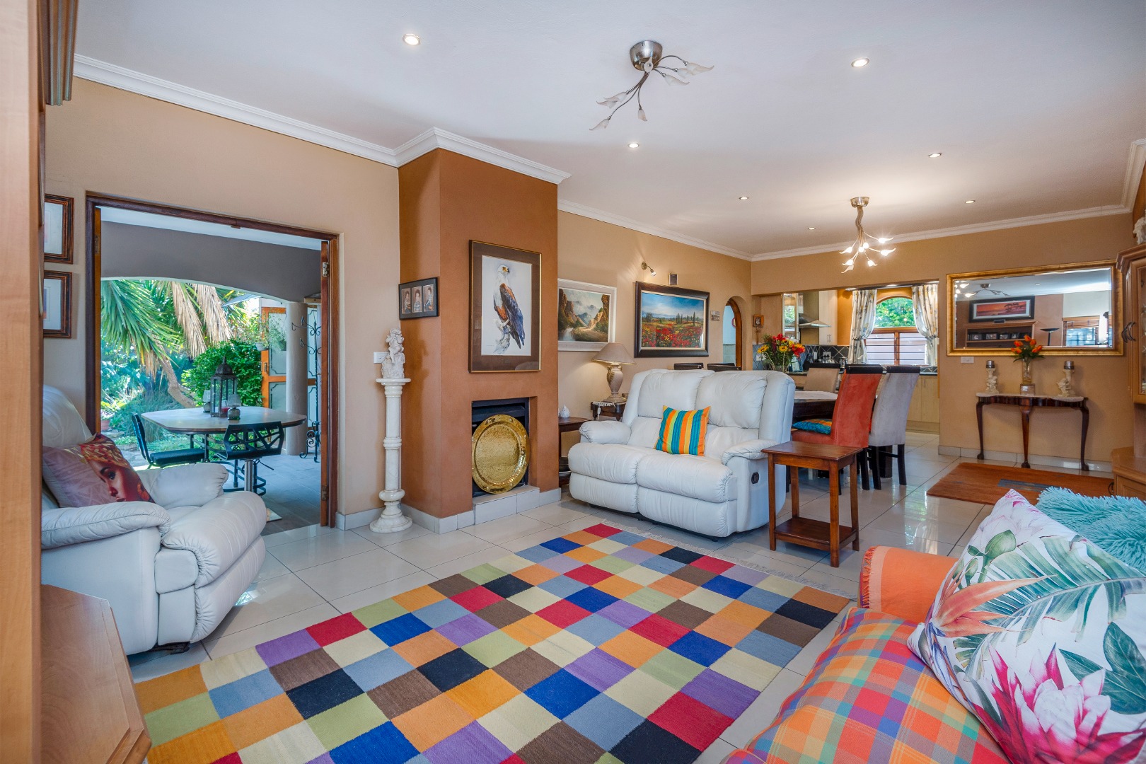 Step outside to a generously sized covered patio, where you can unwind and enjoy the peaceful surroundings. Beyond lies a magnificent, landscaped garden, meticulously maintained and bursting with natural beauty. It features a sparkling blue rock pool and a built-in braai with an outdoor entertainment area—perfect for embracing outdoor living at its finest.