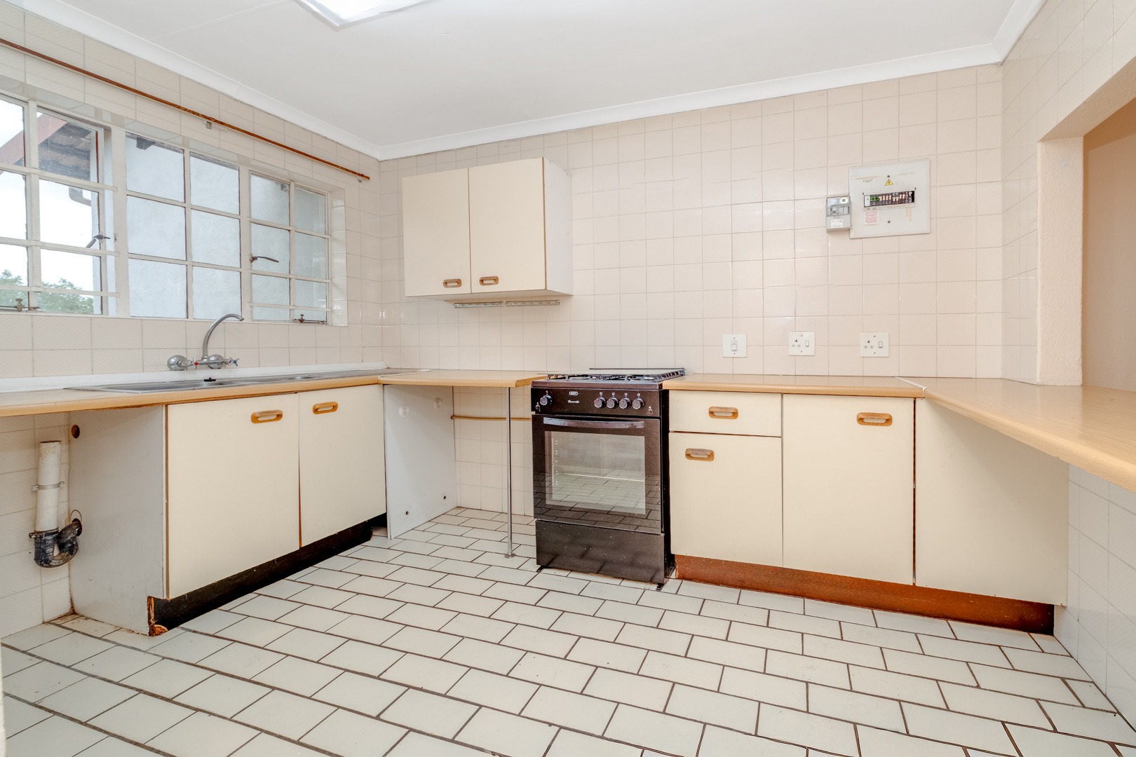 The functional kitchen, while featuring a dated aesthetic (which is an easy fix), offers ample storage with cream-colored cabinetry and practical wooden countertops. It is equipped with a double sink positioned under a large window, a freestanding oven/stove, and space for an integrated dishwasher, ensuring convenience for meal preparation. Tiled walls and floors make for easy cleaning and maintenance.