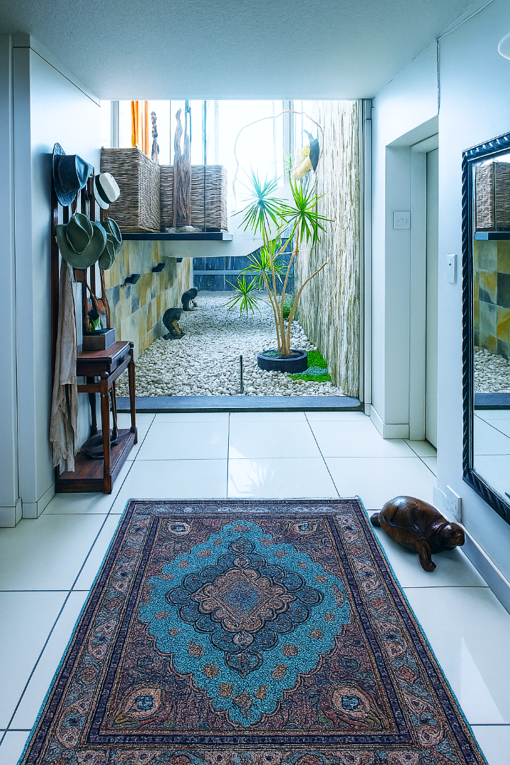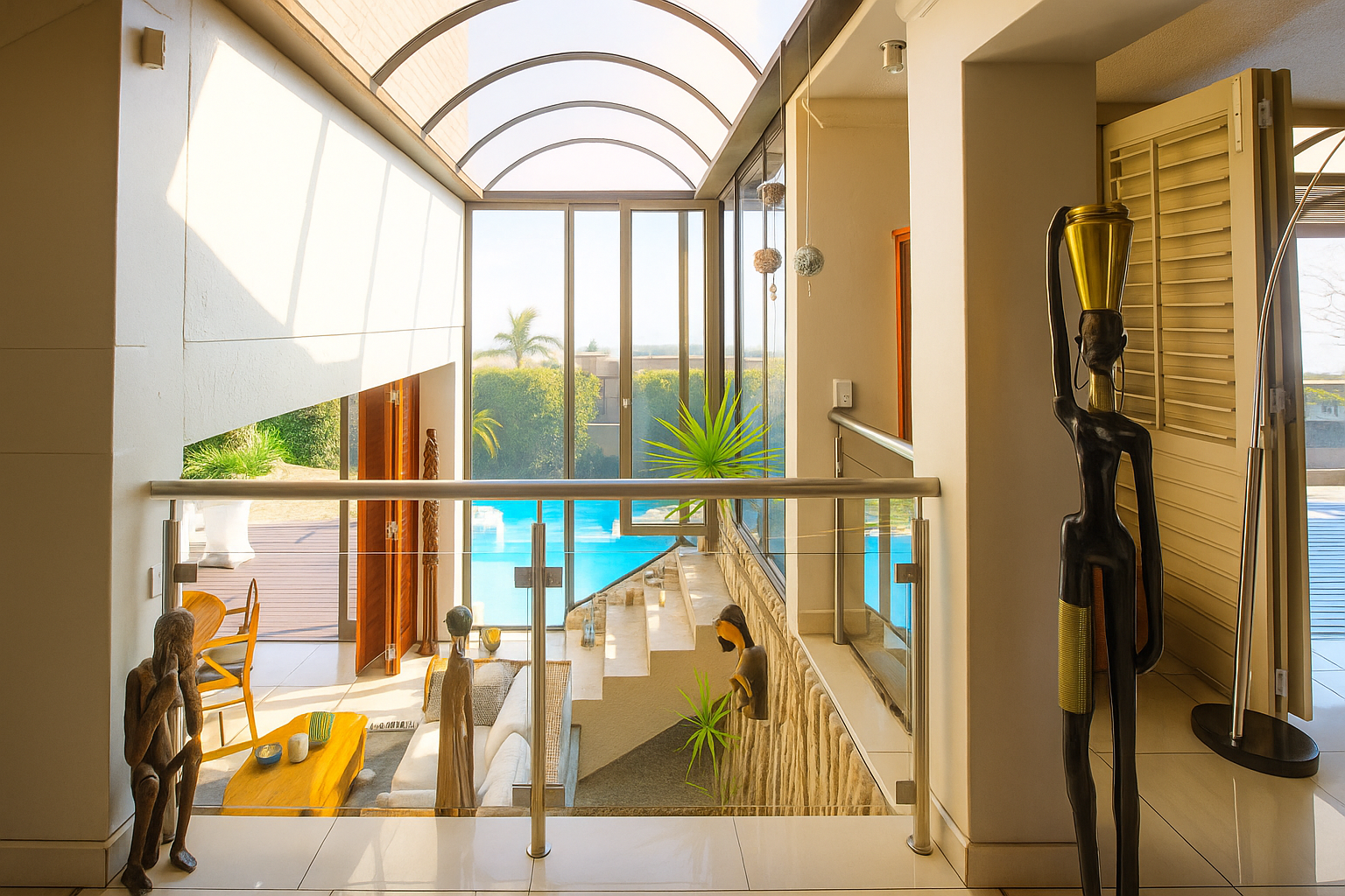 Be greeted by a dramatic entrance featuring an oversized pivot door that opens into a striking atrium crowned with a glass dome, casting natural light over a stunning stone feature wall. This space immediately sets the tone for the unique design and tranquil ambiance that flows throughout the home.