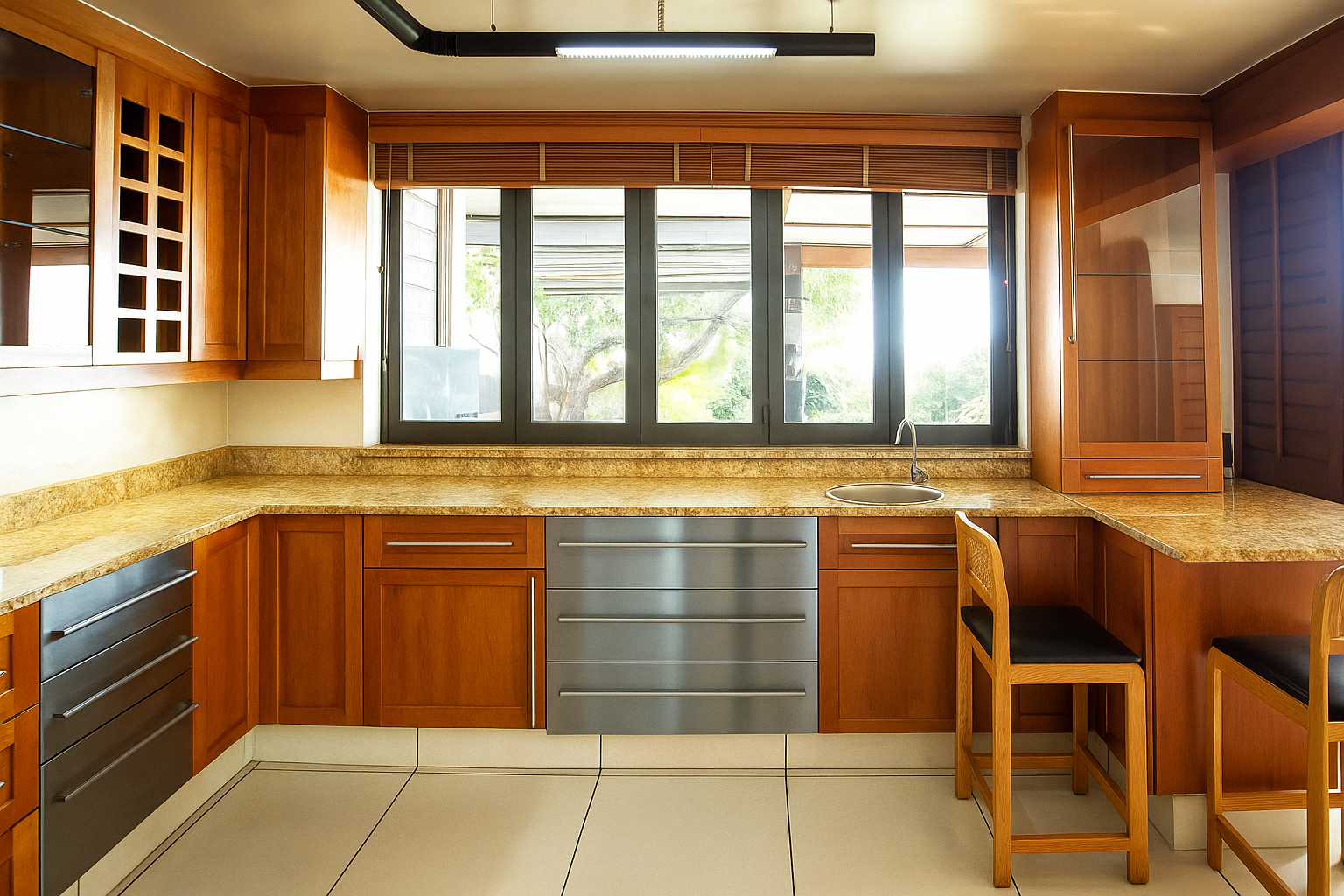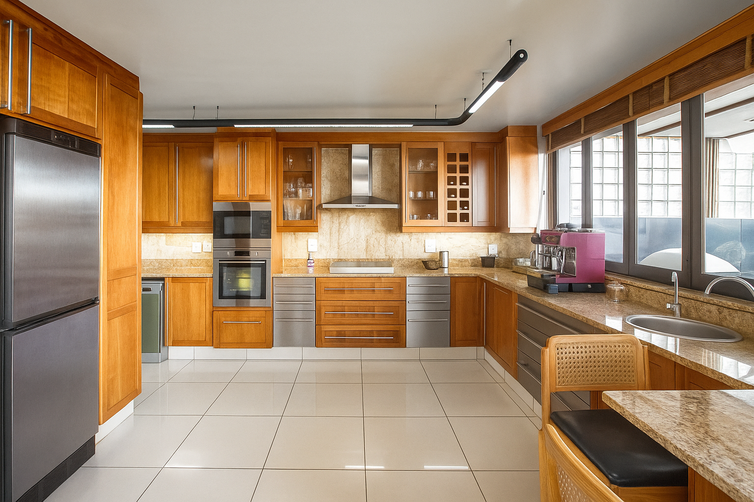 Expansive, farm-style open-plan kitchen fitted with a double eye-level oven, scullery, space for a double-door fridge, and lots of cupboard space— ideal for family gatherings and gourmet cooking.