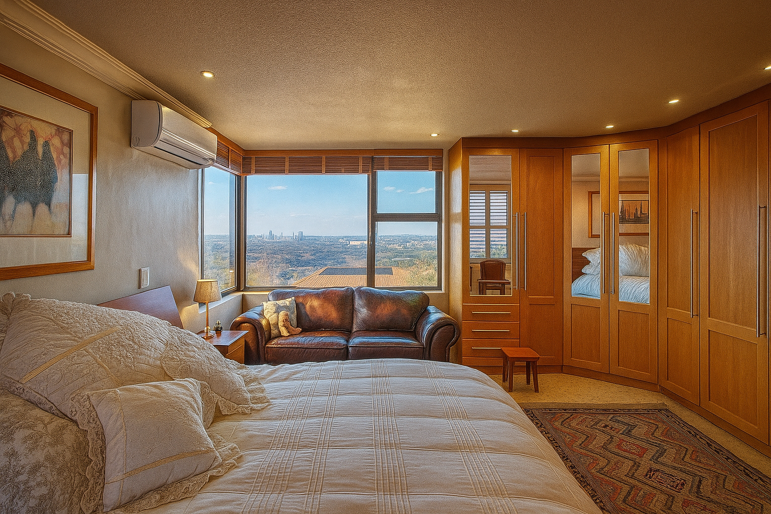 The luxurious main bedroom features soft carpeting, generous cupboard space, and expansive windows with wooden blinds, creating the ultimate retreat. The en-suite bathroom is fitted with a large soaking tub and walk-in shower for a spa-like experience.