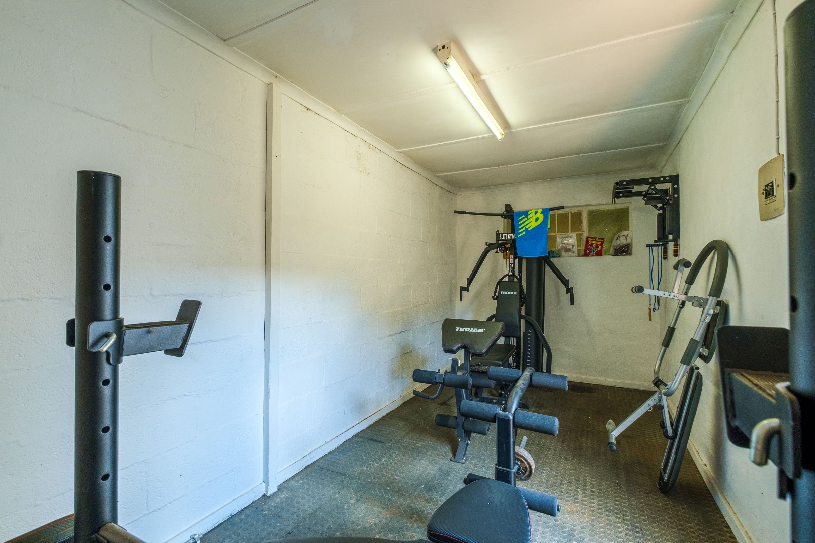 Additional features include a double garage, staff quarters, and a versatile storage room currently utilized as a gym.