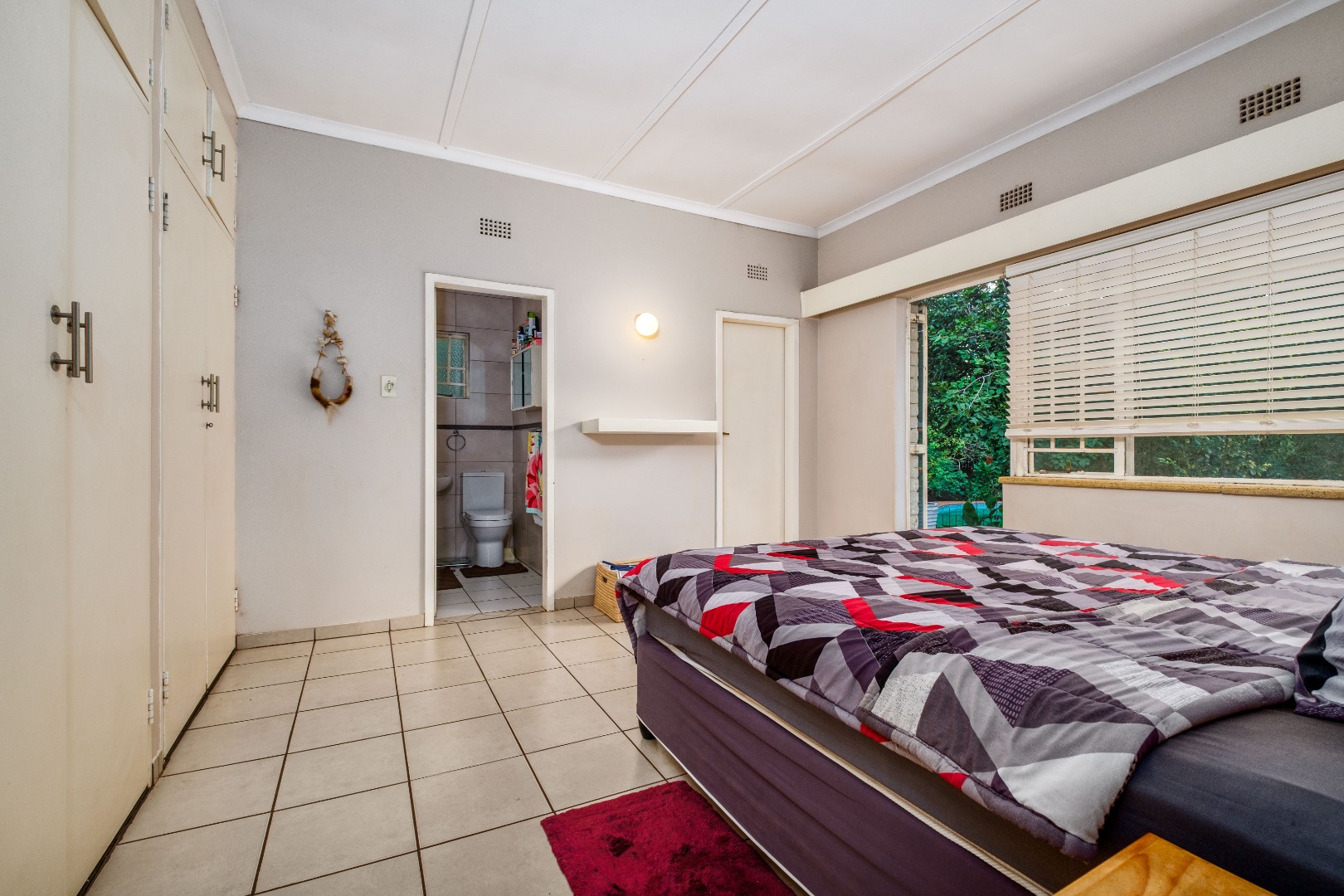 A passage leads to three spacious bedrooms and two bathrooms. The main bedroom boasts an en-suite bathroom and opens out directly into the lush garden, offering a peaceful retreat. One of the additional bathrooms includes a separate toilet for added convenience.