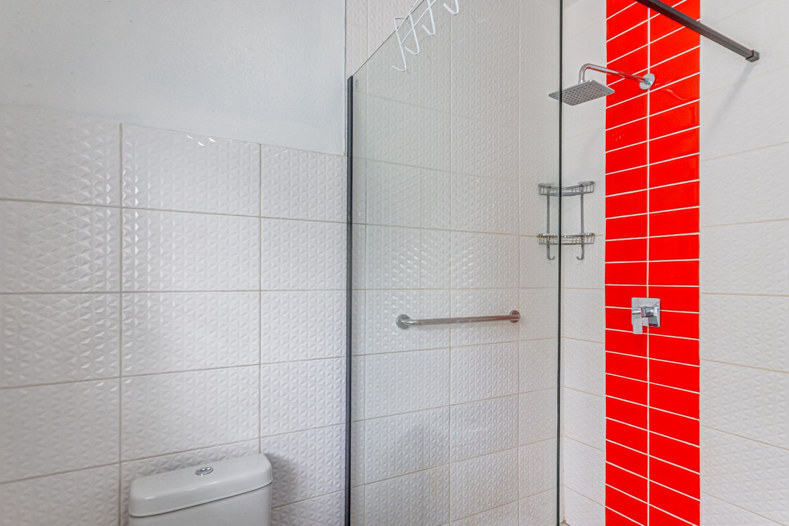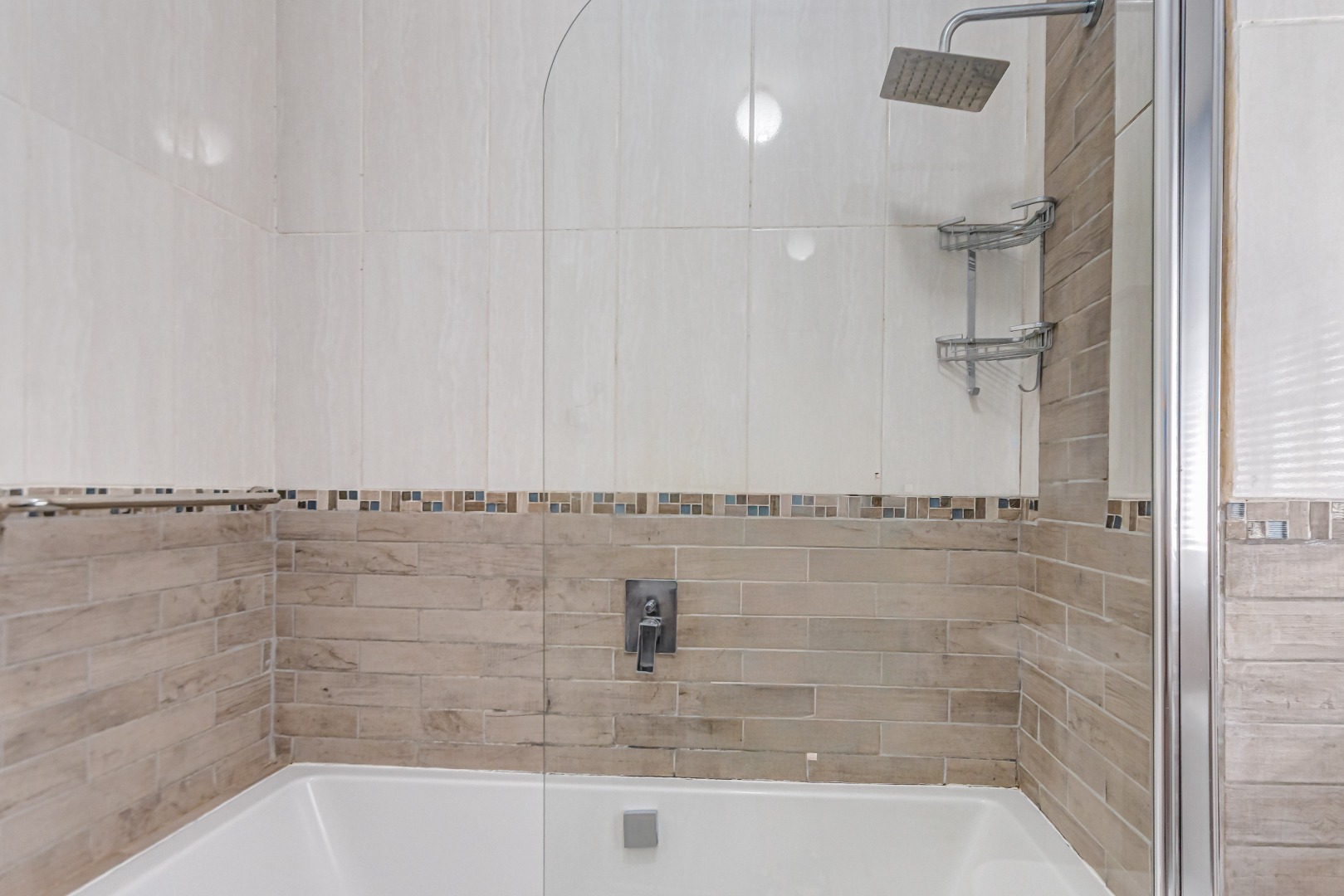 The property includes two well-proportioned bedrooms and two bathrooms, one of which boasts a shower-over-bath with a modern rainfall showerhead and full tiling for easy maintenance. Built-in cupboards offer practical storage solutions.