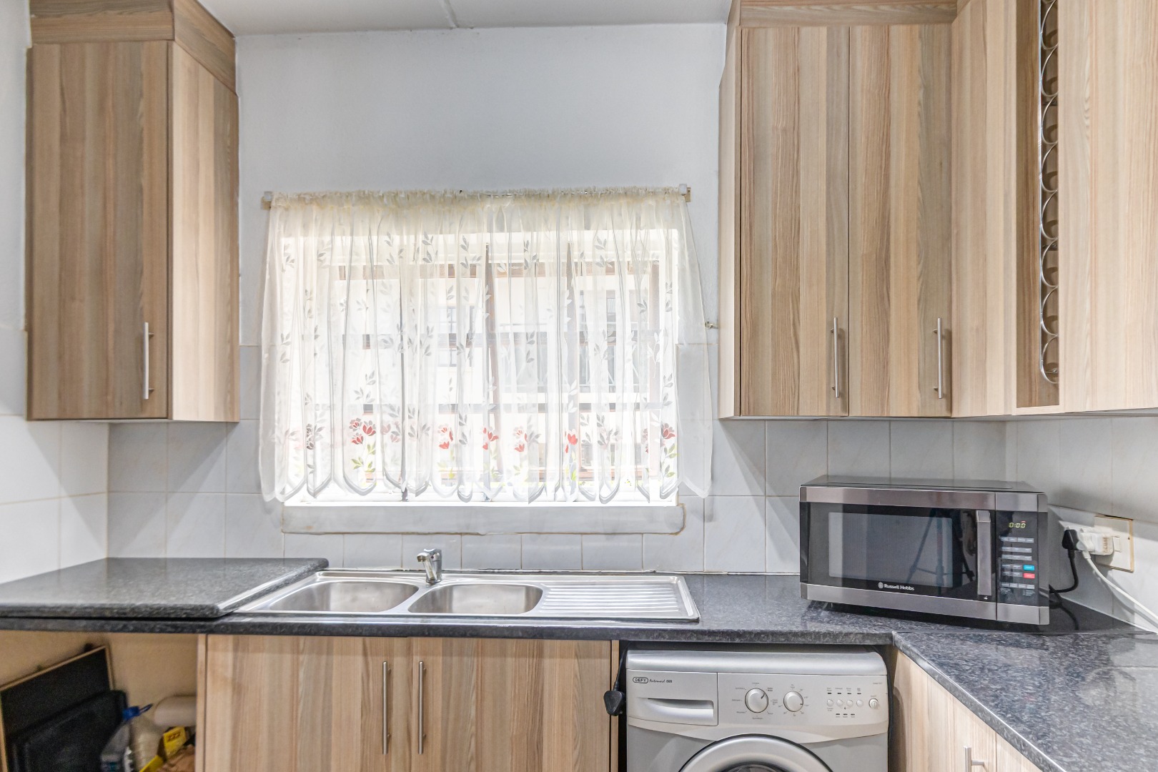 This inviting 2-bedroom, 2-bathroom residence offers comfortable living within a secure complex in Northwold, Randburg. The open-plan living and dining area features neutral walls and light flooring, creating a bright and welcoming atmosphere. Large glass doors seamlessly connect the interior to an outdoor patio, enhancing the sense of space. The modern kitchen is well-appointed with light wood cabinetry, dark countertops, a double stainless steel sink, providing both style and functionality.